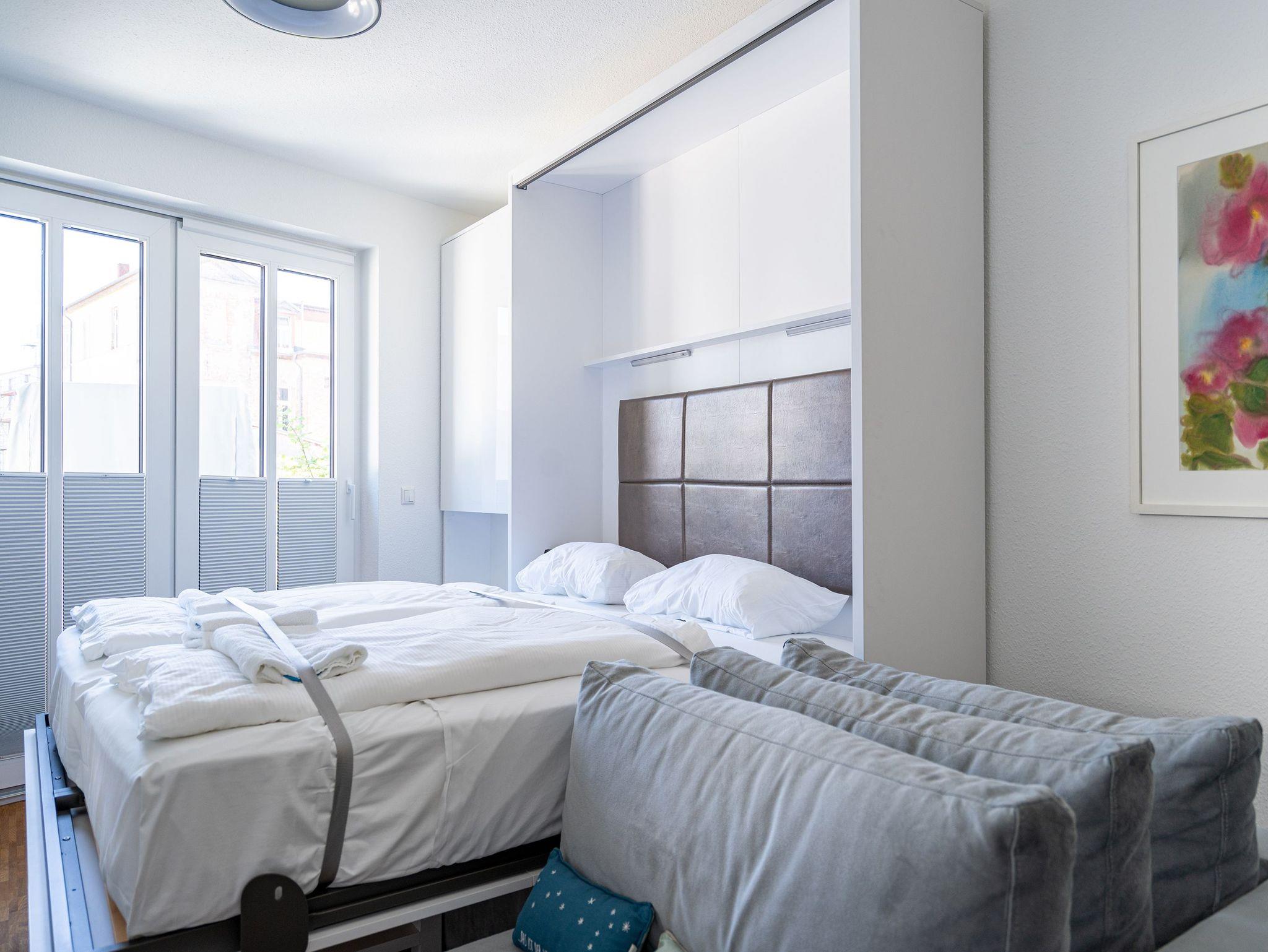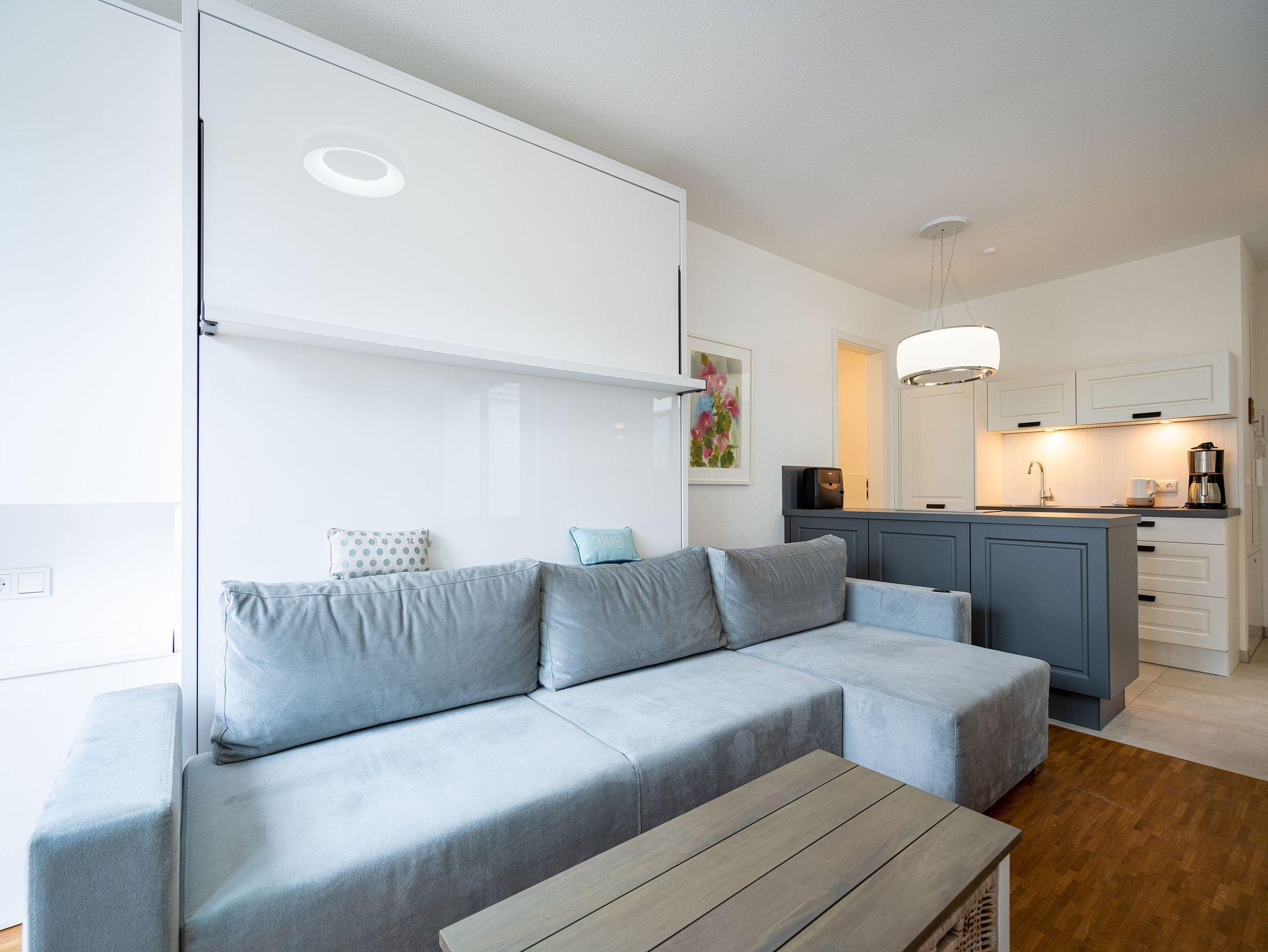 Klein aber fein! Willkommen in diesem durchdachten Appartement für maximal 2 Personen. Ob Aktivurlaub, Radreise oder Erholungsurlaub - das 27qm große Appartement im Erdgeschoss bietet Ihnen jeglichen Komfort. Über die Tiefgarage gelangen Sie bequem mit dem Aufzug in Ihre Etage. Im Appartement eignen Keller, der ebenfalls über die Tiefgarage zu erreichen ist, verstauen Sie mühelos Ihre Räder nach einer Radtour auf dem insgesamt 200 Kilometer langen Fahrradnetz der Insel Usedom. Knapp 300 Meter von Ihrer Haustür entfernt, befindet sich der Zugang zum feinen Sandstrand. Hier können Sie sowohl im Strandkorb (Vermietung linksseitig der Seebrücke) als auch an den umliegenden Strandbars und Restaurants oder direkt auf der Seebrücke Ahlbeck das Flair der Sonneninsel Usedom genießen. Genügend Freiraum zum Entspannen bietet zudem die Nord-Ost-Terrasse mit Strandkorb. Einen Stadtbummel im Kaiserbad können Sie bequem fußläufig erledigen, da sich Geschäfte, Restaurants und Einkaufsmöglichkeiten sowie ein Bäcker nur 150m entfernt befinden. Trotz der Nähe zum Ortskern liegt das Appartement zentral und doch ruhig in einer Seitenstraße. Ein Highlight des Feriendomizils ist die Vielseitigkeit. Nach einem entspannten Abend vor dem Flat-TV, lässt sich das Wohnzimmer über ein Klappbett (1,80 x 2,00m) in ein gemütliches Schlafzimmer verwandeln. Gleich nebenan befindet sich die moderne Küche mit hochwertigen Elektrogeräten. Hier brauchen Sie auf keinen Komfort beim Zubereiten Ihrer Speisen verzichten. Ein Backofen mit integrierter Mikrowelle sowie ein Induktionskochfeld sind bequem über eine Kochinsel zugänglich. Kühlschrank (mit Gefrierfach), Spülmaschine und Kleinküchengeräte runden den Küchenbereich ab. Ein kleiner Essplatz gegenüber lädt zum gemeinsamen Speisen ein. Das angrenzende Bad mit Dusche, Waschtisch und WC verfügt über ausreichend Ablage für Ihre Hygieneartikel. Kostenfreies W-Lan sowie ein eigener Stellplatz in der Tiefgarage runden Ihren Usedomurlaub in diesem Appartement ab. Bei Ihrer Ankunft sind die Betten bereits bezogen und Handtücher liegen für Sie bereit.