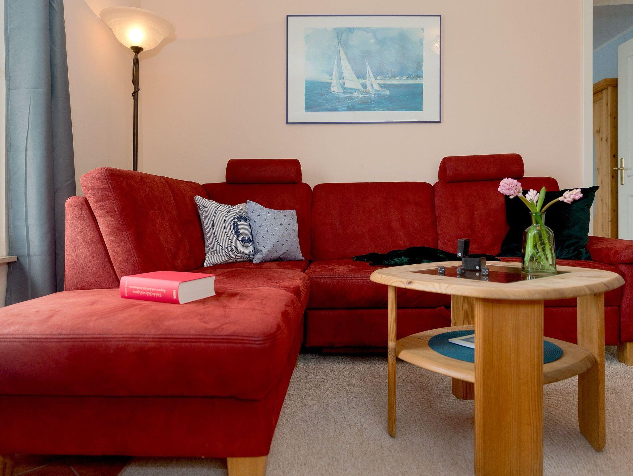 Der helle Wohnraum verfügt über einen kombinierten Wohn- Koch und Essbereich mit offener komplett eingerichteter Küche (Ceranfeld, Geschirrspüler, Kühlschrank mit Gefrierfach, Mikrowelle, Kaffeemaschine, Wasserkocher, und Toaster). Das bequeme Sofa im Wohnzimmer ist der ideale Rückzugsort nach einem erfrischenden Spaziergang an der Ostsee oder der Promenade und dient gleichzeitig als Schlafmöglichkeit (200 x 200cm) für die dritte Person. Ein Flat TV rundet hier den Komfort ab.