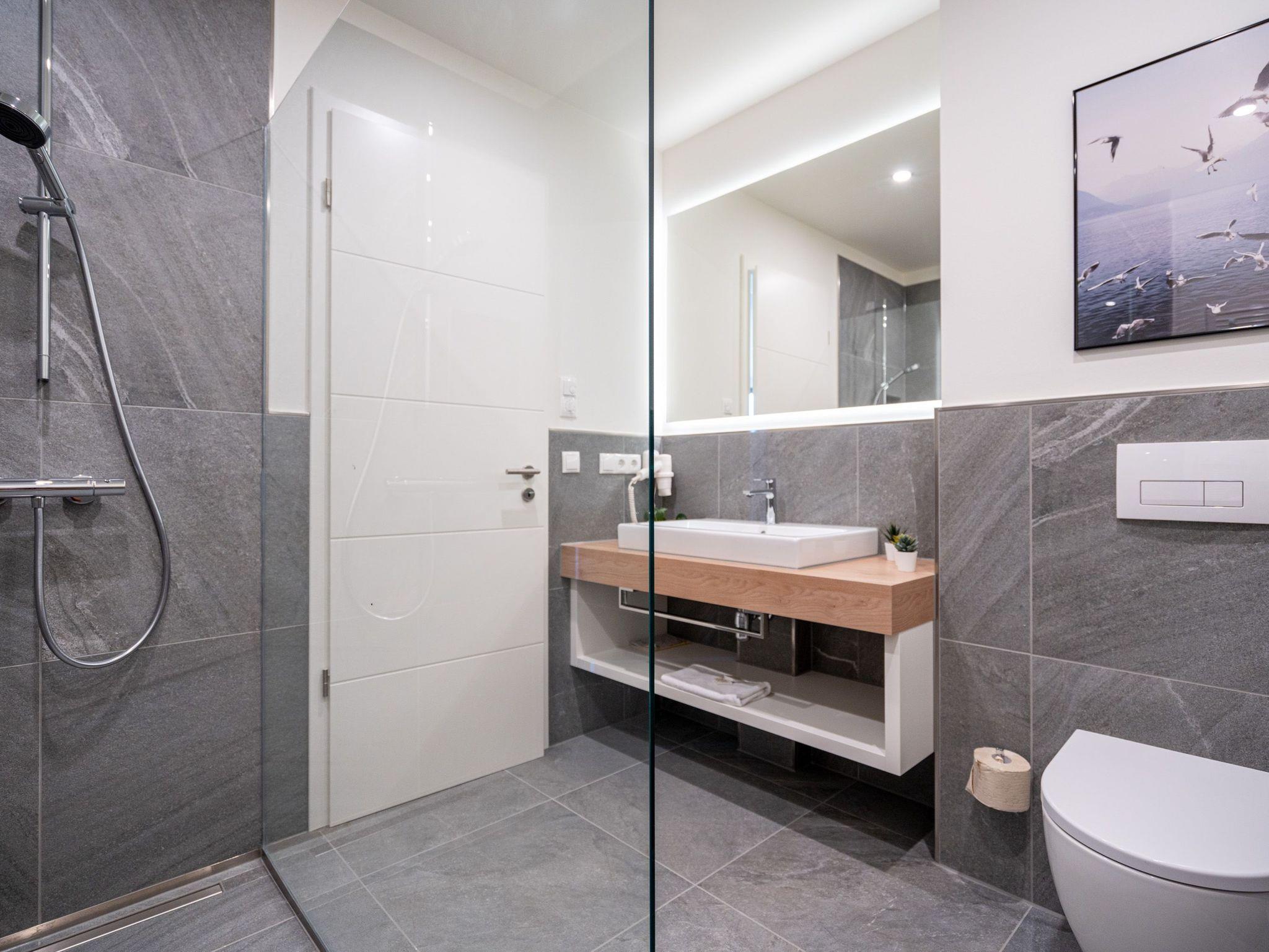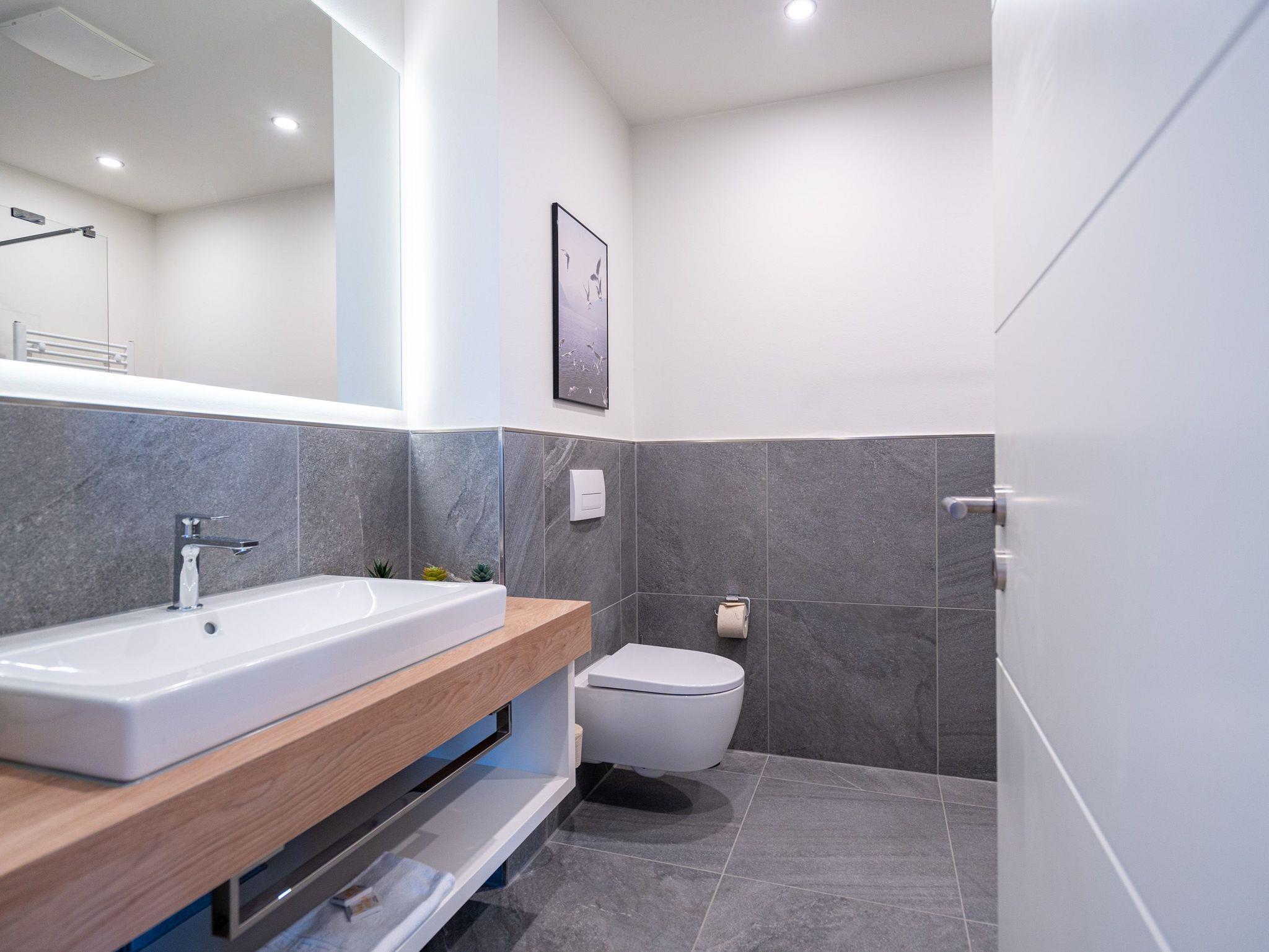 Die 2024 fertig gestellte Strandterrasse liegt direkt an der belebten Strandpromenade und bietet einen einzigartigen Ausblick auf die Grand Dame der historischen Seebrücken sowie die historische Konzertmuschel, einem beliebten Treffpunkt für Kunst und Kultur. Dahinter liegt die Ostsee ein Panorama, das zu den schönsten in den Kaiserbädern gehört. Es ist wie das Abtauchen in eine andere Zeit. In eine Zeit, in der man mit Stock, Sonnenschirm und Hut fürs Sehen und gesehen werden über die Promenade schlenderte; aber auch in eine Zeit, in der damals wie heute Zeit einmal für eine kurze Weile keine Rolle spielt. Weil man angekommen ist im Loslassen, Entspannen und Genießen. Es ist dieser besondere Geruch nach Meeresluft und Freiheit, der in Erinnerung bleibt. Dazu die Bilder, die man mitnimmt. Von langen Strandspaziergängen, vom Lachen in fröhlich schäumenden Ostseewellen, von der Zeit in einem wunderschönen Urlaubsdomizil. Denn genau das ist die Strandterrasse mit ihren 56 modernen und exklusiven Ferienappartements direkt gegenüber der Ahlbecker Seebrücke. Die Ein-, Zwei- oder Dreizimmerwohnungen zwischen 40 und 70 Quadratmeter groß sind von einer Innenarchitektin gemeinsam mit unserem Erfahrungsschatz an Gästewünschen mit viel Liebe zum Detail und ganz individuell konzipiert worden. Entspannung und Wohlfühlen stehen an erster Stelle. Alles ist aufeinander abgestimmt und sorgt für eine gemütliche Atmosphäre. Wählen Sie zwischen einem Domizil in einem hellen, sandfarbenen Designkonzept oder einem Appartement mit anthrazitfarbenen Farbakzenten. Alle Appartements verfügen gleichermaßen über eine stilvolle und komfortable Einrichtung, die passgenau angefertigt worden ist, sowie über moderne Küchen und Bäder. Jedem Schlafzimmer ist ein eigenes Bad mit Dusche zugeordnet (außer App. B4.5). Die Appartements besitzen fast alle einen Balkon viele schauen sogar zur Ostsee hinaus. Die meisten Feriendomizile haben einen Elektrokamin und Infrarotsaunen. Im Erdgeschoss befindet sich ein separater Gemeinschaftsraum für Fahrräder. Außerdem besteht die Möglichkeit, im Gemeinschaftswaschraum 2 Waschmaschinen [&] Trockner zu nutzen. Ergänzt wird das Angebot durch eine Gemeinschaftssauna, die täglich von 11:00 bis 22:00 Uhr nutzbar ist. In der Tiefgarage (Einfahrtshöhe 2,03 Meter) steht für jede Wohnung 1 Pkw-Stellplatz zur Verfügung. Ist alles zur Zufriedenheit untergebracht? Dann kann der Urlaub ja beginnen. Und beim Blick vom Balkon über die Ostsee treffen sich zum Sonnenaufgang das Heute und das Damals. Gelassenheit legt sich beim Gang hinunter an den Strand auf die Seele. Jetzt darf die Zeit stehenbleiben.