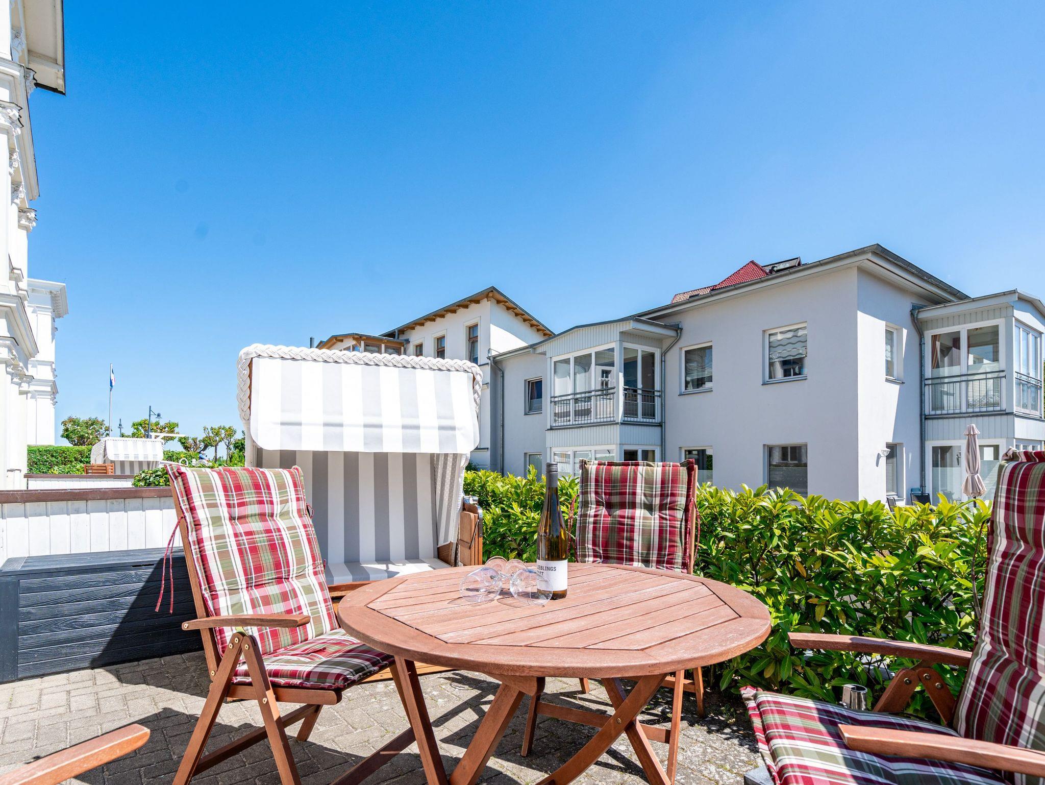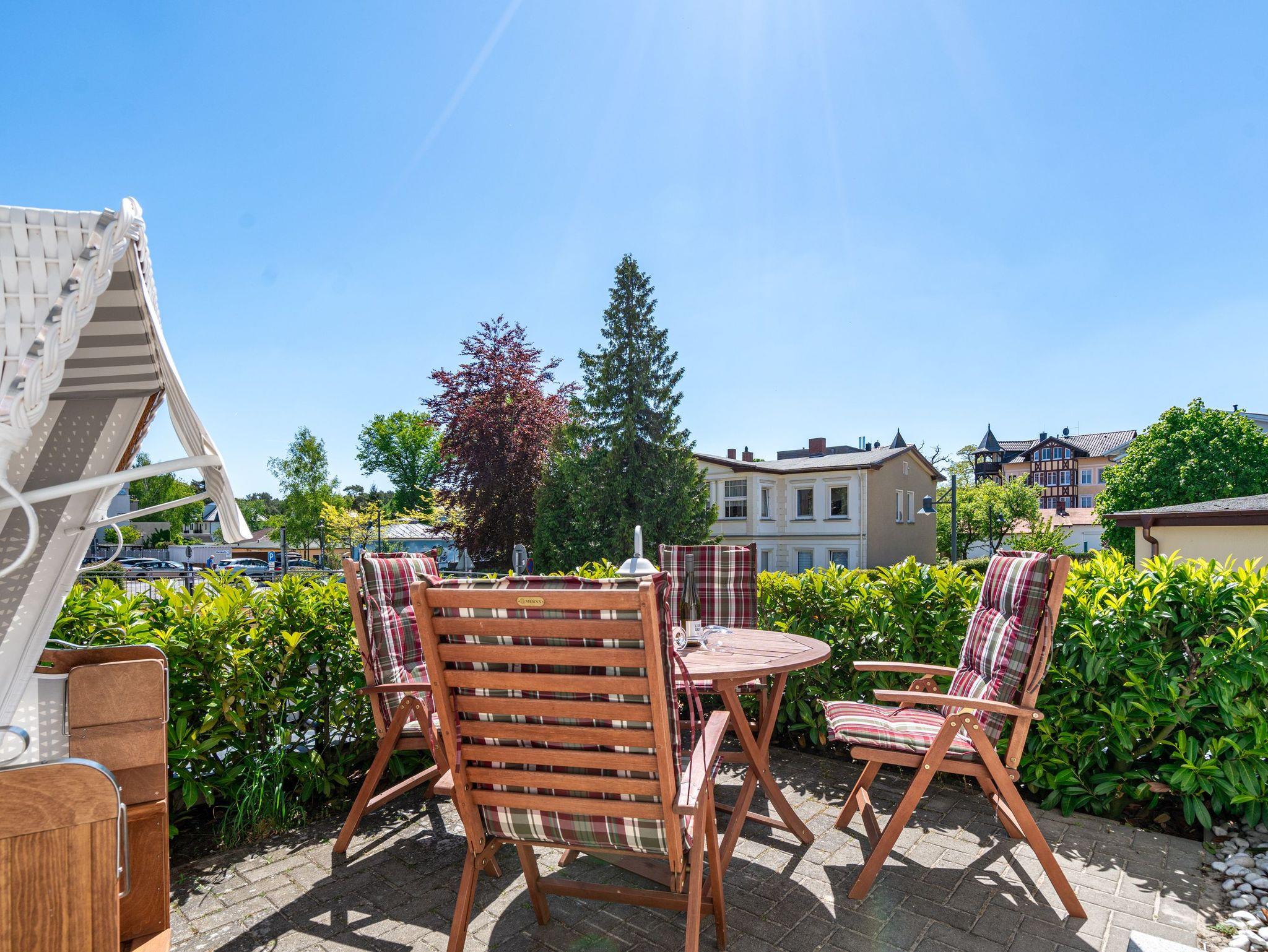 Genießen Sie die frische Ostseeluft auf der großen Terrasse der Villa Albertine, nur wenige Meter vom Strand in Ahlbeck entfernt.