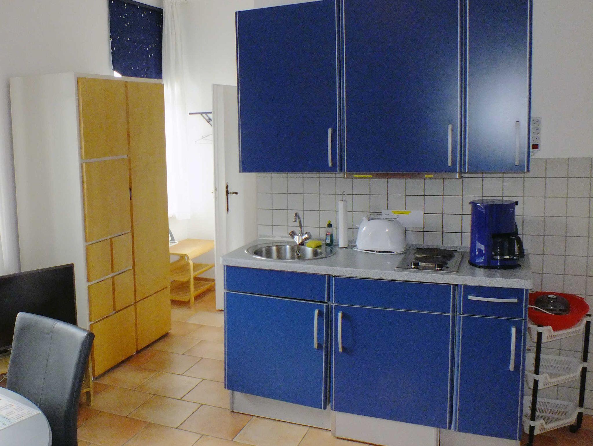Dieses moderne 33 qm 2-Raum-Appartement (vollständig gefliest) im 1. OG verfügt über einen kombinierten Wohn- und Schlafraum mit TV, qualitativem Bali-Sofa-Bett mit einer Liegefläche von 1,60 x 2,00 m, Kleiderschrank, Kommode, Esstisch mit Stühlen sowie eine kleinen Pantry-Küche mit 2-Platten-Herd, Kühlschrank, Spüle, Kaffeemaschine, Toaster, Geschirr etc. Der Schlafraum ist ebenso mit einem qualitativem Bali-Sofa-Bett (Liegefläche 1,80 m x 2,00 m) ausgestattet. Das Bad hat DU/WC.