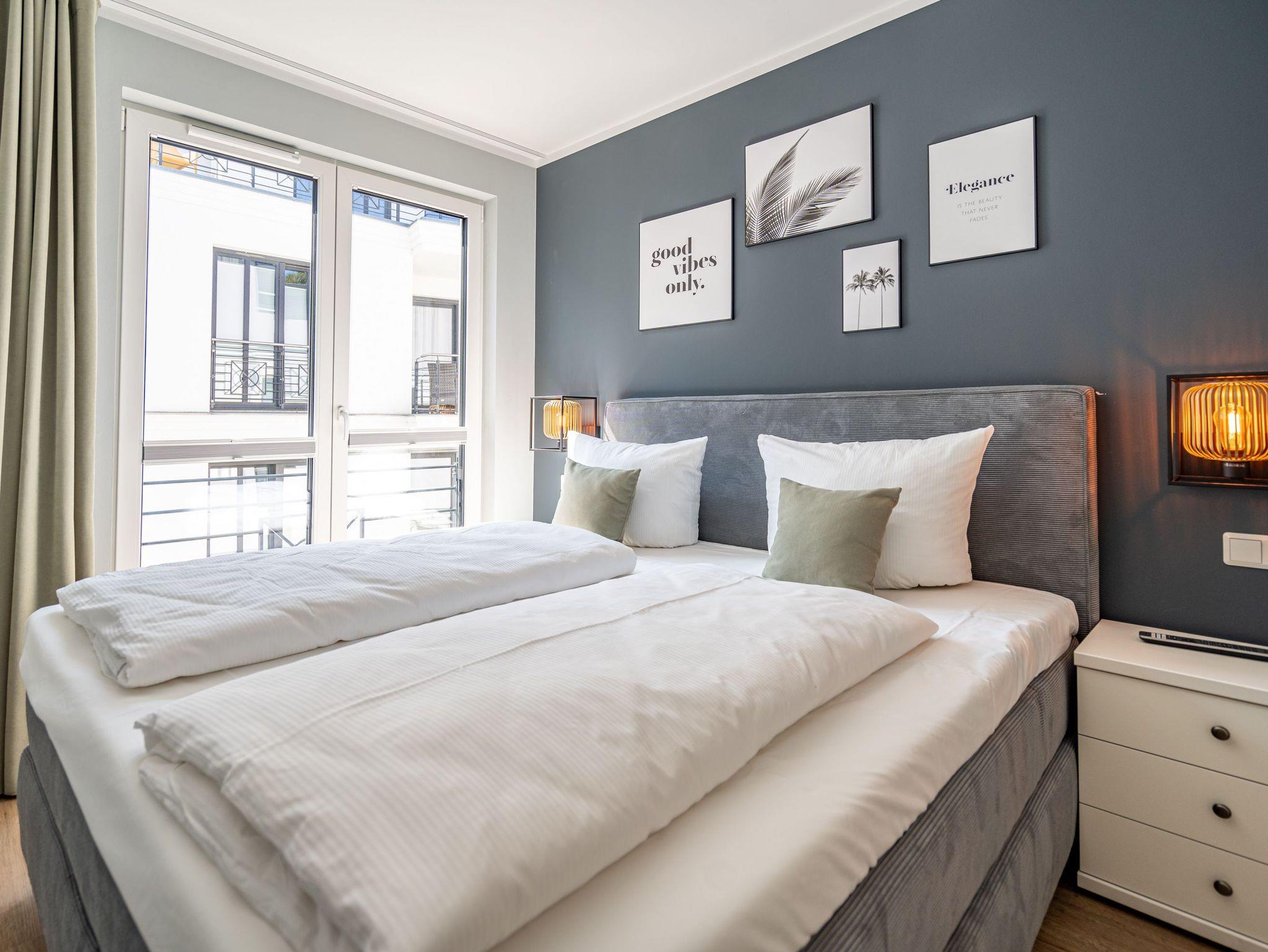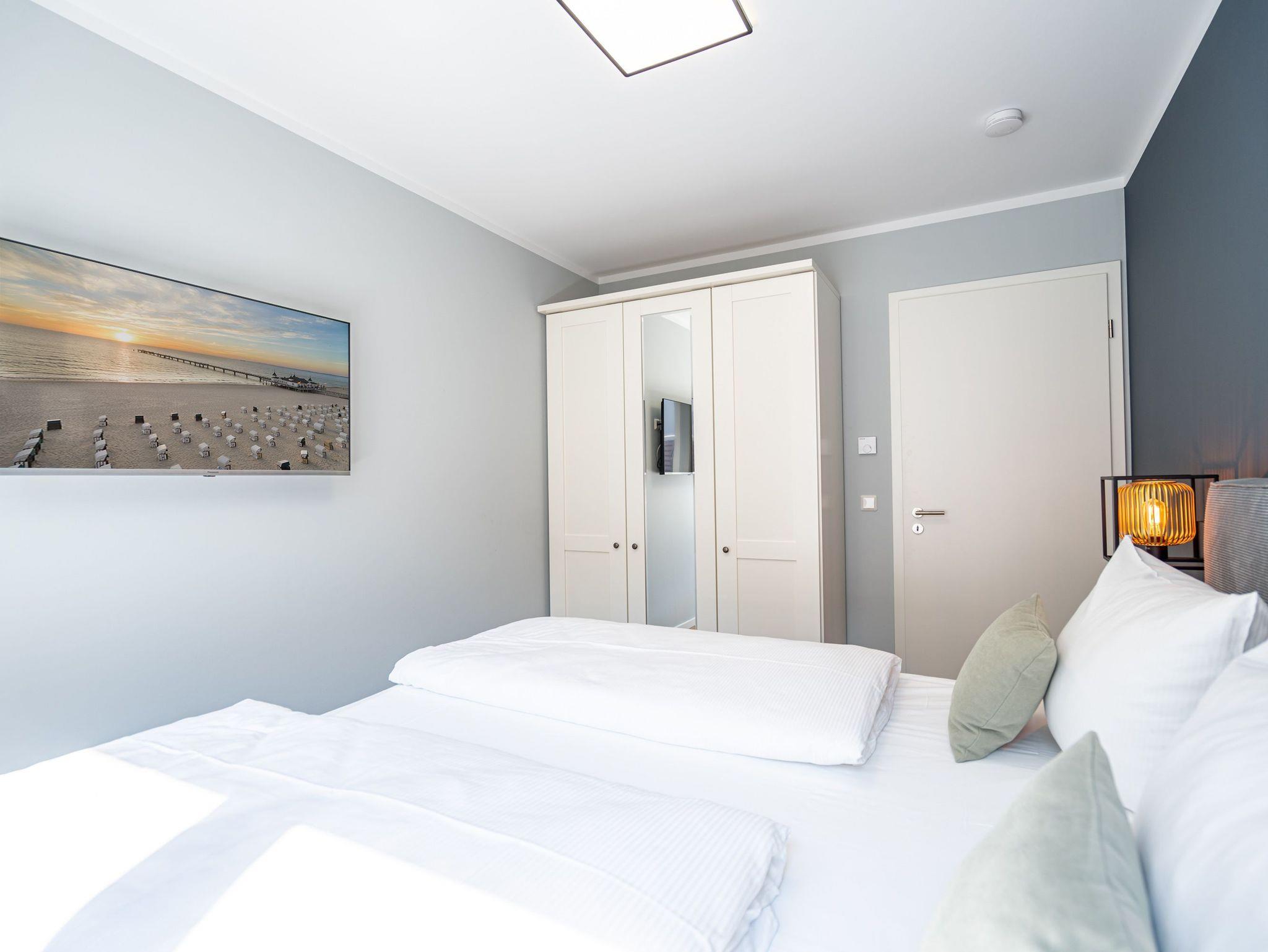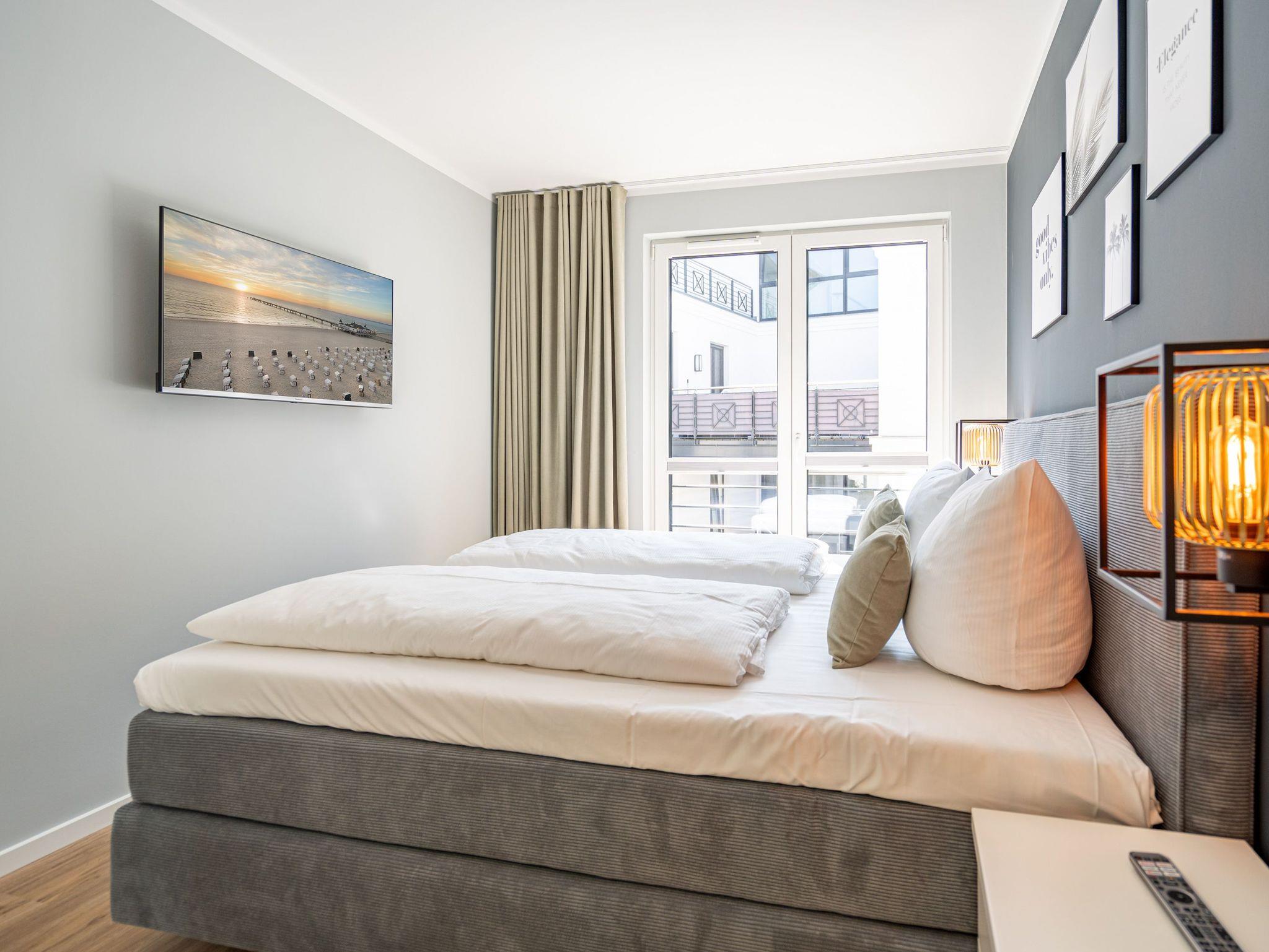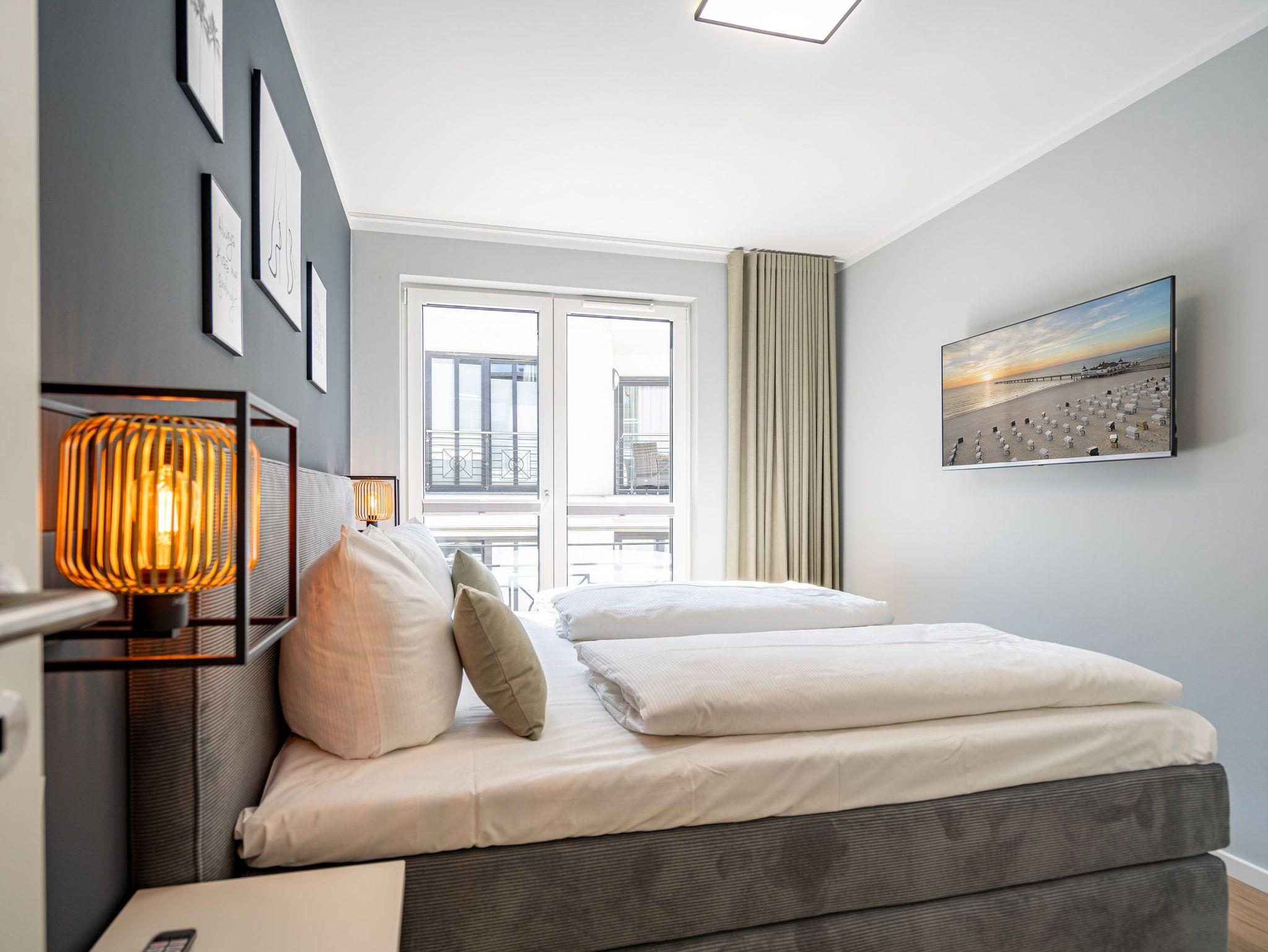 Willkommen im 3-Raum-Appartement (69 qm) Nr. 05 in der ersten Etage des Quartier 6, ideal für bis zu 4 Personen. Der offene Wohnbereich lädt mit einer gemütlichen Sitzgruppe, einem Gas-Kamin mit Fernbedienung und einem 55-Zoll-Flat-TV zum Entspannen ein. Die voll ausgestattete Küche verfügt u. a. über ein Induktionskochfeld, einen Backofen und einen Gefrierschrank. Von hier aus gelangen Sie auf den Süd-West-Balkon, der mit Gartenmöbeln ausgestattet ist und sich perfekt für entspannte Stunden im Freien eignet. Die beiden Schlafzimmer sind jeweils mit bequemen Boxspringdoppelbetten (1,80 m x 2,00 m), einem Kleiderschrank und einem Flat-TV ausgestattet. Zwei moderne Duschbäder bieten jeweils einen Waschtisch und ein WC, wobei eines der Bäder zusätzlich über eine finnische Sauna verfügt. Für mehr Komfort stehen Ihnen eine kostenfreie Waschmaschine und WLAN in der Wohnung zur Verfügung. Im Keller befindet sich ein wohnungseigener Abstellraum für Fahrräder. Ein PKW-Stellplatz in der Tiefgarage rundet das Angebot ab. Genießen Sie Ihren Aufenthalt in dieser komfortablen und stilvoll eingerichteten Ferienwohnung!