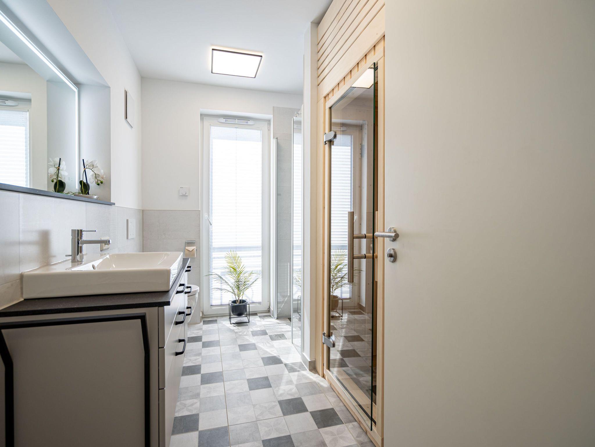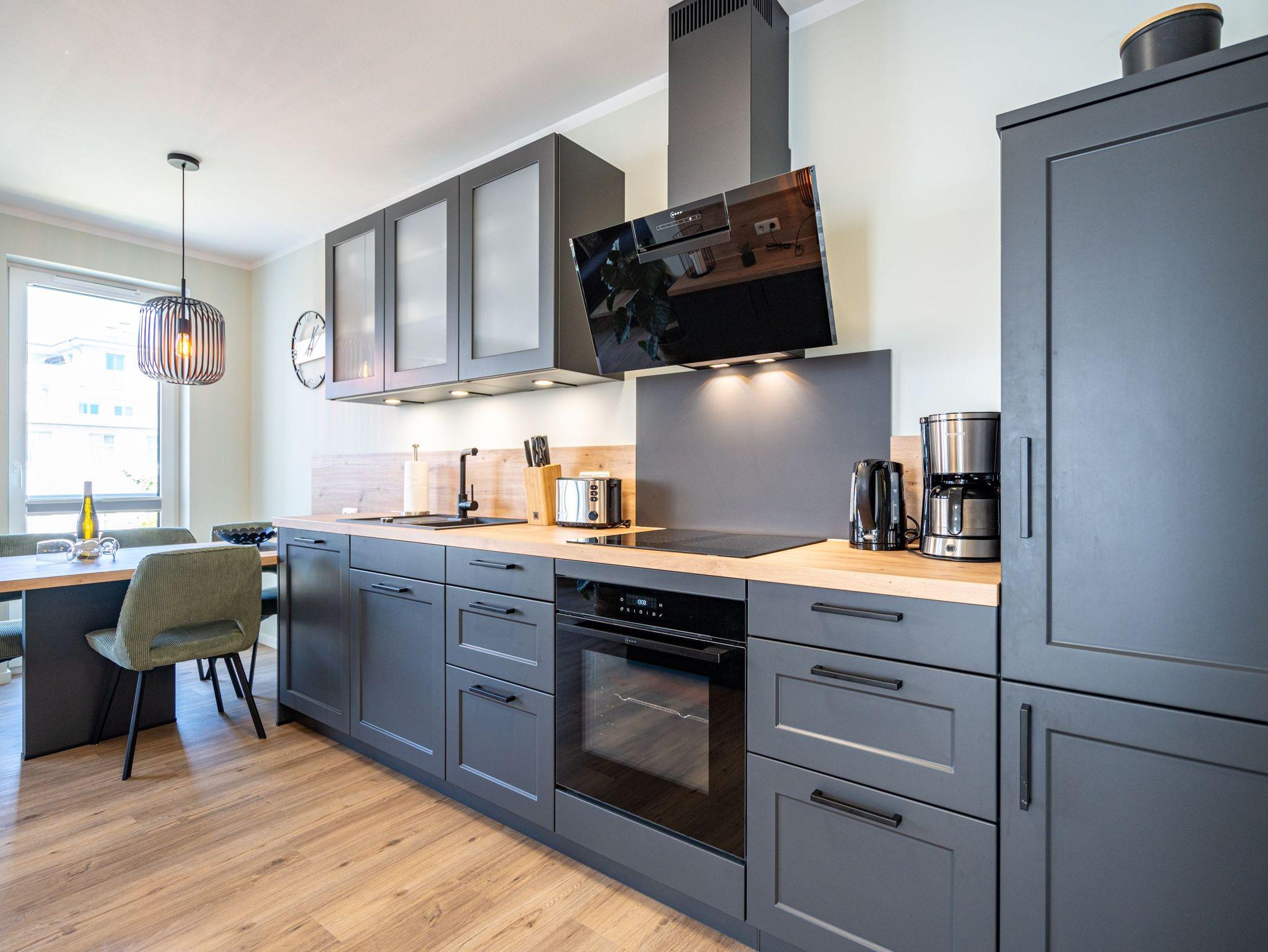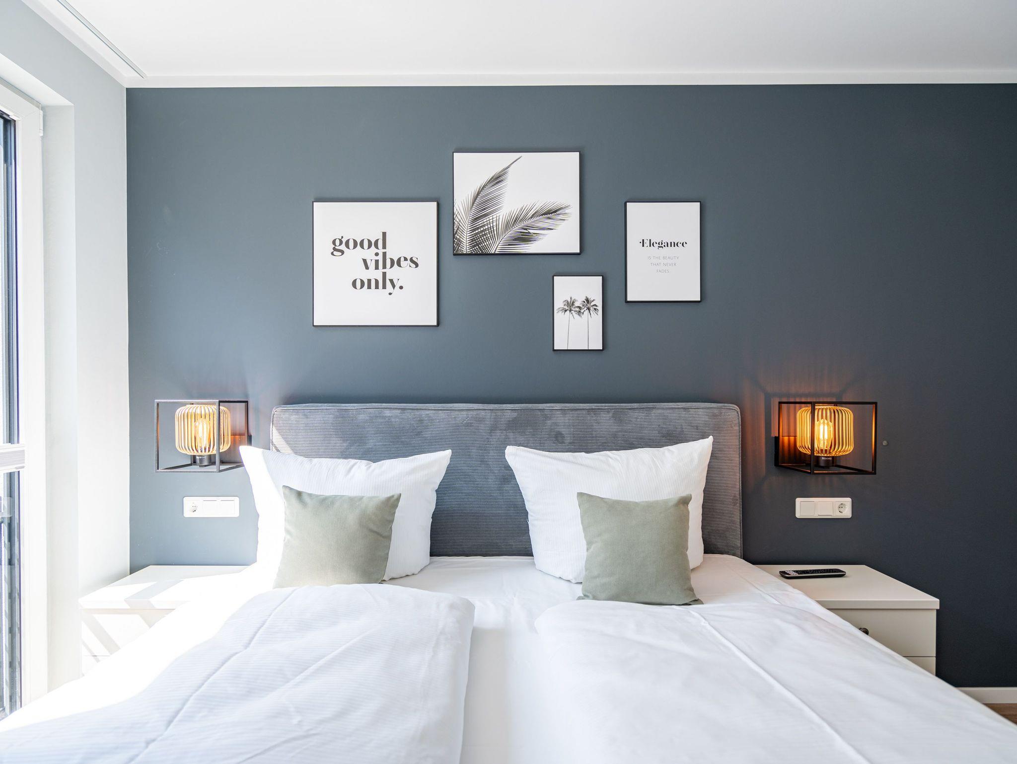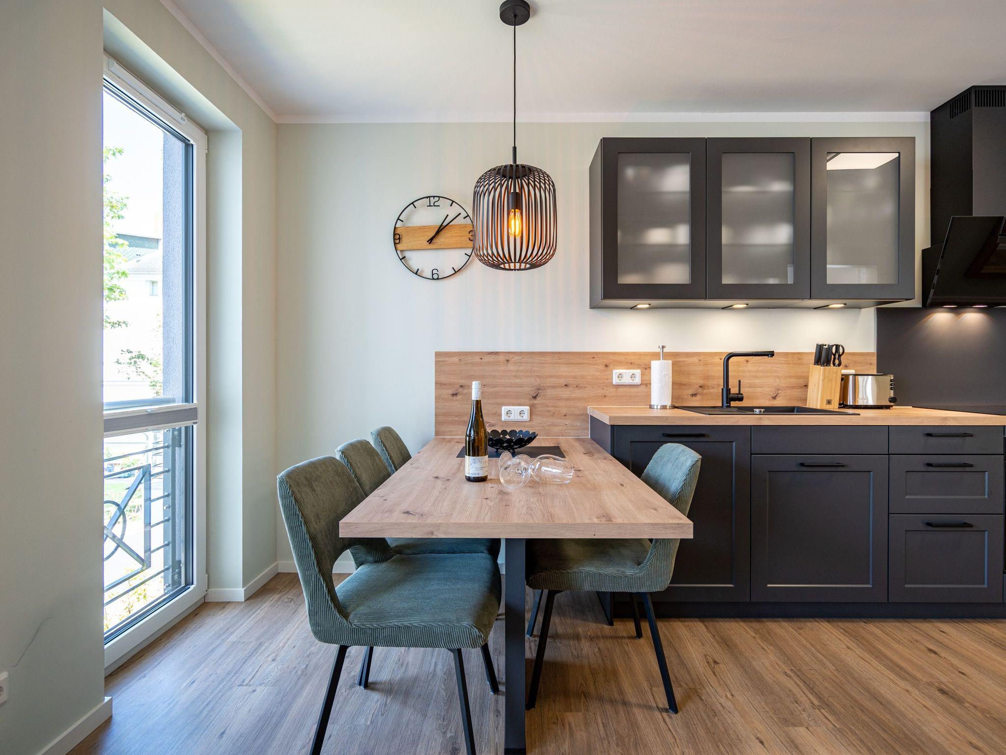 Willkommen im 3-Raum-Appartement (69 qm) Nr. 05 in der ersten Etage des Quartier 6, ideal für bis zu 4 Personen. Der offene Wohnbereich lädt mit einer gemütlichen Sitzgruppe, einem Gas-Kamin mit Fernbedienung und einem 55-Zoll-Flat-TV zum Entspannen ein. Die voll ausgestattete Küche verfügt u. a. über ein Induktionskochfeld, einen Backofen und einen Gefrierschrank. Von hier aus gelangen Sie auf den Süd-West-Balkon, der mit Gartenmöbeln ausgestattet ist und sich perfekt für entspannte Stunden im Freien eignet. Die beiden Schlafzimmer sind jeweils mit bequemen Boxspringdoppelbetten (1,80 m x 2,00 m), einem Kleiderschrank und einem Flat-TV ausgestattet. Zwei moderne Duschbäder bieten jeweils einen Waschtisch und ein WC, wobei eines der Bäder zusätzlich über eine finnische Sauna verfügt. Für mehr Komfort stehen Ihnen eine kostenfreie Waschmaschine und WLAN in der Wohnung zur Verfügung. Im Keller befindet sich ein wohnungseigener Abstellraum für Fahrräder. Ein PKW-Stellplatz in der Tiefgarage rundet das Angebot ab. Genießen Sie Ihren Aufenthalt in dieser komfortablen und stilvoll eingerichteten Ferienwohnung!