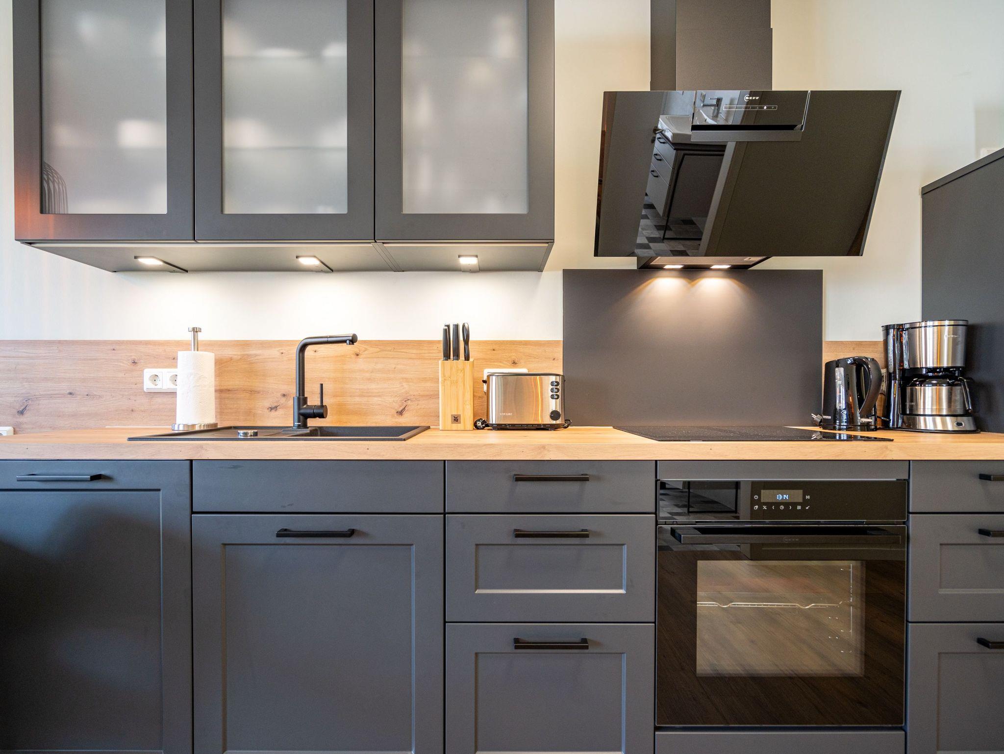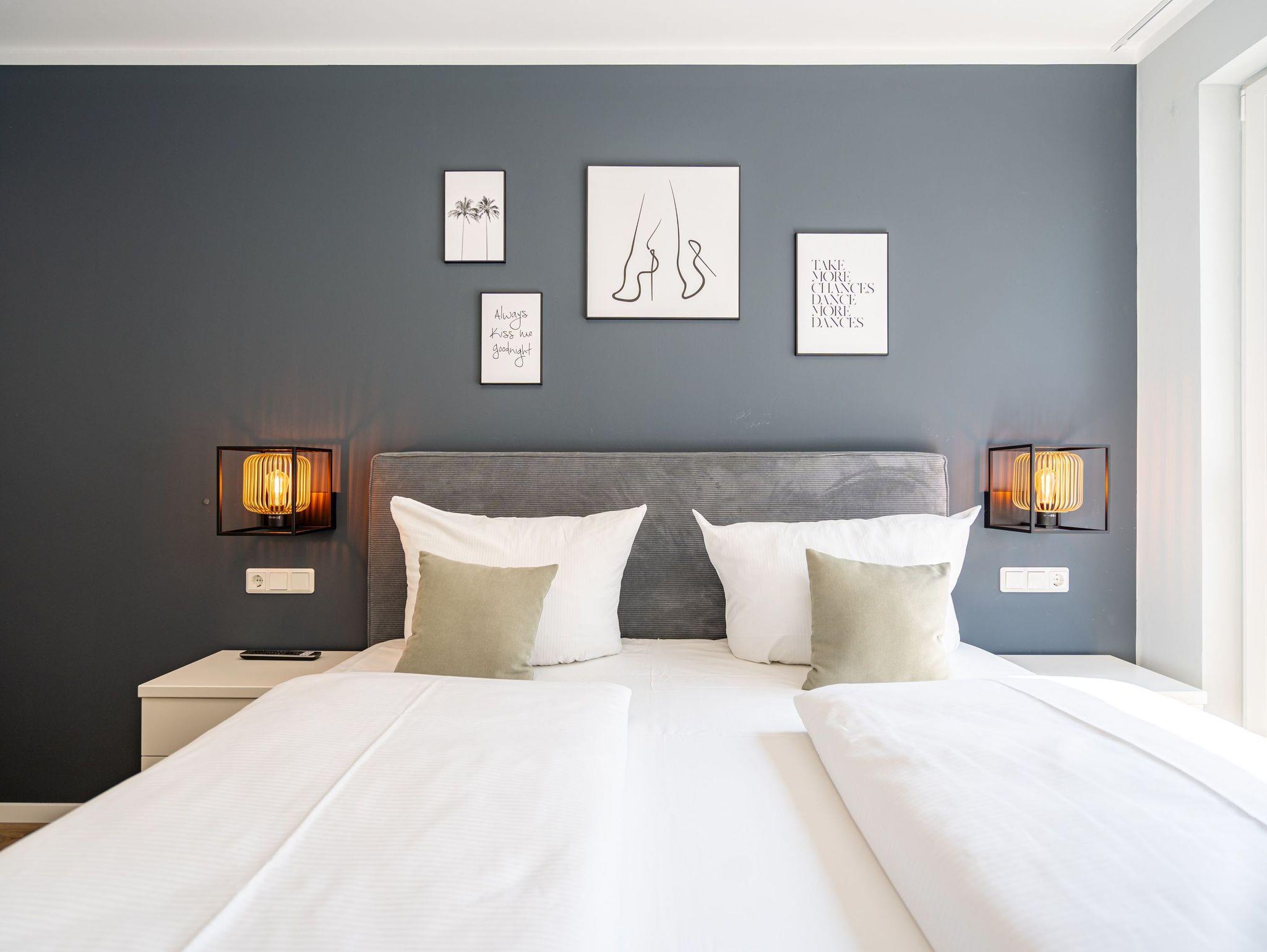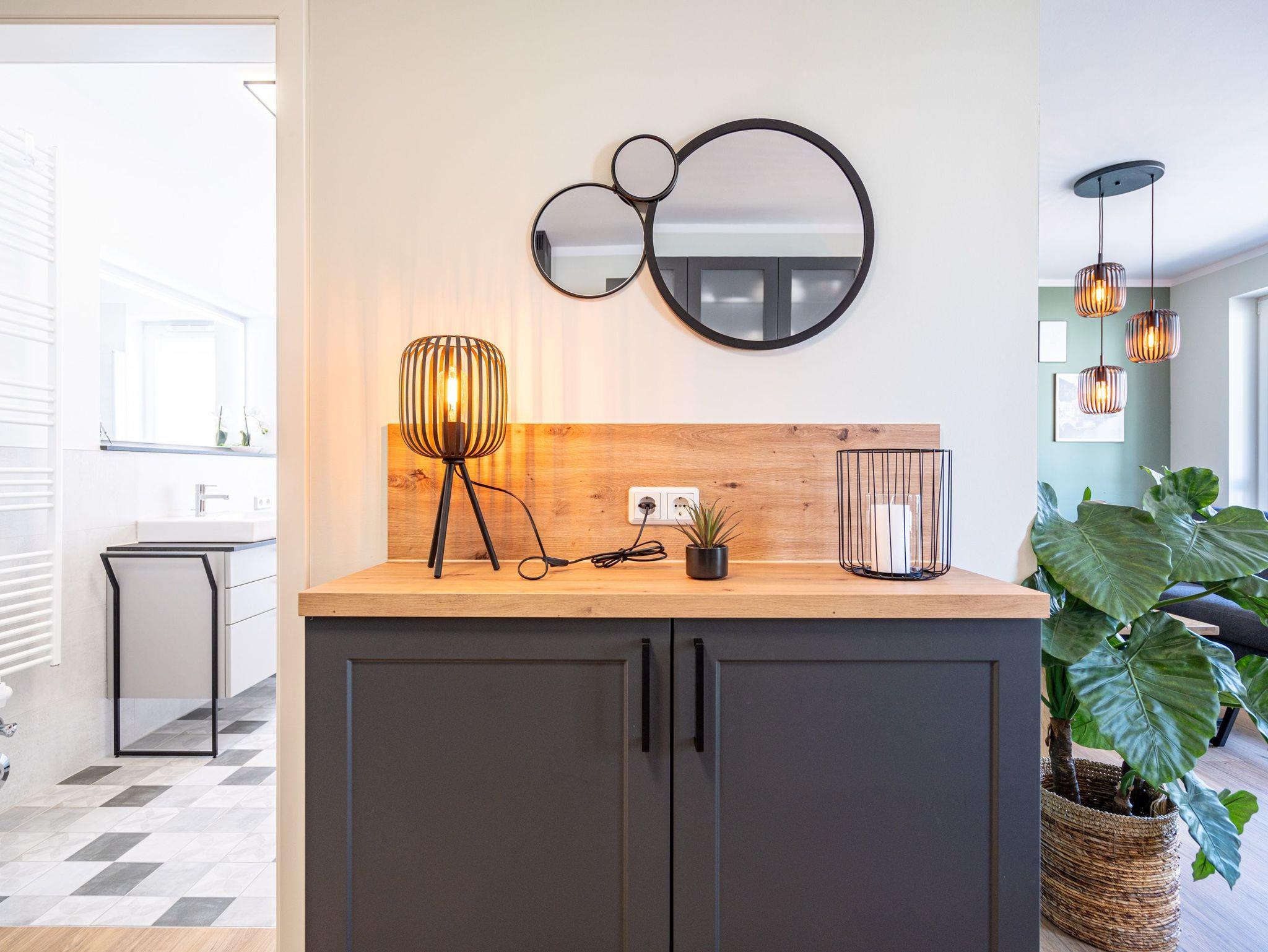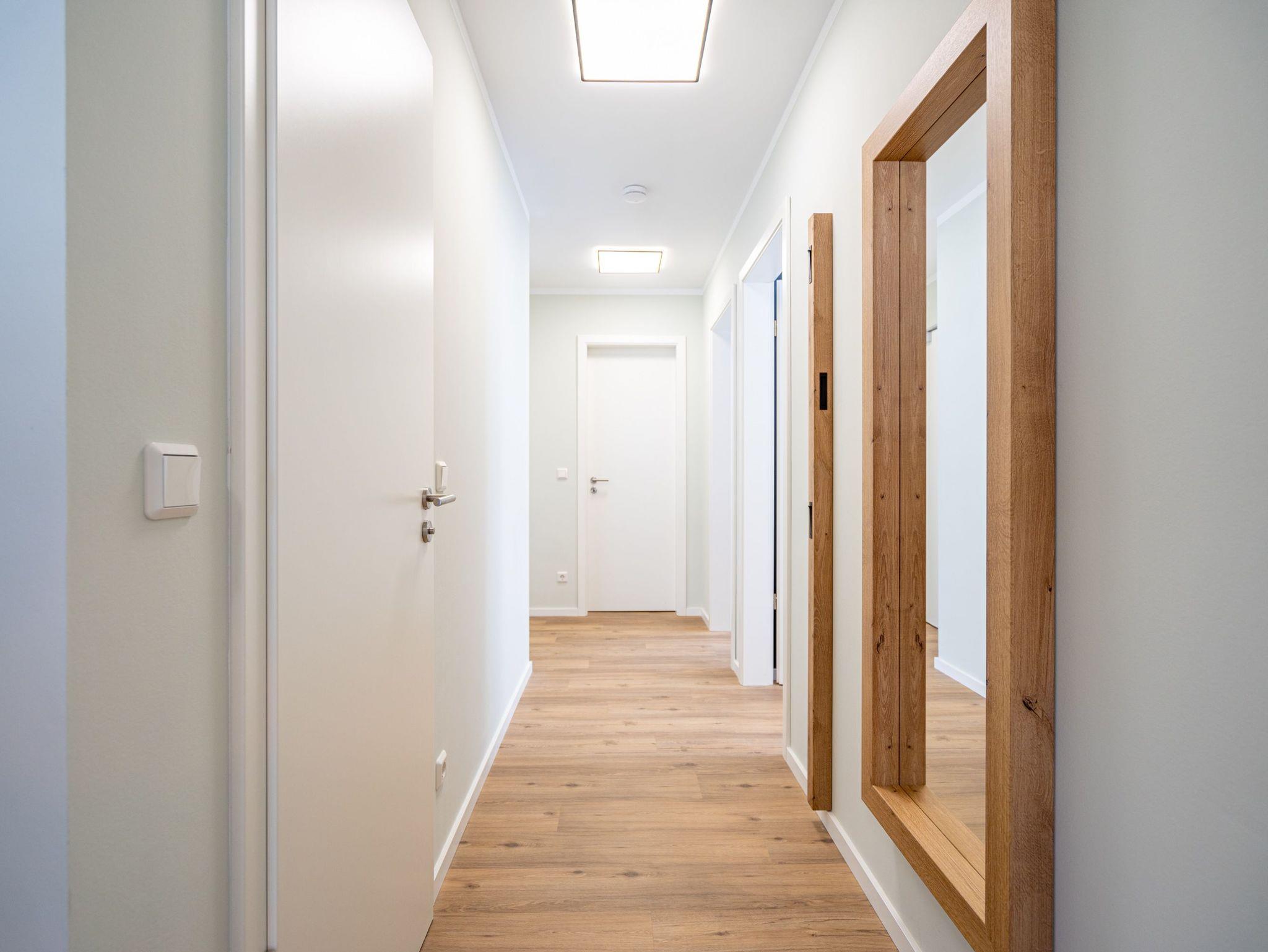 Willkommen im 3-Raum-Appartement (69 qm) Nr. 05 in der ersten Etage des Quartier 6, ideal für bis zu 4 Personen. Der offene Wohnbereich lädt mit einer gemütlichen Sitzgruppe, einem Gas-Kamin mit Fernbedienung und einem 55-Zoll-Flat-TV zum Entspannen ein. Die voll ausgestattete Küche verfügt u. a. über ein Induktionskochfeld, einen Backofen und einen Gefrierschrank. Von hier aus gelangen Sie auf den Süd-West-Balkon, der mit Gartenmöbeln ausgestattet ist und sich perfekt für entspannte Stunden im Freien eignet. Die beiden Schlafzimmer sind jeweils mit bequemen Boxspringdoppelbetten (1,80 m x 2,00 m), einem Kleiderschrank und einem Flat-TV ausgestattet. Zwei moderne Duschbäder bieten jeweils einen Waschtisch und ein WC, wobei eines der Bäder zusätzlich über eine finnische Sauna verfügt. Für mehr Komfort stehen Ihnen eine kostenfreie Waschmaschine und WLAN in der Wohnung zur Verfügung. Im Keller befindet sich ein wohnungseigener Abstellraum für Fahrräder. Ein PKW-Stellplatz in der Tiefgarage rundet das Angebot ab. Genießen Sie Ihren Aufenthalt in dieser komfortablen und stilvoll eingerichteten Ferienwohnung!