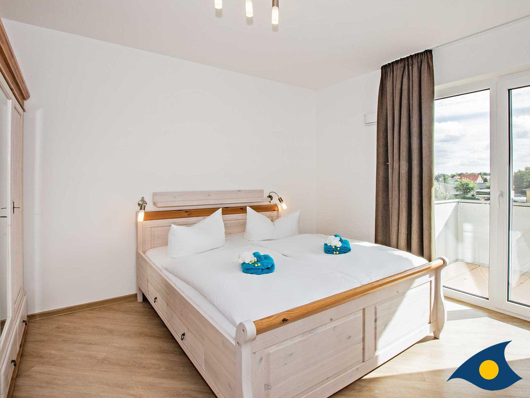 Das Schlafzimmer mit dem großen und gemütlichen Doppelbett sorgt für erholsamen Schlaf nach einem erlebnisreichen Urlaubstag. Auch von hieraus gelangen Sie auf den 13 m² großen, möblierten Balkon.Der Kleiderschrank bietet genügend Platz für Ihre Urlaubsgarderobe.