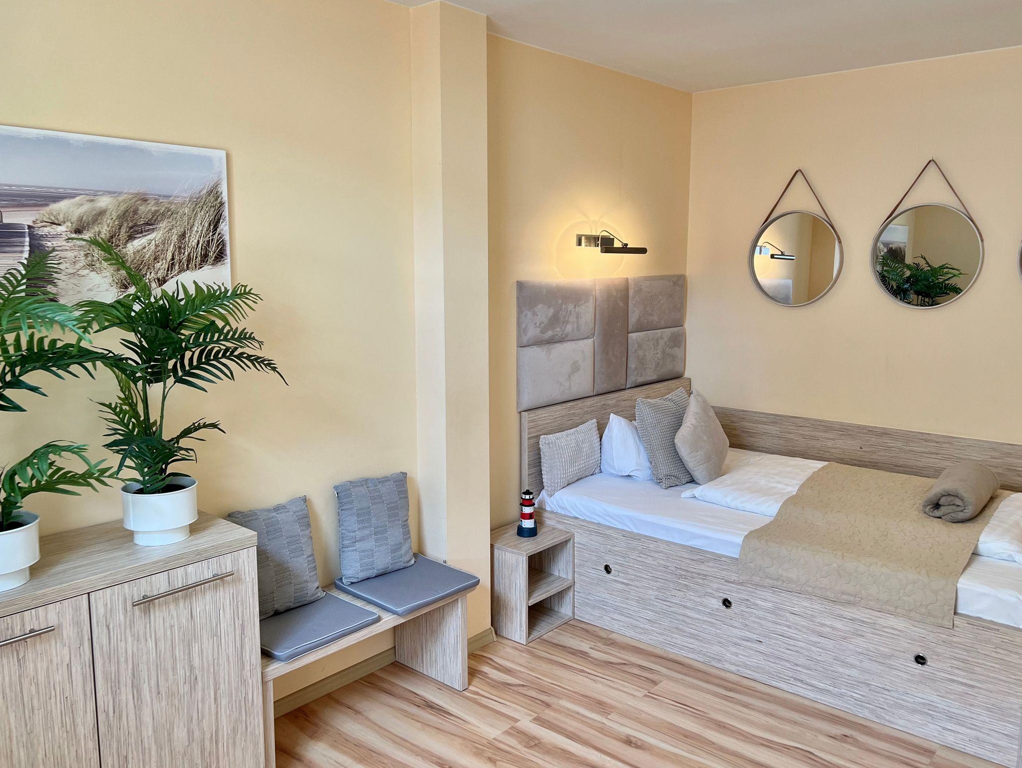 Die nur 80 Meter vom Strand entfernte Obergeschosswohnung besticht durch seine Helligkeit. Viele Fenster in einem Erker mit Tisch und Sitzmöglichkeiten dienen Ihrer Gemütlichkeit. Ein großzügiger Wohn-/Schlafraum sowie ein zweites, separates Schlafzimmer sorgen für Familien mit ausreichend Platz. Zwei große Betten (160cm und 140cm) sowie eine farblich harmonischer Ruhesessel lassen Ihrer Ruhe keine Wünsche offen. Eine moderne, grundausgestattete Einbauküche, LED-SMART-TV, HiFi-Anlage und Internetzugang lassen Sie bei uns alle Sorgen vergessen. Ihr Appartement ist sowohl Allergiker wie Nichtraucher freundlich. Weiße, kräftige Baumwollbettwäsche und weiche Handtücher werden Ihnen schmeicheln. Geschirrtücher und Duschvorleger sind vorhanden. Interessant für junge Familien sind die Unterbringungsmöglichkeiten mitgebrachten Eigentums (entweder im Haus Ihres Appartements Parterre oder im Fahrradschuppen). Auf dem Hof finden Sie Wäscheständer für Ihre nasse Wäsche. Ihrem Fahrzeug ist ein Parkplatz direkt am Ferienhaus reserviert. Für eventuell benötigte Hochstühle oder Kinderreisebetten entstehen Ihnen nach Rücksprache keine zusätzlichen Kosten. Bitte informieren Sie uns über Ihre Wünsche rechtzeitig.