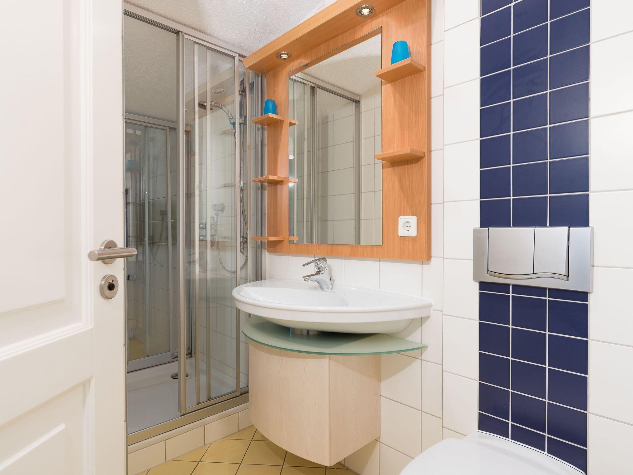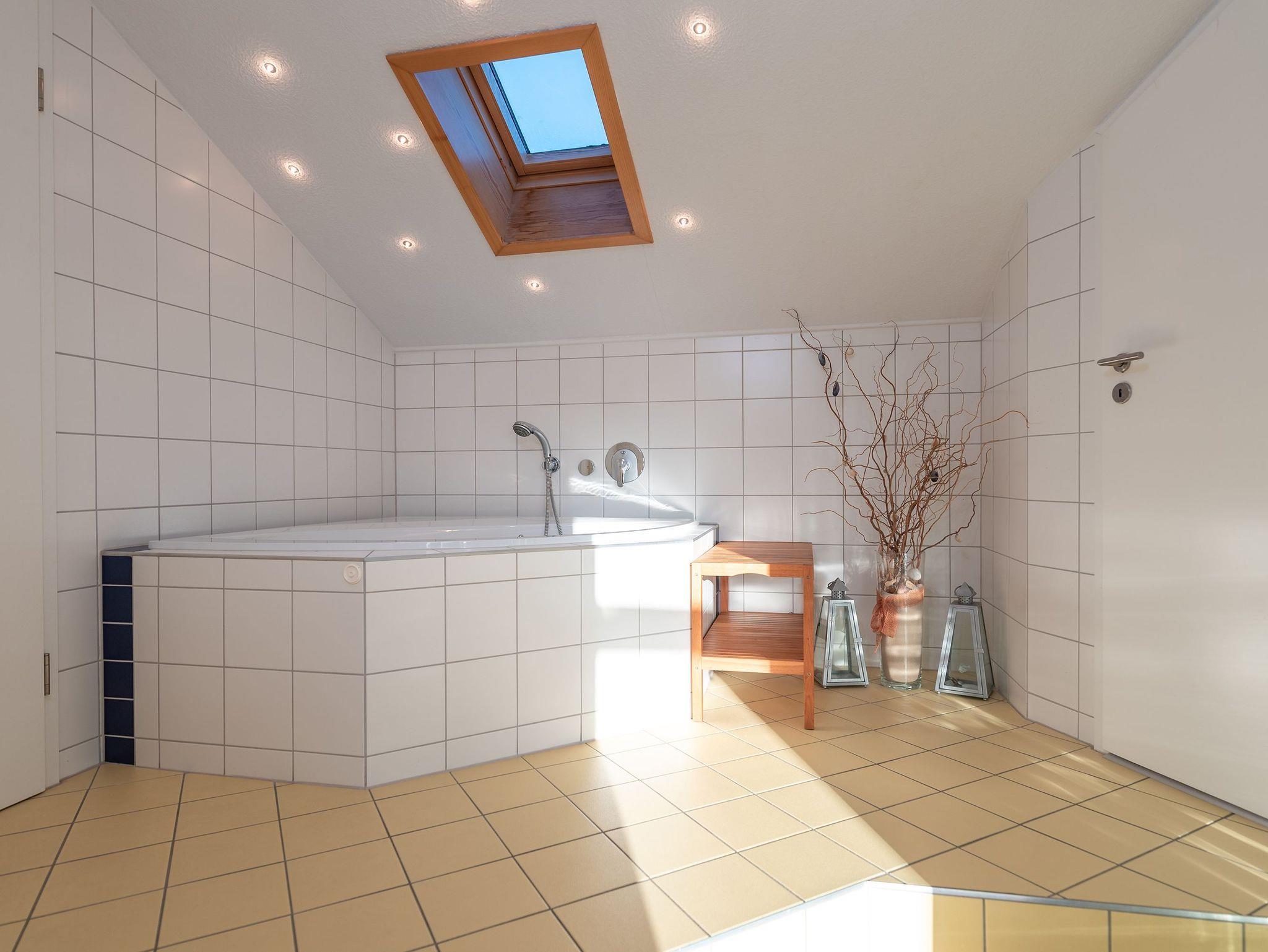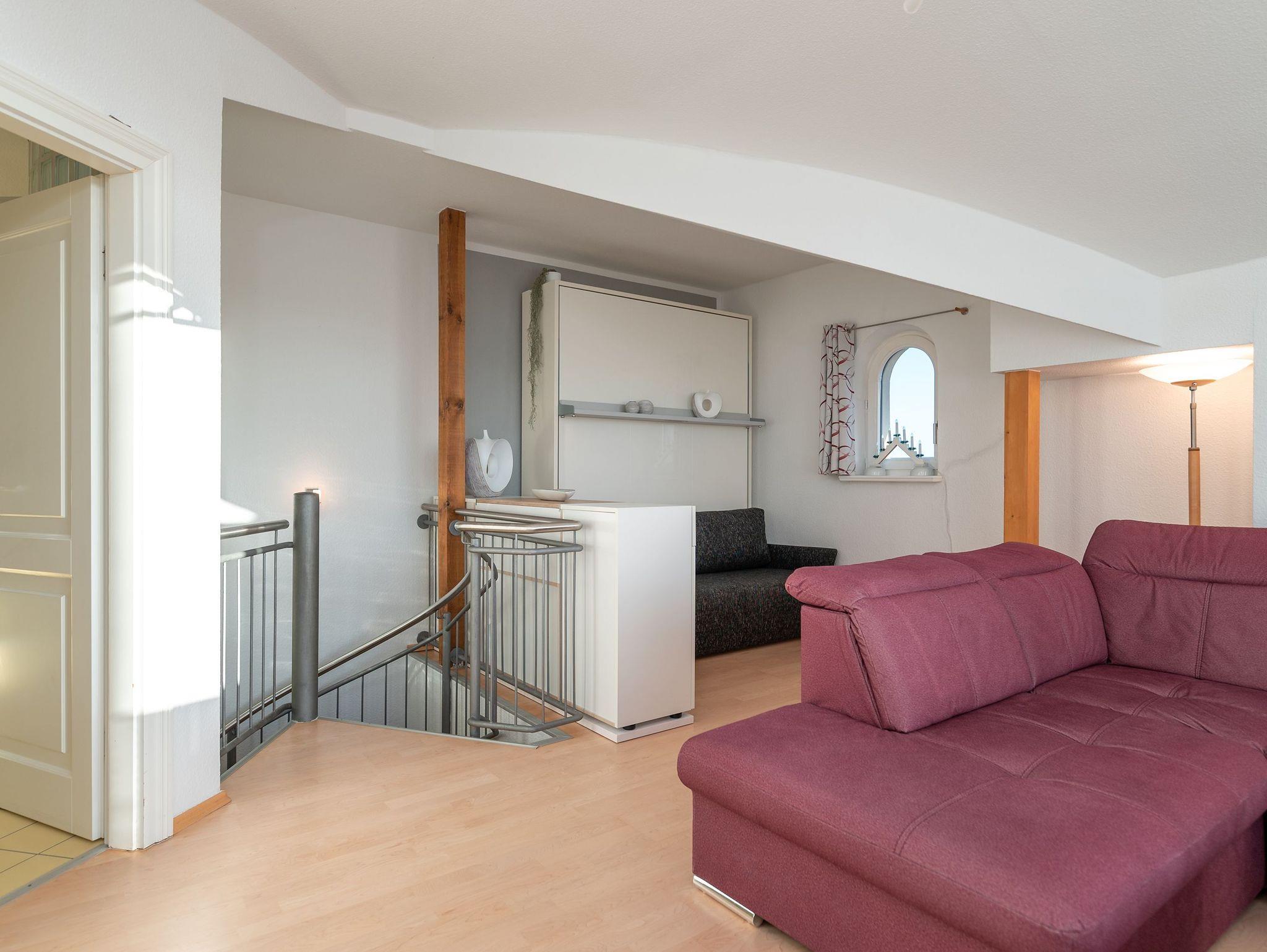 Eine Wendeltreppe führt Sie ins Dachgeschoss, wo sich das Wohnzimmer mit einem einladenden Kamin und einer gemütlichen Couchecke mit Flat-TV befindet. Genießen Sie entspannte Stunden auf der sonnigen, möblierten Terrasse, die den perfekten Rahmen für unvergessliche Urlaubsmomente bietet und von wo aus Sie ebenfalls den seitlichen Meerblick bewundern können. Das zweite Badezimmer im Dachgeschoss verfügt über eine Dusche, einen Waschtisch/WC und eine einladende Badewanne. Das angrenzende, zweite Schlafzimmer mit Doppelbett unter der charakteristischen Dachschräge verspricht ruhige Nächte.