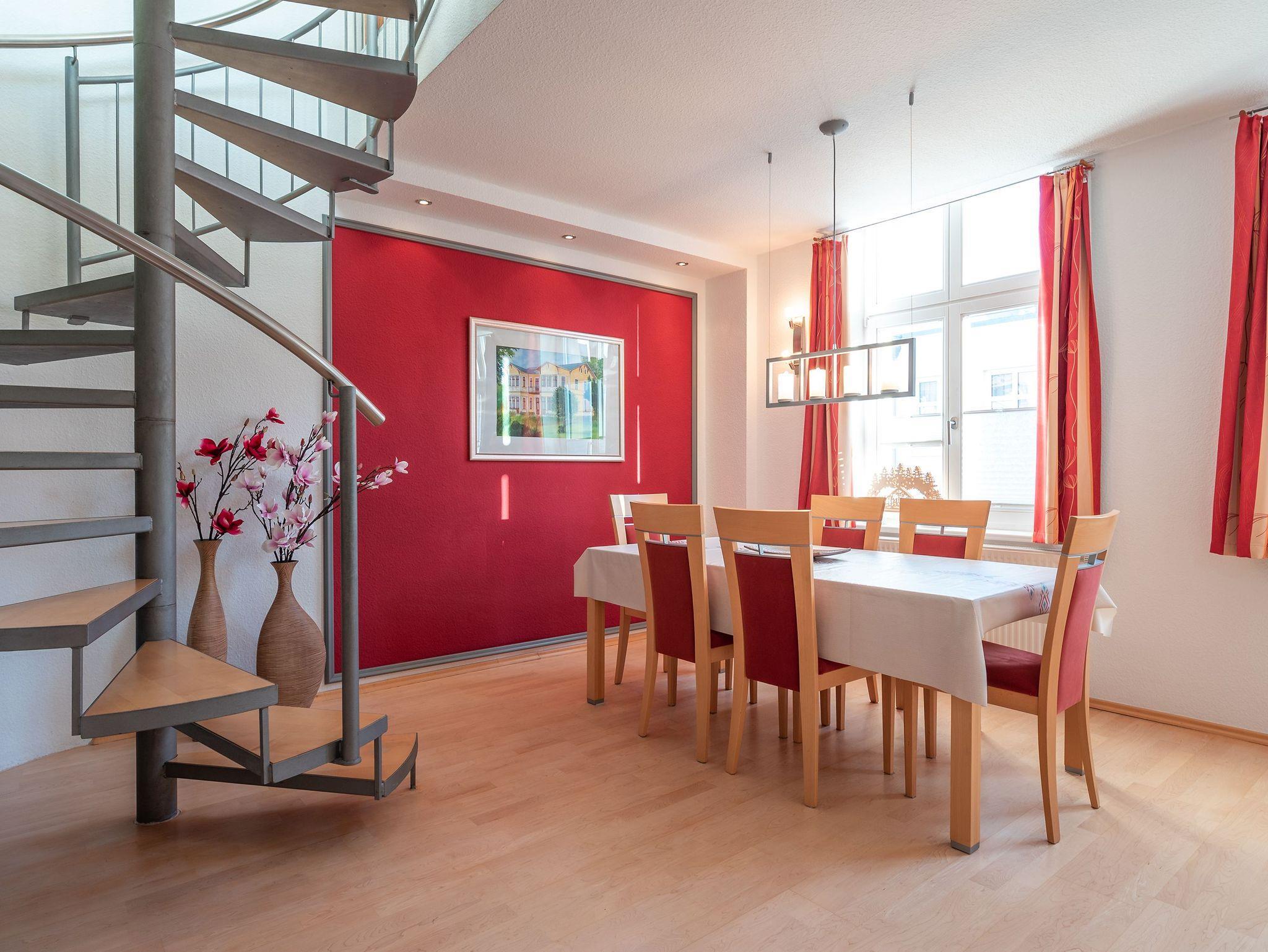 Diese großzügige Galeriewohnung, gelegen im 1. Obergeschoss und Dachgeschoss der Villa, ist ein wahres Juwel für jeden Urlauber. Im 1. Obergeschoss lädt ein großes Schlafzimmer mit komfortablem Doppelbett zum Träumen ein, während die offene, voll ausgestattete Küche mit einem Esstisch für sechs Personen zum gemeinsamen Kochen und Genießen einlädt. Ein modernes Badezimmer mit Dusche rundet die Ausstattung auf dieser Etage ab.