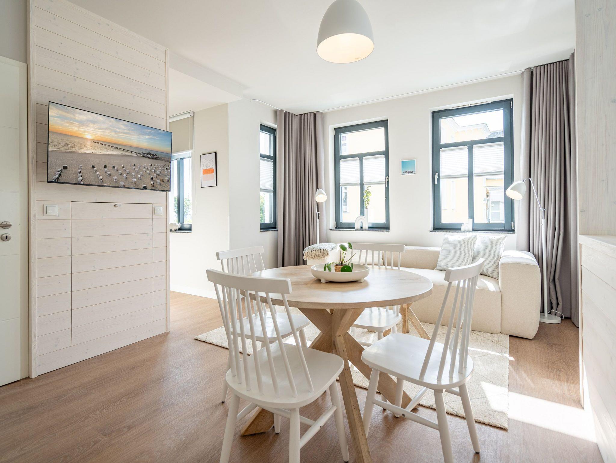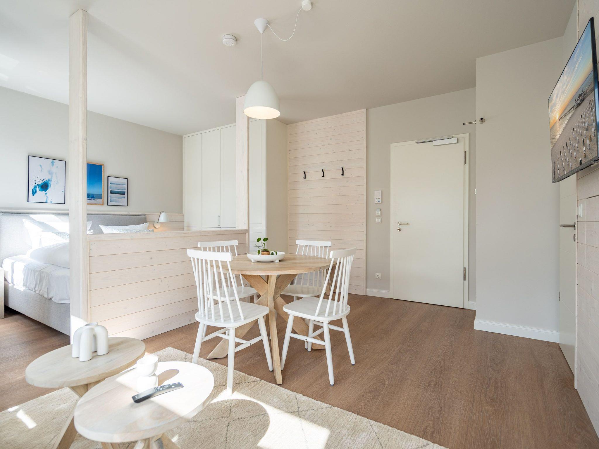 Willkommen in diesem schnuckeligen und behaglichen 1-Raum-Appartement A1.6 im ersten Obergeschoss. Auf dieses 36 Quadratmeter große Urlaubsdomizil passt das Wort Hygge perfekt. Denn es strahlt eine ungeheure Gemütlichkeit aus. Klein, aber oho, kann man hier nur sagen. Denn das Appartement für 2 Personen bietet aus seinem Erker einen seitlichen Blick auf die Ostsee und ist mit allem ausgestattet, was man sich für eine entspannte Auszeit nur vorstellen kann. Der offene Wohn- und Essbereich ist mit einem schönen Essplatz, einem gemütlichen Sofa und einem 43-Zoll-Flachbildfernseher ausgestattet. Helles Holz und helle Möbel sorgen für Leichtigkeit und Offenheit. Das komfortable Boxspringdoppelbett (1,80m x 2,00m) verspricht süße Träume und einen erholsamen Schlaf. Der maßgefertigte Kleiderschrank bietet viel Platz für die Urlaubsgarderobe. Auch die Küche ? wenn auch klein ? hat es in sich. Hochwertige Markengeräte von Siemens und eine Vollausstattung machen vom Frühstück bis zum Abendessen das Zubereiten und Kochen zu einem reinen Vergnügen. Das innenliegende Bad ist mit einer Dusche, einem WC und einem Waschtisch ausgestattet. Damit Sie sich nicht noch um einen Parkplatz kümmern müssen, steht Ihnen ein PKW-Stellplatz in der Tiefgarage zur Verfügung. Erleben Sie ein paar unvergesslich schöne Tage an der Ostsee und lassen Sie sich von diesem charmanten Domizil verzaubern. Es ist der ideale Rückzugsort mit viel Behaglichkeit.