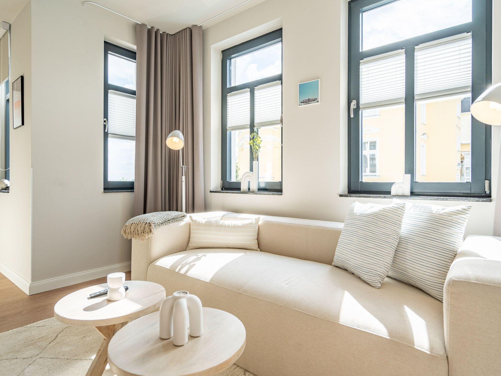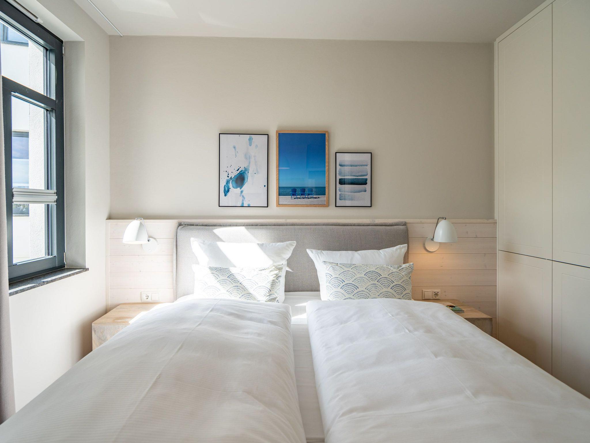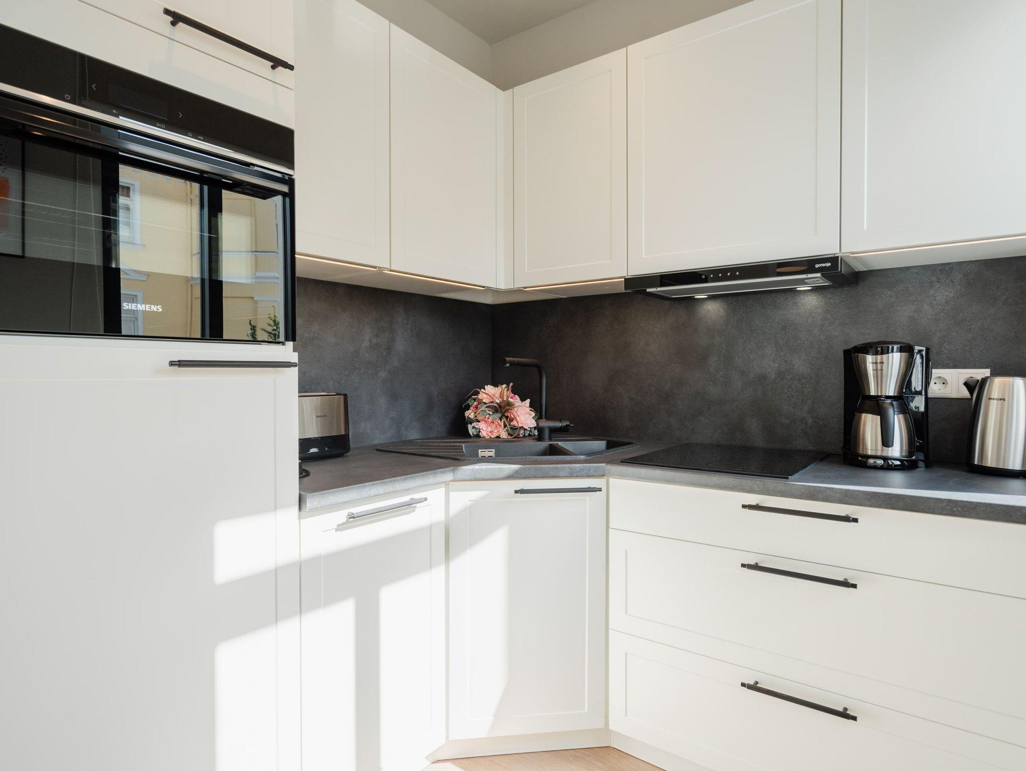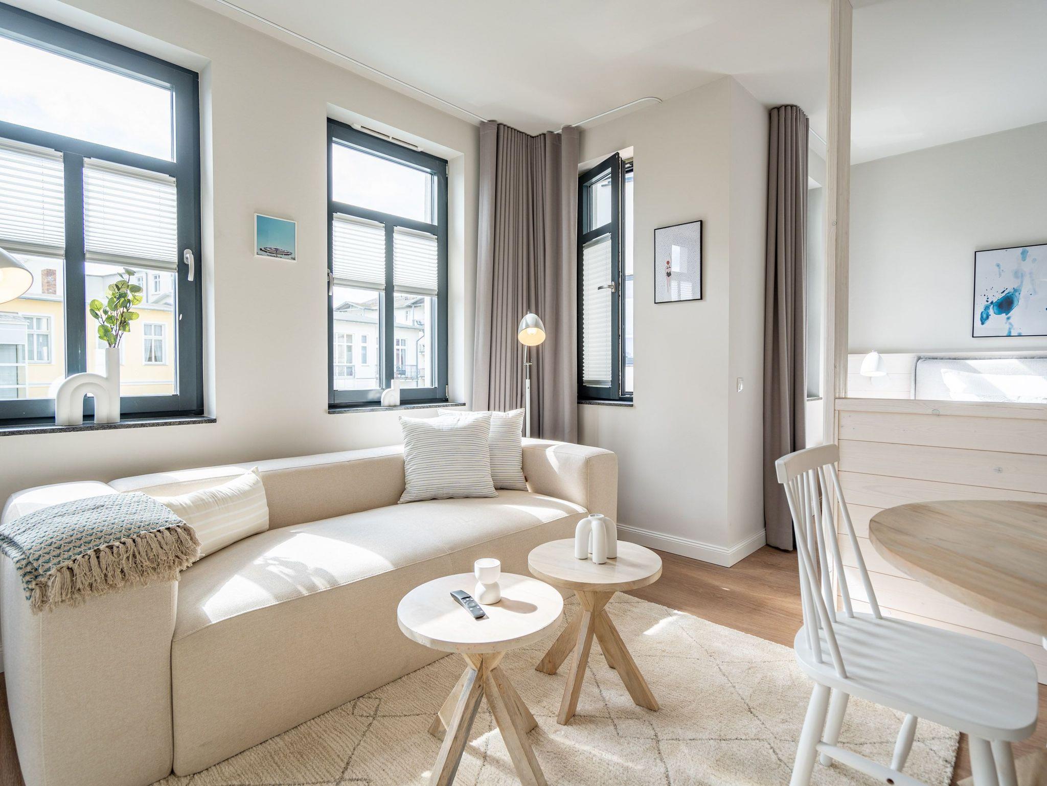Willkommen in diesem schnuckeligen und behaglichen 1-Raum-Appartement A1.6 im ersten Obergeschoss. Auf dieses 36 Quadratmeter große Urlaubsdomizil passt das Wort Hygge perfekt. Denn es strahlt eine ungeheure Gemütlichkeit aus. Klein, aber oho, kann man hier nur sagen. Denn das Appartement für 2 Personen bietet aus seinem Erker einen seitlichen Blick auf die Ostsee und ist mit allem ausgestattet, was man sich für eine entspannte Auszeit nur vorstellen kann. Der offene Wohn- und Essbereich ist mit einem schönen Essplatz, einem gemütlichen Sofa und einem 43-Zoll-Flachbildfernseher ausgestattet. Helles Holz und helle Möbel sorgen für Leichtigkeit und Offenheit. Das komfortable Boxspringdoppelbett (1,80m x 2,00m) verspricht süße Träume und einen erholsamen Schlaf. Der maßgefertigte Kleiderschrank bietet viel Platz für die Urlaubsgarderobe. Auch die Küche wenn auch klein hat es in sich. Hochwertige Markengeräte von Siemens und eine Vollausstattung machen vom Frühstück bis zum Abendessen das Zubereiten und Kochen zu einem reinen Vergnügen. Das innenliegende Bad ist mit einer Dusche, einem WC und einem Waschtisch ausgestattet. Damit Sie sich nicht noch um einen Parkplatz kümmern müssen, steht Ihnen ein PKW-Stellplatz in der Tiefgarage zur Verfügung. Erleben Sie ein paar unvergesslich schöne Tage an der Ostsee und lassen Sie sich von diesem charmanten Domizil verzaubern. Es ist der ideale Rückzugsort mit viel Behaglichkeit.