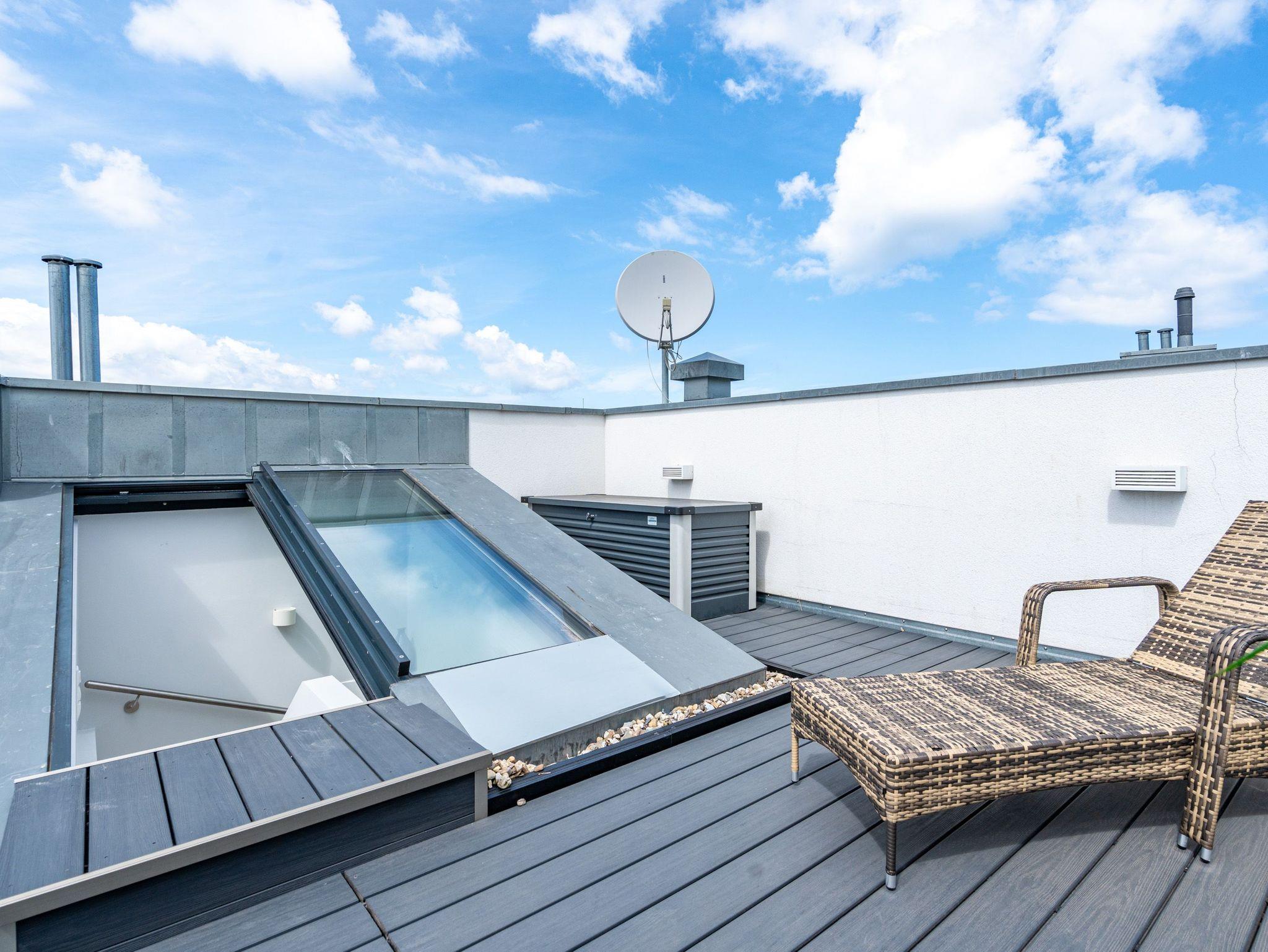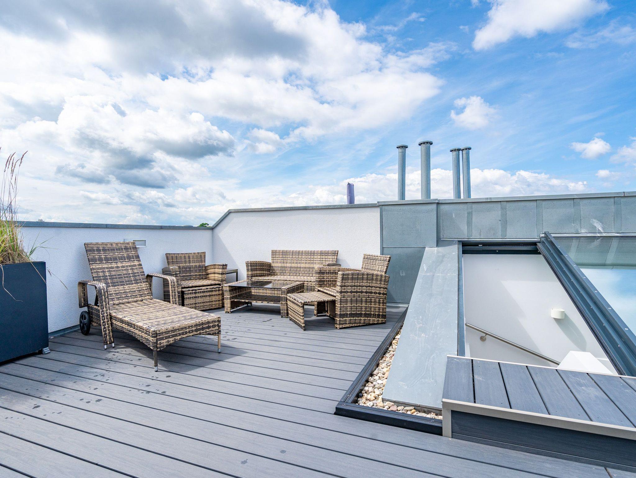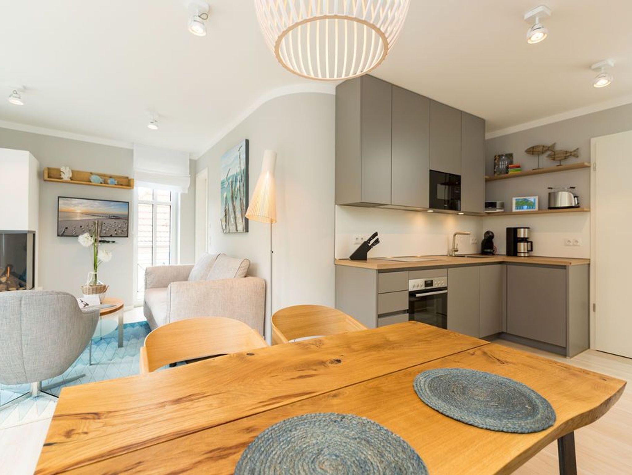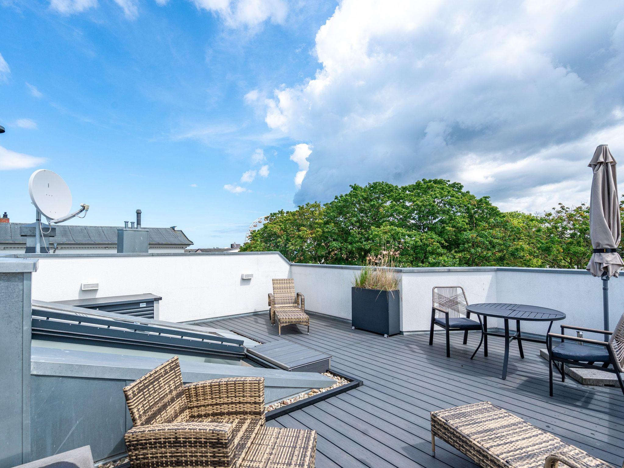 Dem Himmel so nah ? so können Sie sich in dieser 55 Quadratmeter großen Zwei-Zimmer-Wohnung fühlen. Für zwei Personen ist das kleine Paradies im 2. Obergeschoss der ideale Auszeitort an der Ostsee. Hinauf bringt Sie der Fahrstuhl. Das Wohnzimmer ist hell und geräumig und mit viel Liebe eingerichtet. Kleine Accessoires sorgen für das besondere Flair. Die bodentiefen Fenster lassen viel Licht ein. Für Gemütlichkeit sorgt das bequeme Sofa mit Sessel. Ob Gas-Kamin oder der 40 Zoll große Flat-TV mit Blue Ray Player ? unterhaltsam und romantisch kann es hier auf alle Fälle werden. Das WLAN ist kostenfrei nutzbar. Auch im Winter ist das Appartement wunderbar warm und kalte Füße, brauchen Sie in Ihrem Urlaub auf Usedom nicht zu fürchten. Denn die Wohnung hat Fußbodenheizung. Das Wohnzimmer hat Zugang zu einem kleinen, aber feinen und sonnenüberfluteten Balkon (4 Quadratmeter). Von hier aus haben Sie sogar Blick auf die Ostsee. Das Wohnzimmer öffnet sich zudem zur Wohnküche hin. Ein schöner Echtholztisch, zwei Stühle und eine urige Sitzbank eignen sich für ausgiebige Dinner genauso gut wie für das gemeinsame Zusammensitzen. Ob Induktionsherd, Mikrowelle, Kühlschrank, Geschirrspüler oder Kaffeemaschine ? die Küche ist mit hochwertigen Markengeräten voll ausgestattet. Das Schlafzimmer ist eine kleine Wohlfühl-Oase. Denn die ausgewählte Einrichtung hat Stil. Das große und komfortable Boxspringdoppelbett (1,80 m x 2,00 m) sorgt für herrliches Schlafvergnügen. Die Betten sind bei der Anreise bereits bezogen. Der Einbauschrank bietet viel Platz für die Garderobe. Auch in diesem Zimmer befindet sich ein Flat-TV. Alles in diesem Feriendomizil ist luftig und offen. Auch das ebenso lichte Tageslicht-Bad strahlt diese besondere Atmosphäre aus. Es verfügt neben der Dusche, einem Waschtisch und WC über eine eigene Finnische Sauna. Entspannen wird hier zum Wohnkonzept. Handtücher liegen für Sie bereit. Doch das eigentliche Highlight des Appartements befindet sich eine Etage höher. Eine 36 Quadratmeter große Dachterrasse. Hier oben können Sie das Sonnenbad zelebrieren oder ganz entspannt zusammen essen. Über den Dächern des Kaiserbades, in unmittelbarer Nähe zum Meeresrauschen werden Urlaubsmomente unvergesslich. Und sollten Sie doch einmal hinunter in die Tiefgarage müssen, wartet dort Ihr Auto auf dem Stellplatz Nummer 9. In den Monaten April bis Ende Oktober steht Ihnen für Ihre Fahrräder auch ein wohnungseigener Kellerraum zu Verfügung.