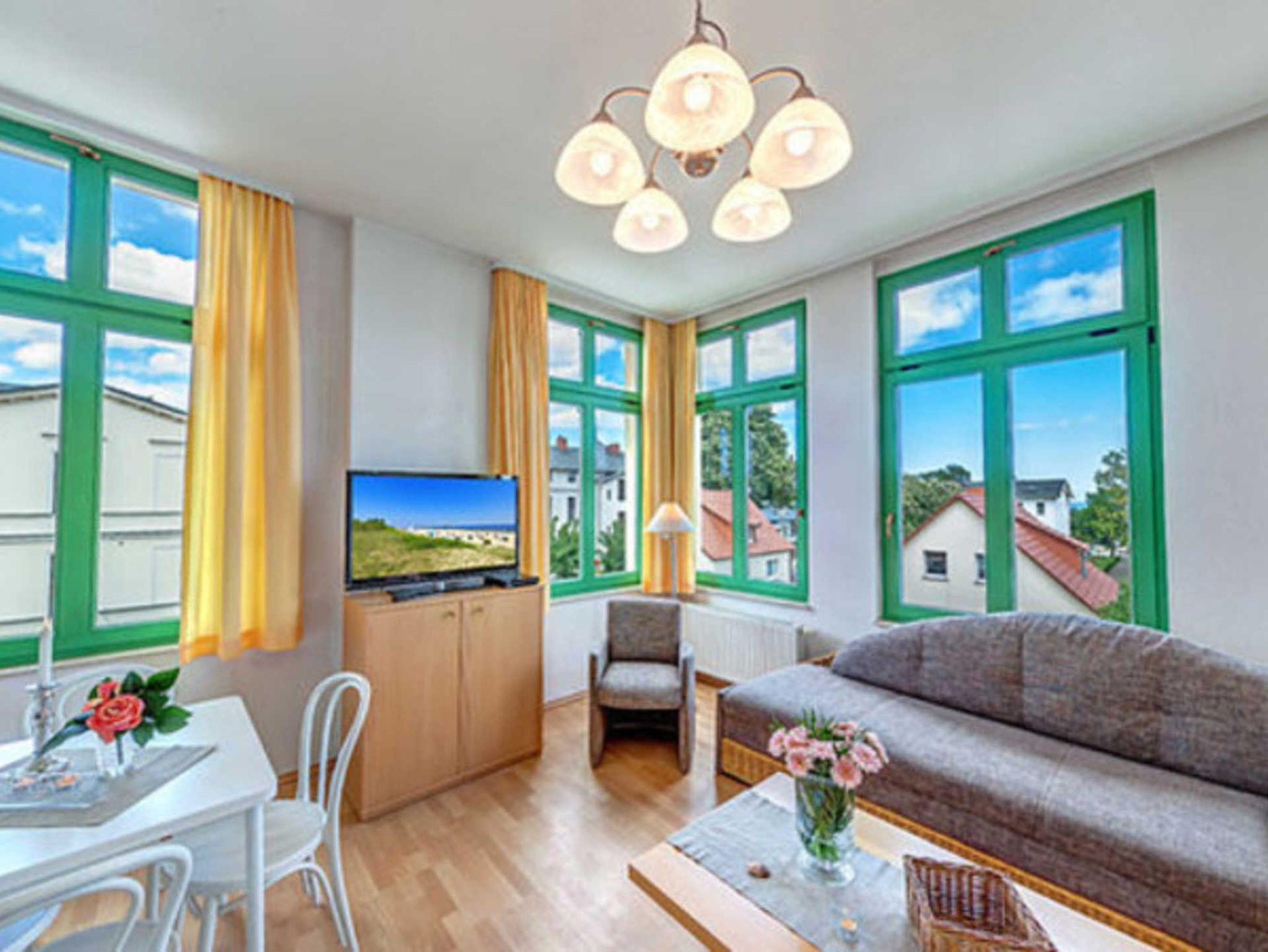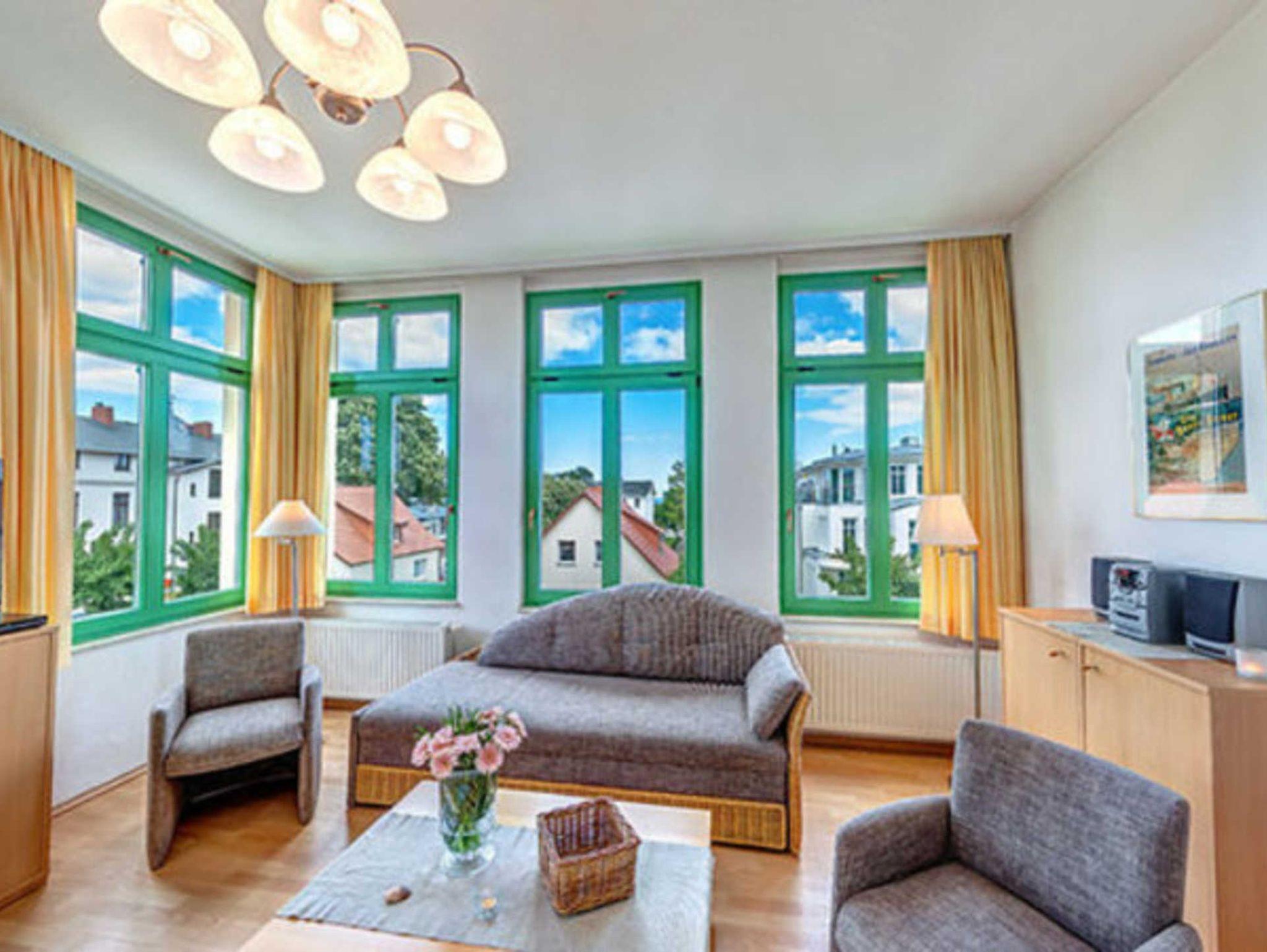 STRANDNAH mit BALKON! Nur ca. 100 m zur Strandpromenade! Schönes geräumiges 2-Zimmer-Apartment mit gemütlicher und guter Ausstattung. Separates Schlafzimmer, Schlafcouch im Wohnzimmer, vollwertige Küchenzeile mit Essplatz, Duschbad, zus. Gäste-WC, kleiner Vorflur, Balkon. Die Wohnung verfügt über einen Pkw-Stellplatz . Abstellraum für Fahrräder und ähnliches ist vorhanden. Eine Sauna in der Villa Germania kann kostenpflichtig genutzt werden. Vom Haus aus können Sie das Ortszentrum und die bekannte Ahlbecker Seebrücke in ca. 3 bzw. 5 Minuten zu Fuß erreichen.