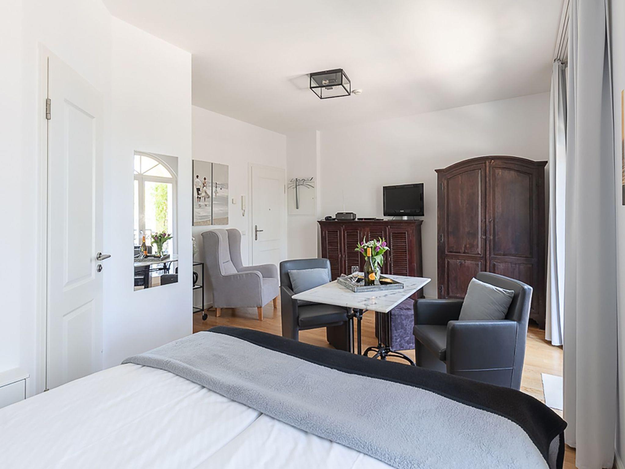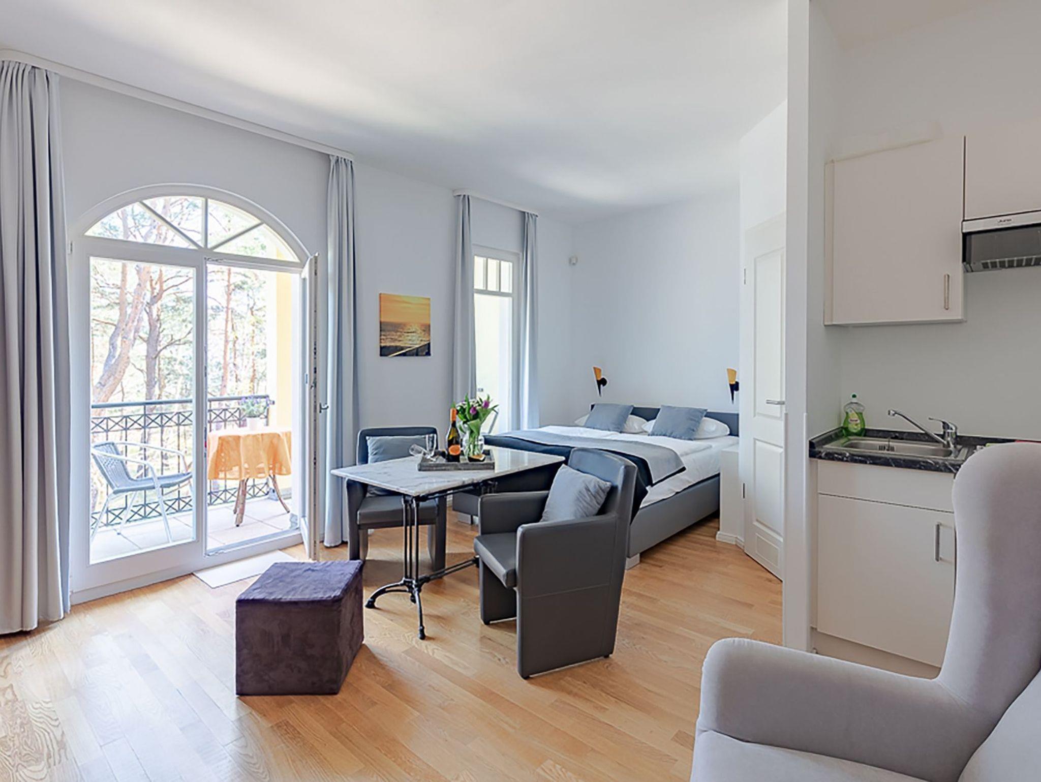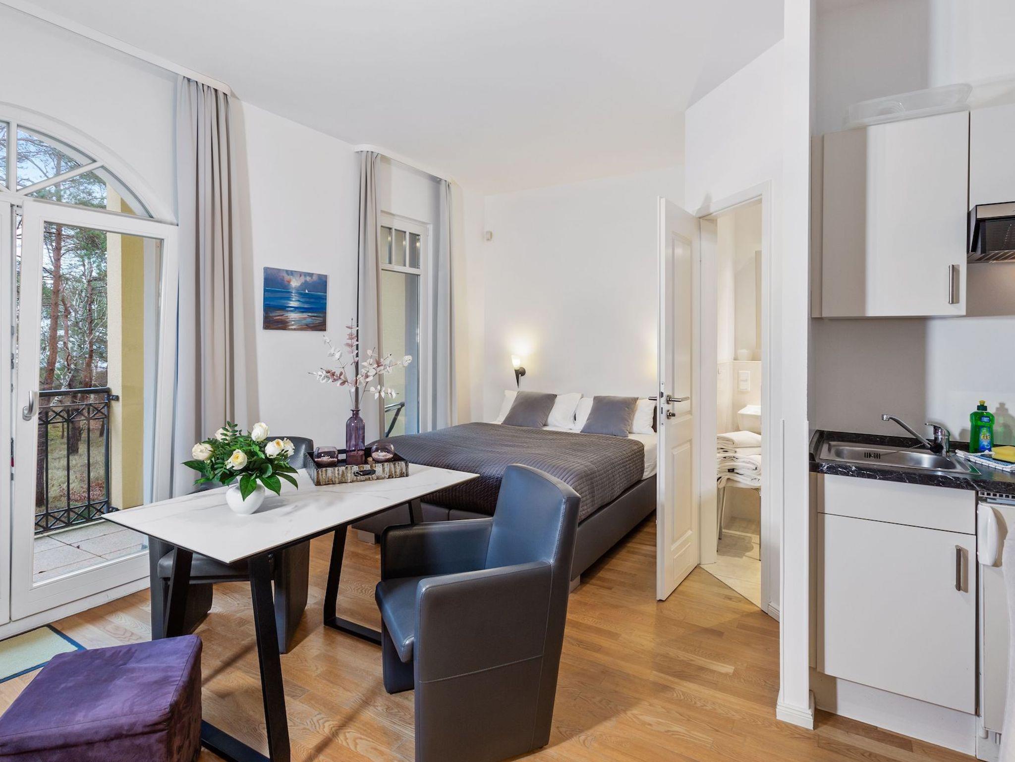 Gemütliches 1-Raum-Apartment in der Villa Lebensart mit Meerblick, Balkon und Zugang zum Wellnessbereich, nur wenige Schritte vom Strand in Ahlbeck entfernt.