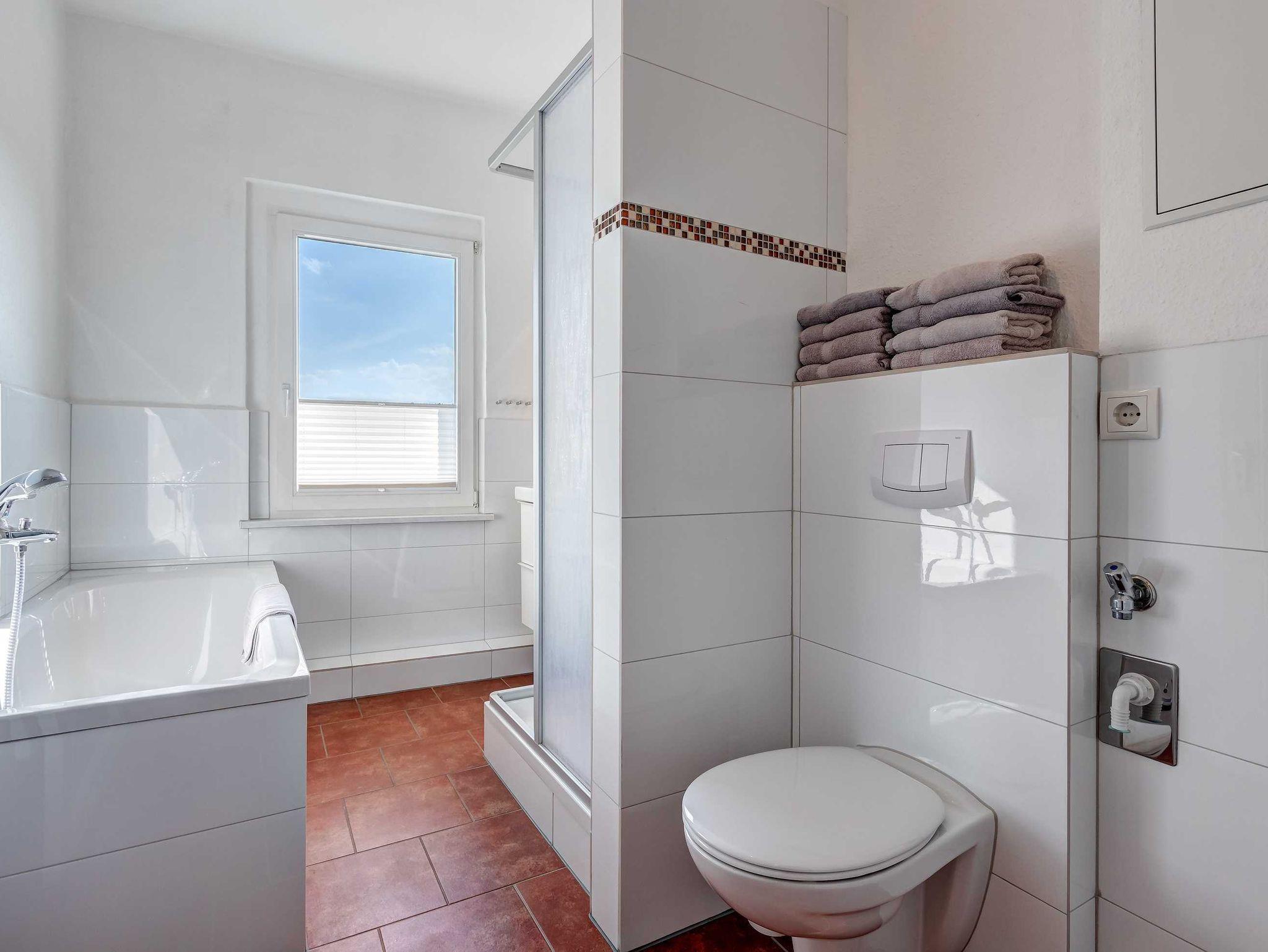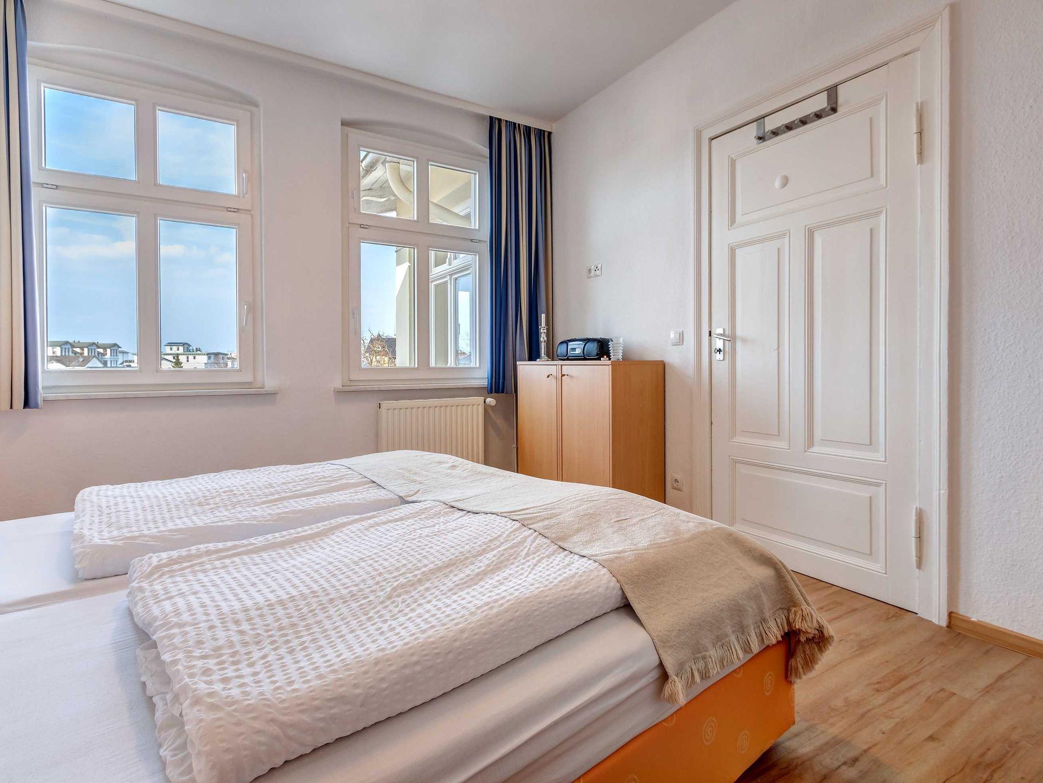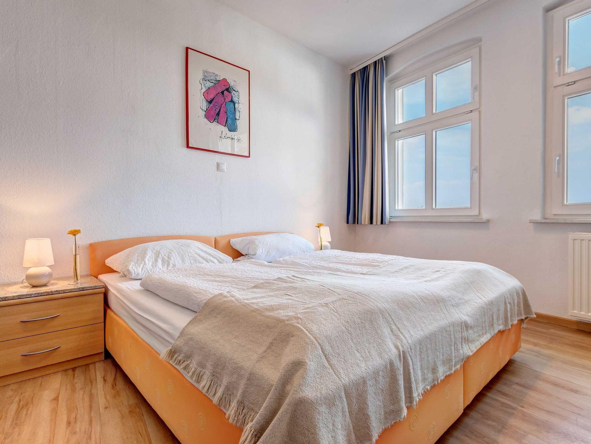 Strandnah! Ruhige Lage! Großer Balkon! Schöner Weitblick aus der verglasten Veranda! Diese großzügige, 2014 renovierte 4-Raum-Wohnung, hat 3 Schlafzimmer und ist für bis zu 6 Personen (2 Doppelbetten 1,80m breit, 1 Doppelbett 1,60m breit). Im Wohnzimmer befinden sich eine Couch, ein Flachbildfernseher und eine offene Küche mit amerikanischem Kühlschrank. Der Essplatz befindet sich in der verglasten Veranda mit schönem Weitblick. Die Küche ist mit einem Backofen, Kaffeemaschine, Wasserkocher, Mikrowelle, Geschirrspüler und Toaster ausgestattet. Die 2 Bäder sind mit Badewanne und Duche bzw. nur Dusche ausgestattet, wobei 1 Bad En-Suite ist! Die Ferienwohnung befindet sich in der 1. Etage. Zur Wohnung gehört ein kostenfreier Pkw-Stellplatz auf dem Grundstück.