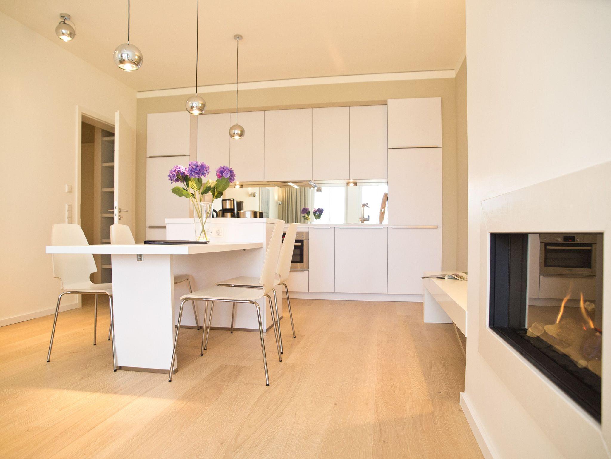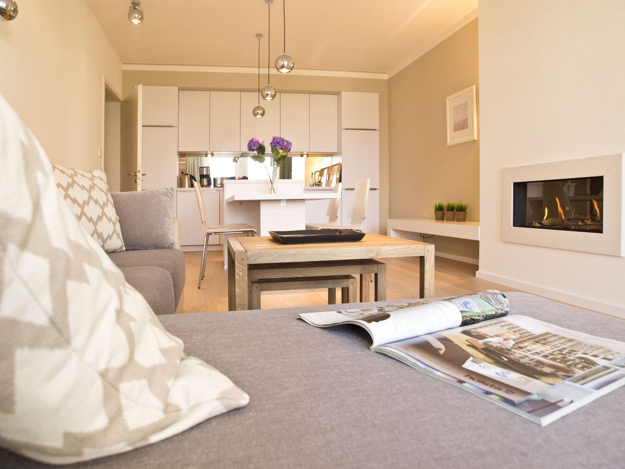 Esprit und Charme versprüht diese wunderschön gestaltete 3-Raum-Ferienwohnung im Erdgeschoss des Hauses. Ein edler, heller Dielenboden wurde von versierter Architektenhand geschickt mit einer modernen exklusiven Einrichtung kombiniert. Entstanden ist ein Wohlfühldomizil für 4 Personen und ein Kleinkind (bis 3 Jahre im Kinderreisebett). Der schöne Wohnbereich mit bequemer Sitzgruppe schließt sich an die offene Küche mit Essplatz an. Ein besonderes Highlight ist hier der Gaskamin, der per Fernbedienung ein tolles Ambiente zaubert. Die beiden Schlafzimmer (1x mit Flat-TV) mit Boxspringbetten (1,80m) sind mit komfortablen Einbauten ausgestattet. Für Ihren Komfort steht die Erstausstattung Wäsche für Sie bereit. Ein großes Bad mit Badewanne und Echtglasdusche und eine schöne Terrasse mit Strandkorb und Gartenmöbel zur Nordseite runden die Wohnung ab. Auf Wunsch stellen wir ein Kinderreisebett (ohne Matratze [&] Bettzeug) und einen Kinderhochstuhl gegen einen Aufpreis zur Verfügung. Ein PKW-Stellplatz steht Ihnen vor dem Haus zur Verfügung. Das WLAN-Netz ist kostenfrei nutzbar.