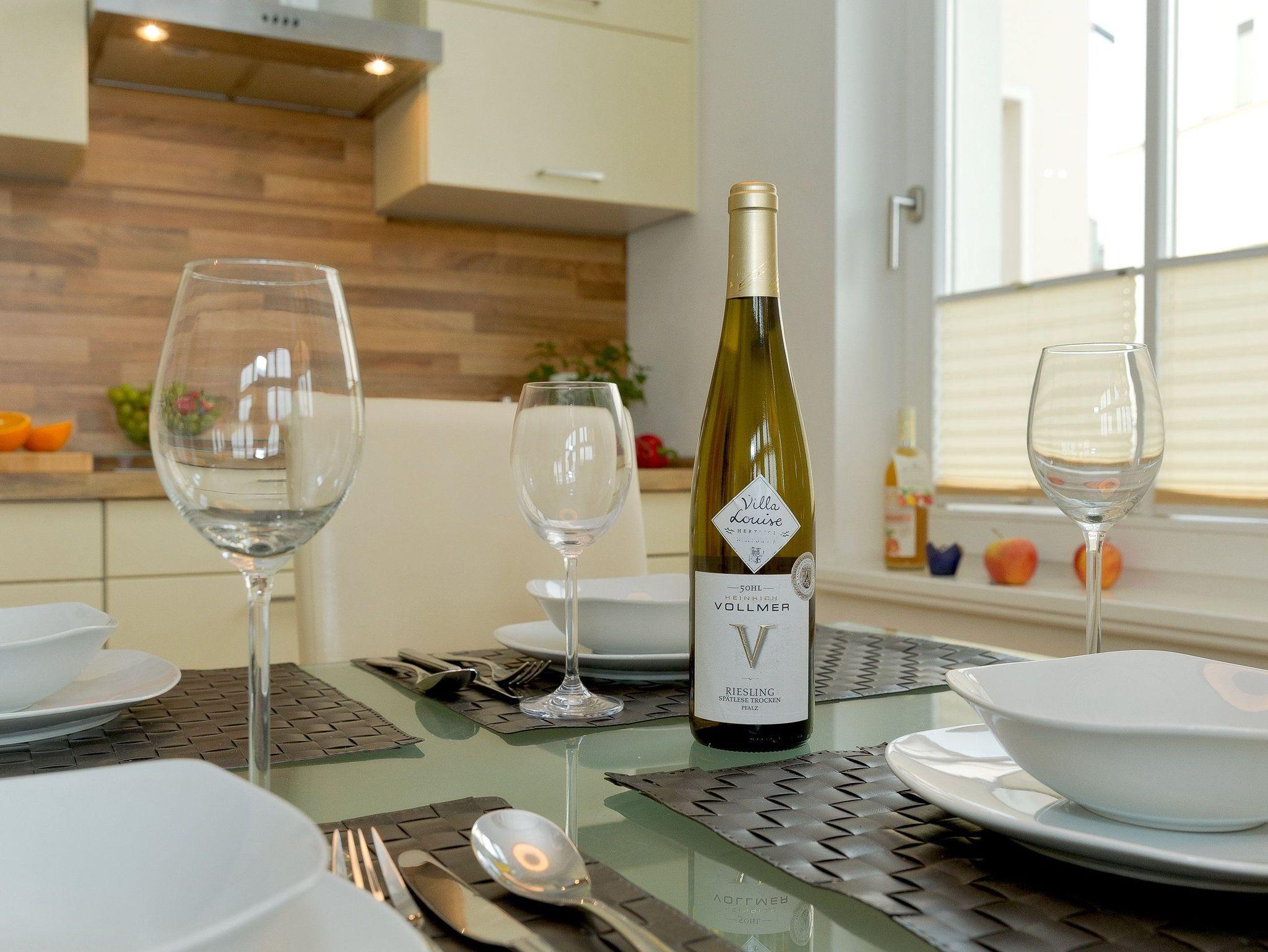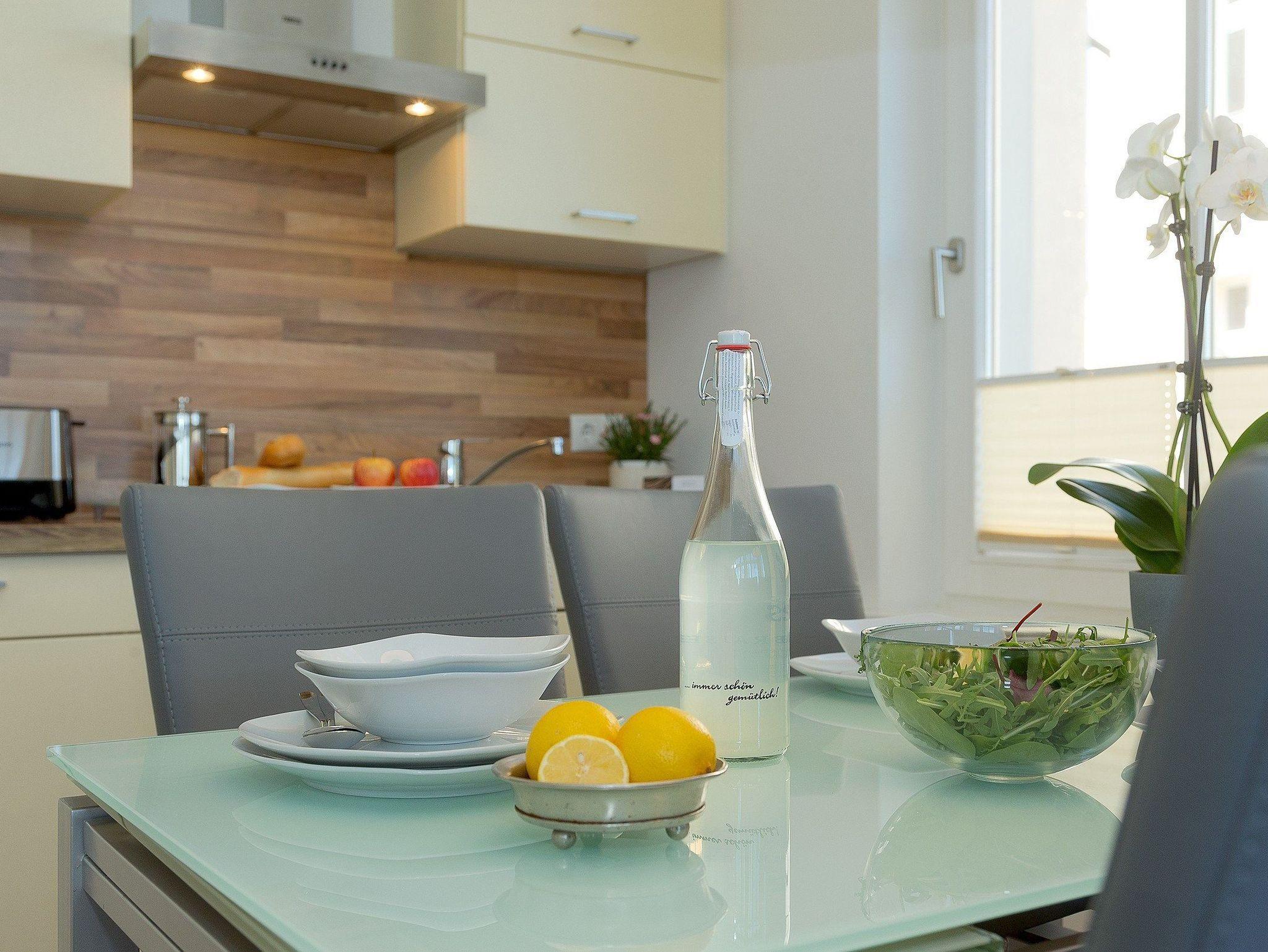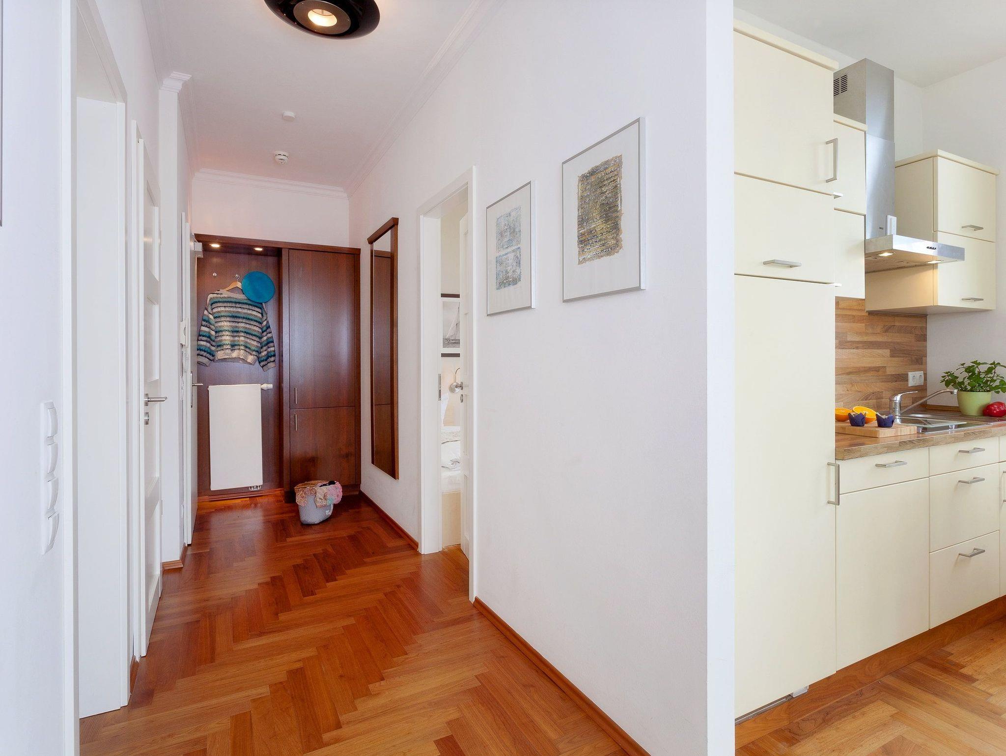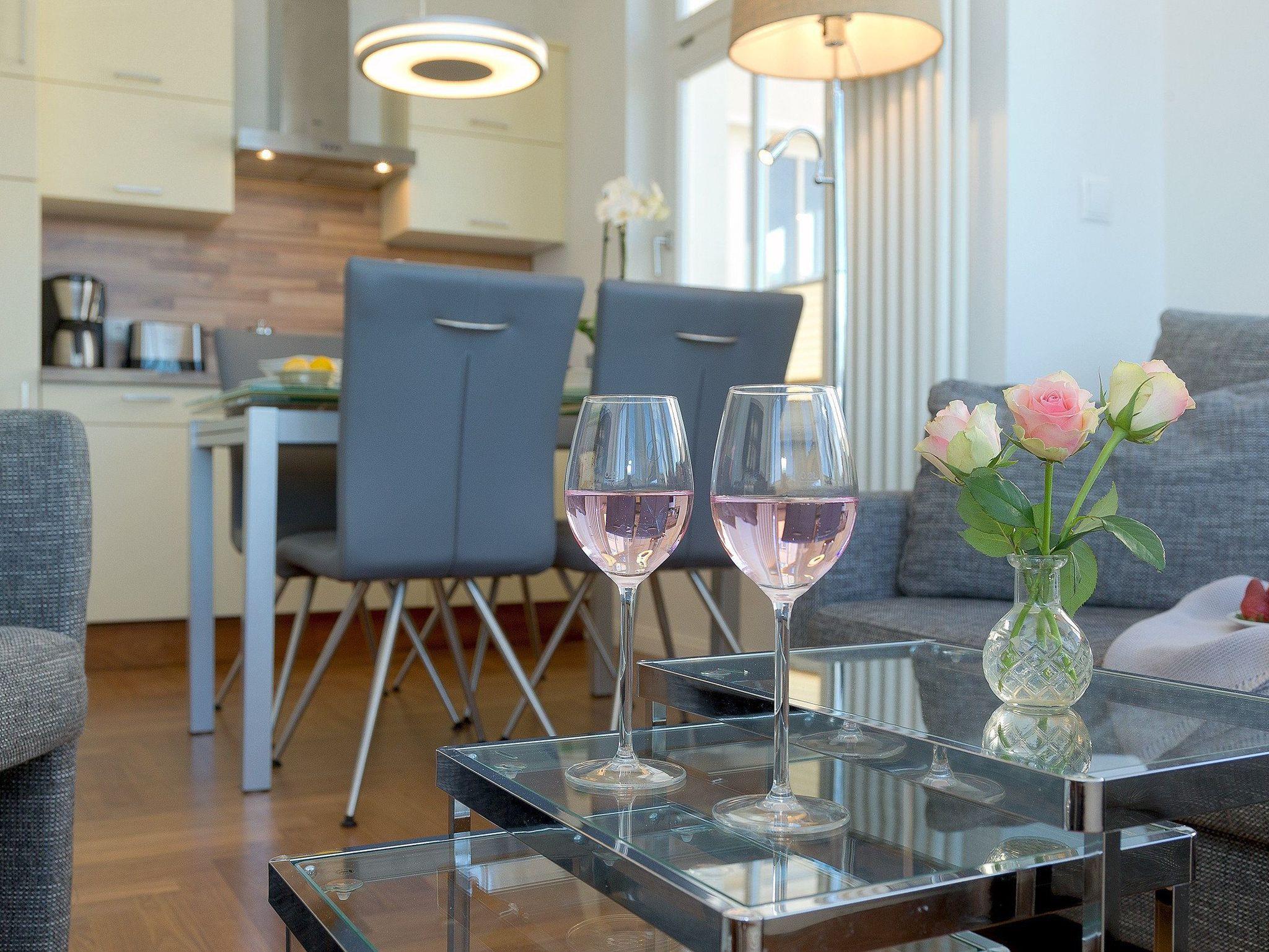 Das 3-Zimmer Appartement befindet sich im 1. Obergeschoss und bietet mit seinen 55 Quadratmetern ausreichend Platz für bis zu vier Personen. Das Interieur ist in hellem beige gehalten, wodurch eine gemütliche und gleichzeitig edle Atmosphäre entsteht. Der kombinierte Wohn- und Kochbereich ist mit einer hochwertigen Küchenzeile ausgestattet, die Dank Geschirrspüler, Kaffeemaschine, Wasserkocher, Toaster, Kühlschrank mit Gefrierfach und einer Mikrowelle mit Backfunktion keine Wünsche offen lässt.