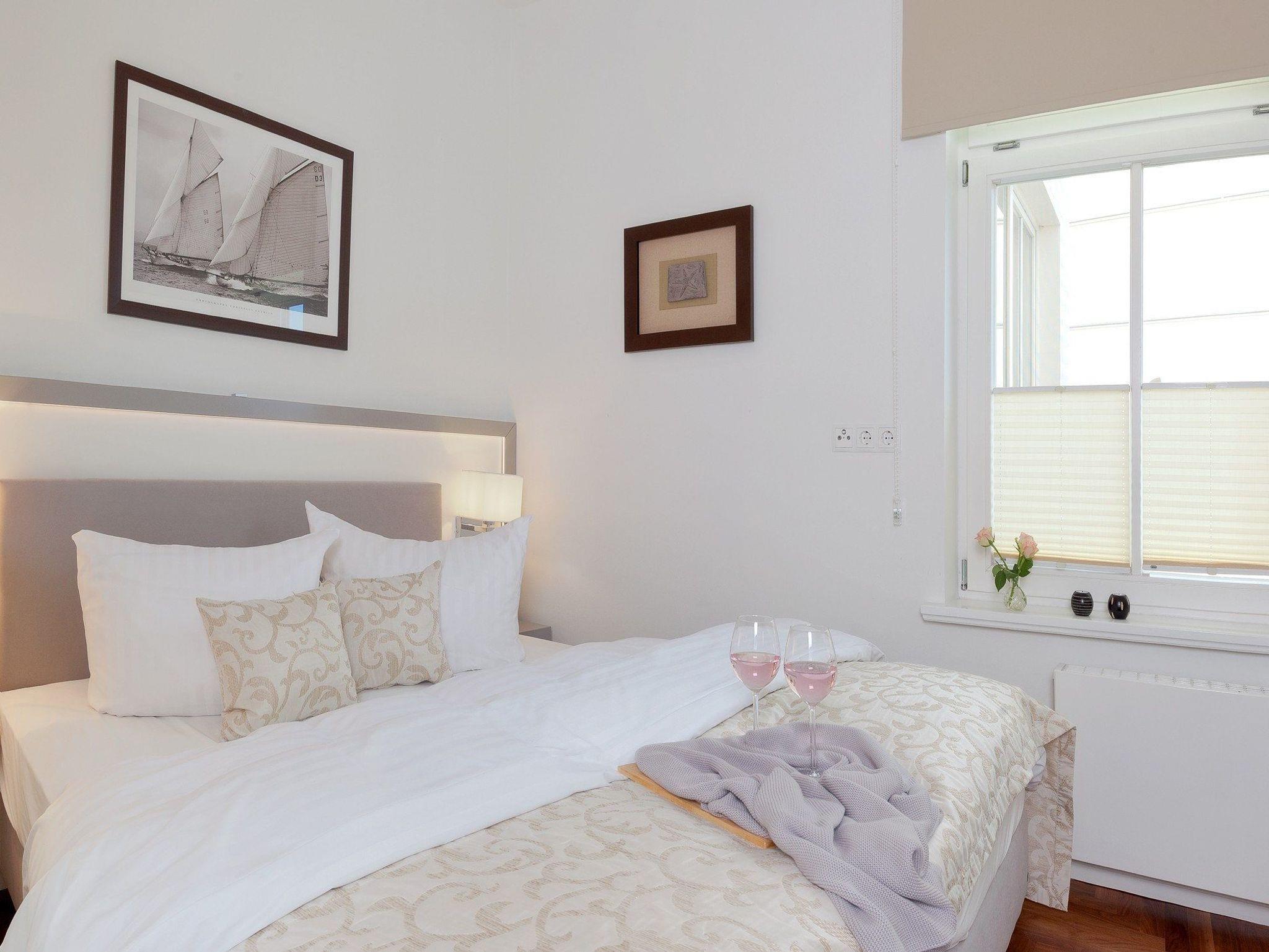 Die Polstersitzecke lädt zum Entspannen ein. Außerdem steht ein Flachbildfernseher mit integriertem Radio für Sie bereit. Und nicht nur das! Vom Sofa aus haben Sie eine fantastische Aussicht auf das Meer, die zum Träumen einlädt. Für die Nachtruhe steht im Schlafzimmer ein bequemes Boxspringbett (180 x 200cm / zwei getrennte Matratzen) mit Flat TV bereit. Auch von hier können Sie den Blick über das glitzernde Meer gleiten lassen. In dem geräumigen Schrank bringen Sie problemlos Ihre Habseligkeiten unter. Ein weiteres Schlafzimmer ist ebenfalls mit einem komfortablen Doppelbett und einem maßangefertigen Kleiderschrank eines usedomer Tischlers ausgestattet. In beiden Schlafräumen sind Plissees angebracht, so dass Sie die Räume bei Bedarf ganz einfach abdunkeln können.