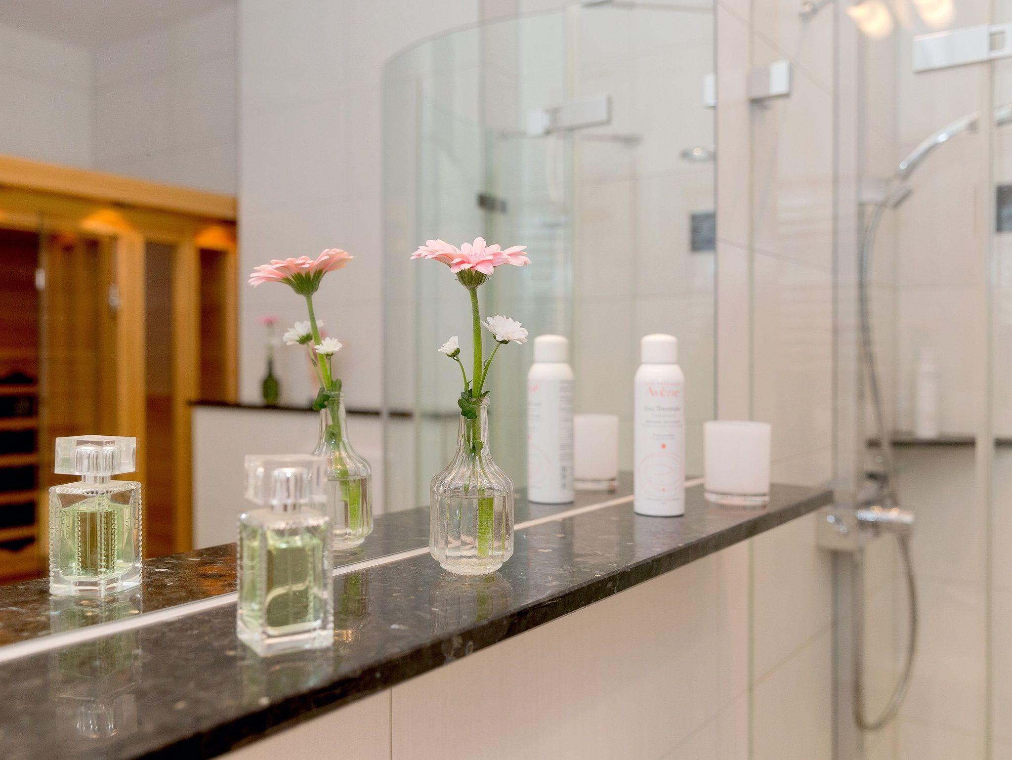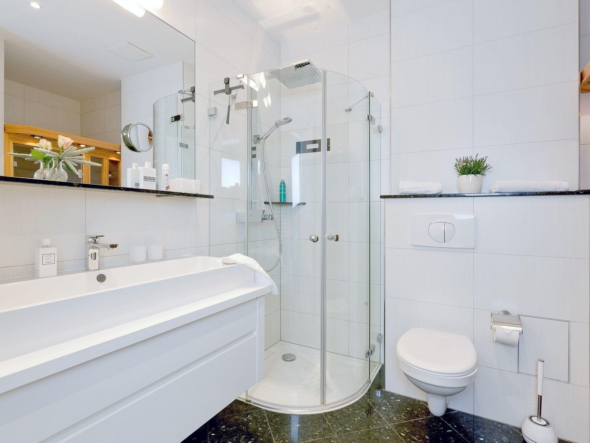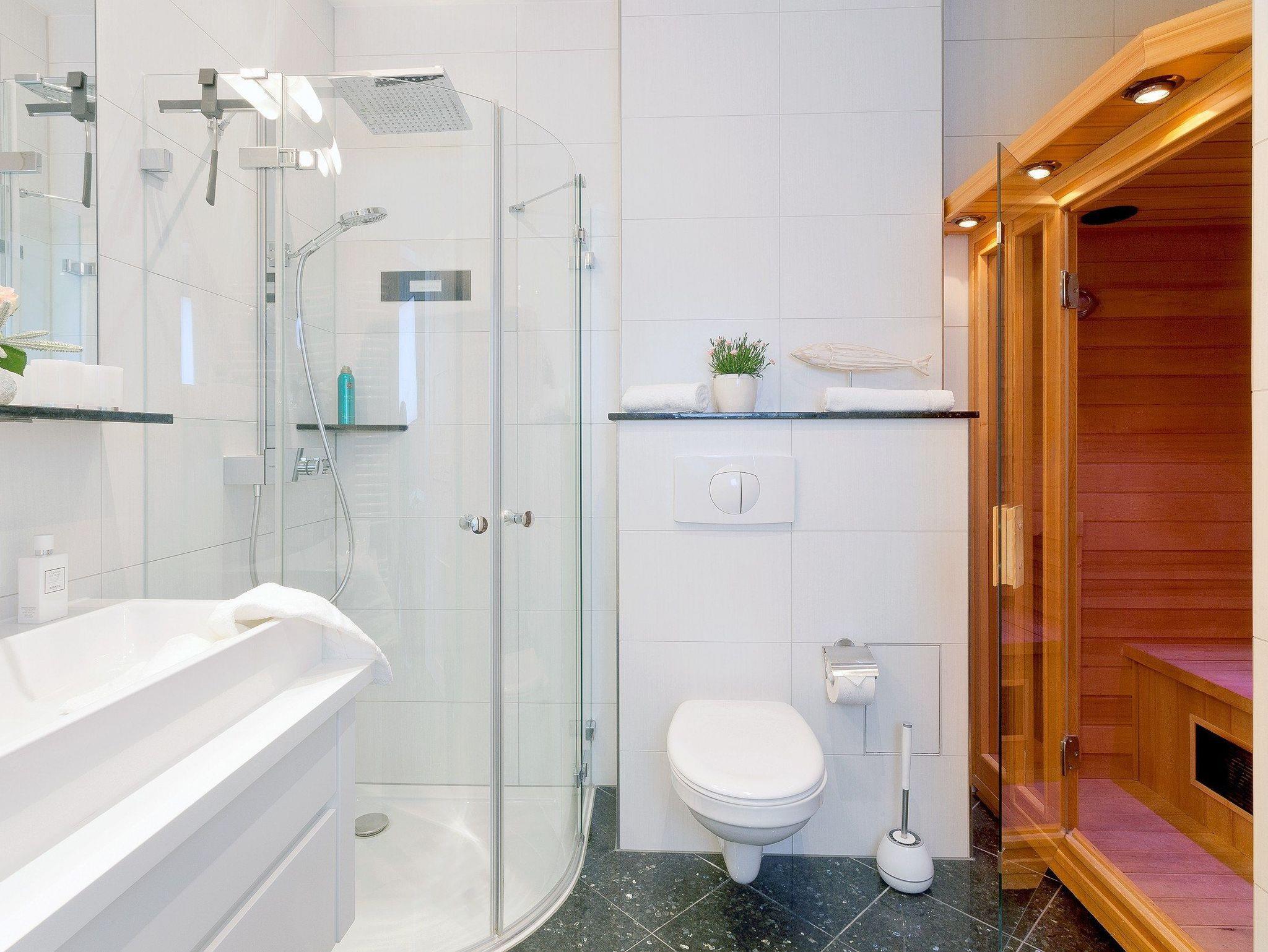 Ein absolutes Highlight ist das komfortable Badezimmer: Es besitzt nicht nur eine Echtglas-Dusche mit bodengleicher Duschtasse. Nach einem ereignisreichen und anstrengenden Tag können Sie in der privaten Infrarotsauna die Seele baumeln lassen. Ein weiteres Bad ist mit einem WC und Waschbecken ausgestattet.