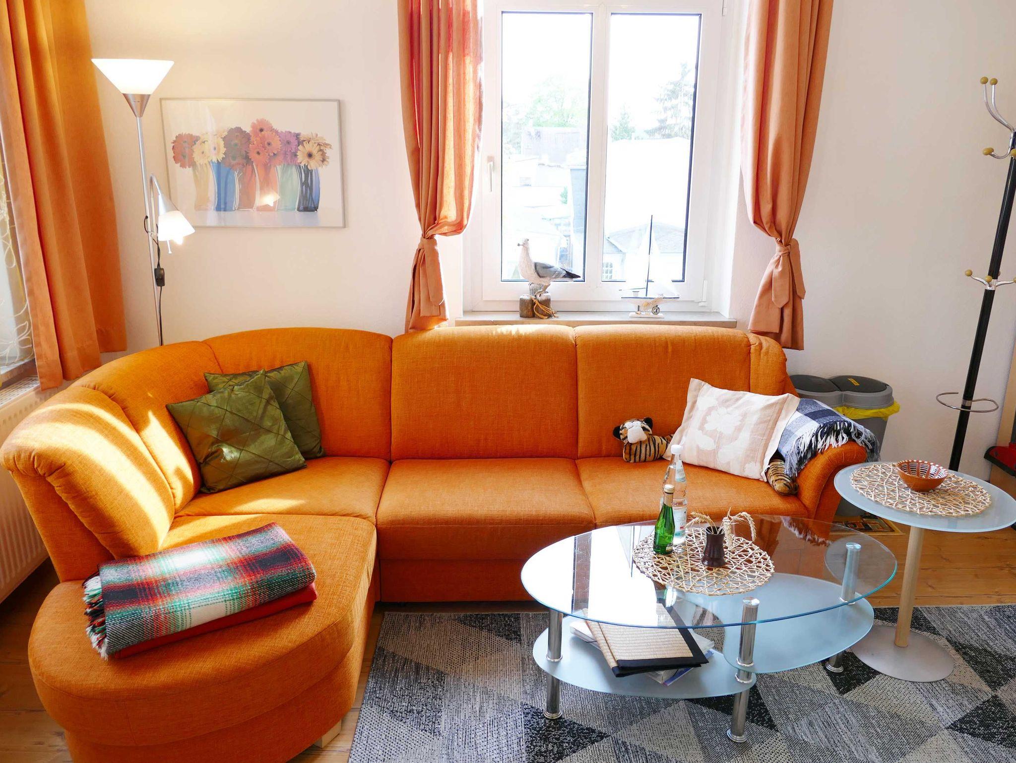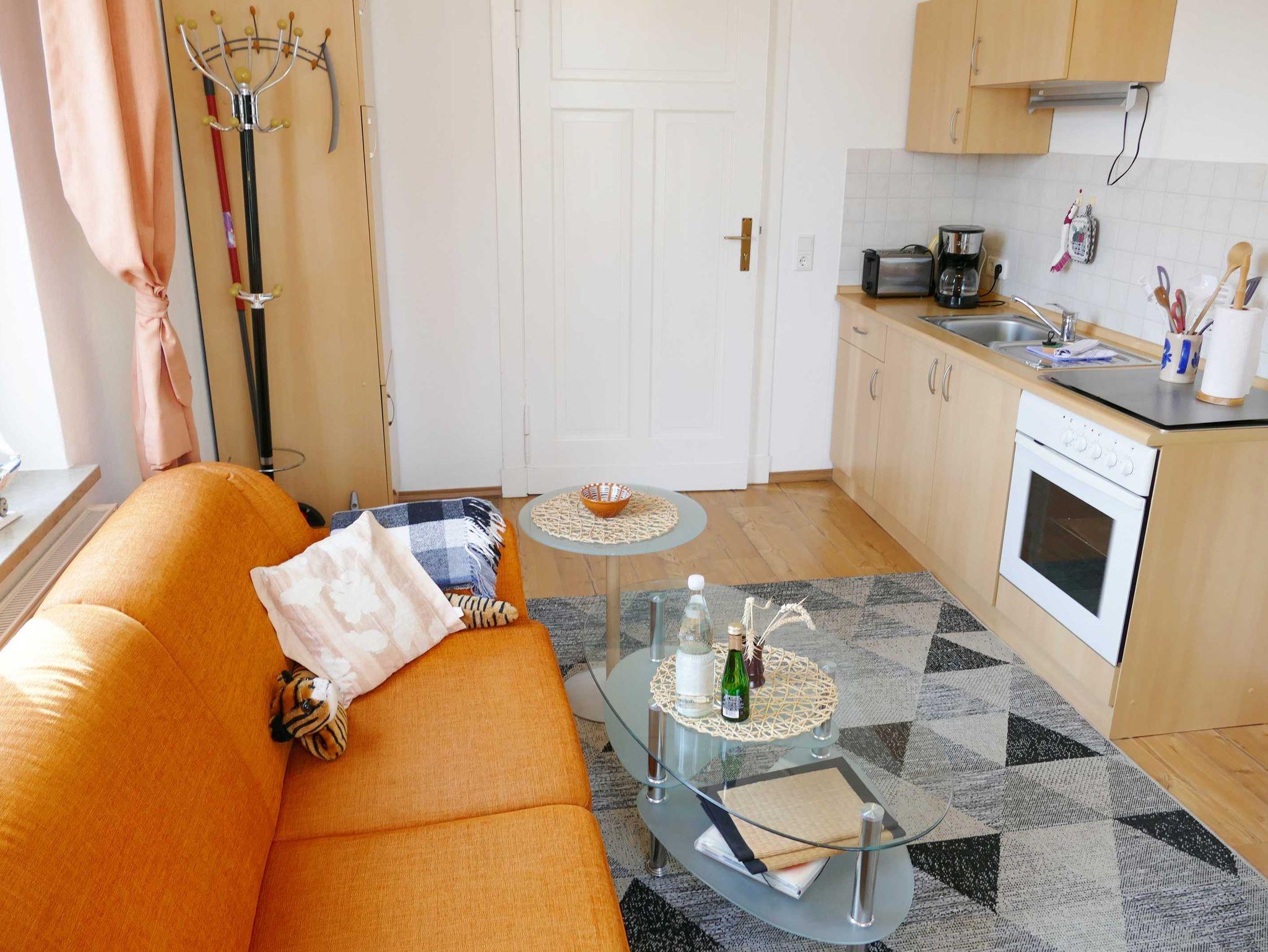 Die 40 qm große Ferienwohnung im ersten Obergeschoss verfügt über ein Wohnzimmer mit großzügiger Couchecke und integrierter Küchenzeile, ausgestattet mit Herd, Backofen, Kühlschrank, mit Tiefkühlfach, Mikrowelle, Kaffeemaschine, Toaster, Wasserkocher u.v.m.