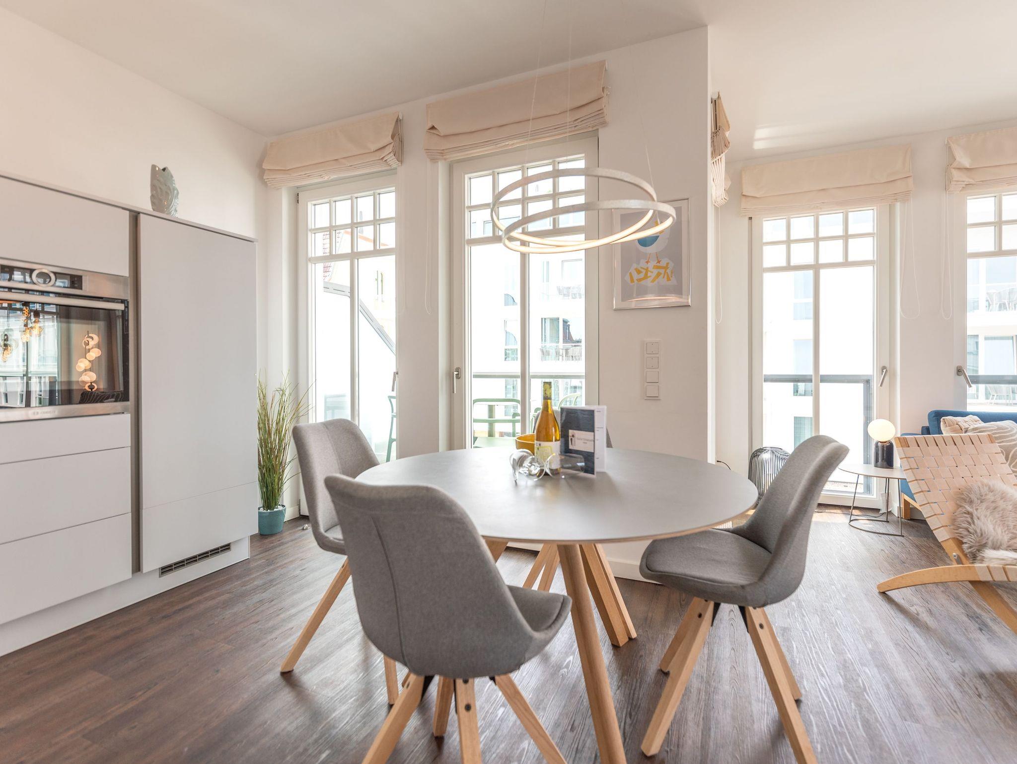• Ein heller Wohn-Essbereich mit offener, voll ausgestatteter Küche, die mit Marken-Einbaugeräten und einer Nespresso-Kaffeemaschine ausgestattet ist. Der Essbereich verfügt über einen großen runden Tisch und vier Stühle.