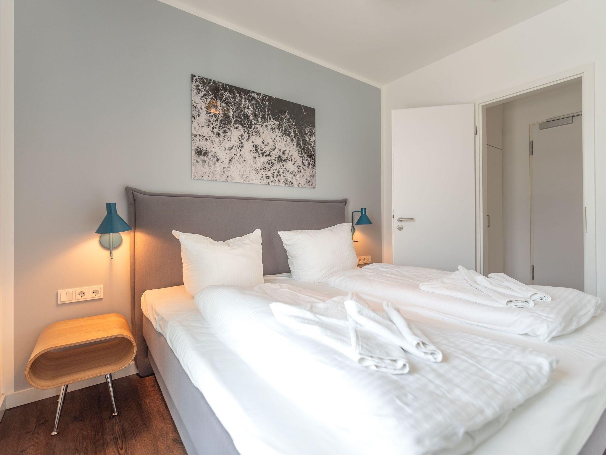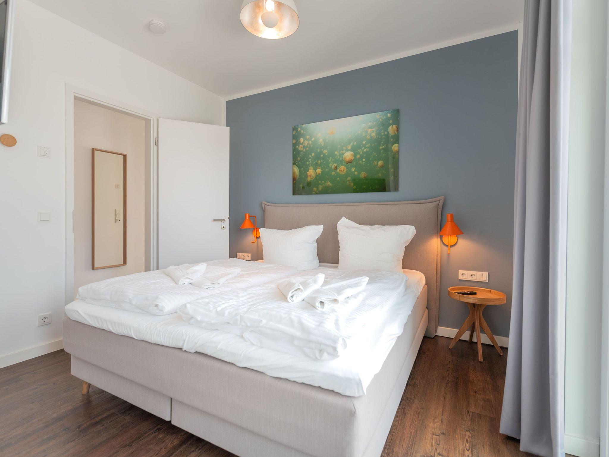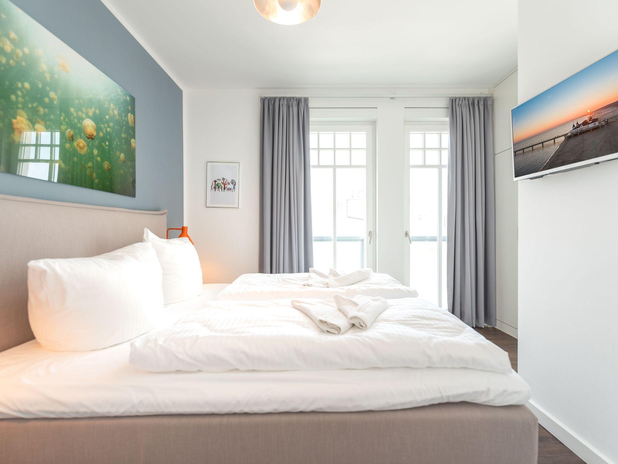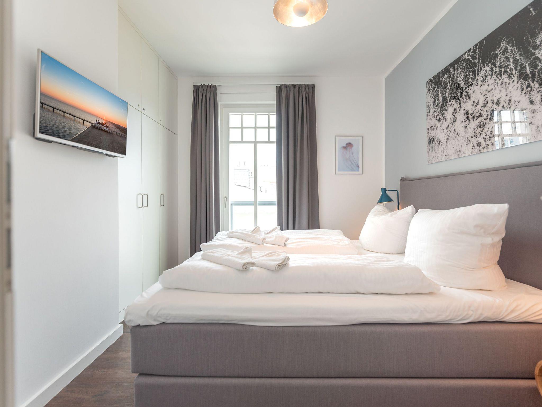 Das Quartier Schneespecht im 2. Obergeschoss ist ein exklusives 3-Raum-Appartement, das für bis zu 4 Personen konzipiert wurde und von jeder Ecke aus seitlichen Meerblick bietet. Es wurde mit viel Liebe zum Detail von einer Berliner Designerin im skandinavischen Stil eingerichtet, was eine warme und einladende Atmosphäre schafft.