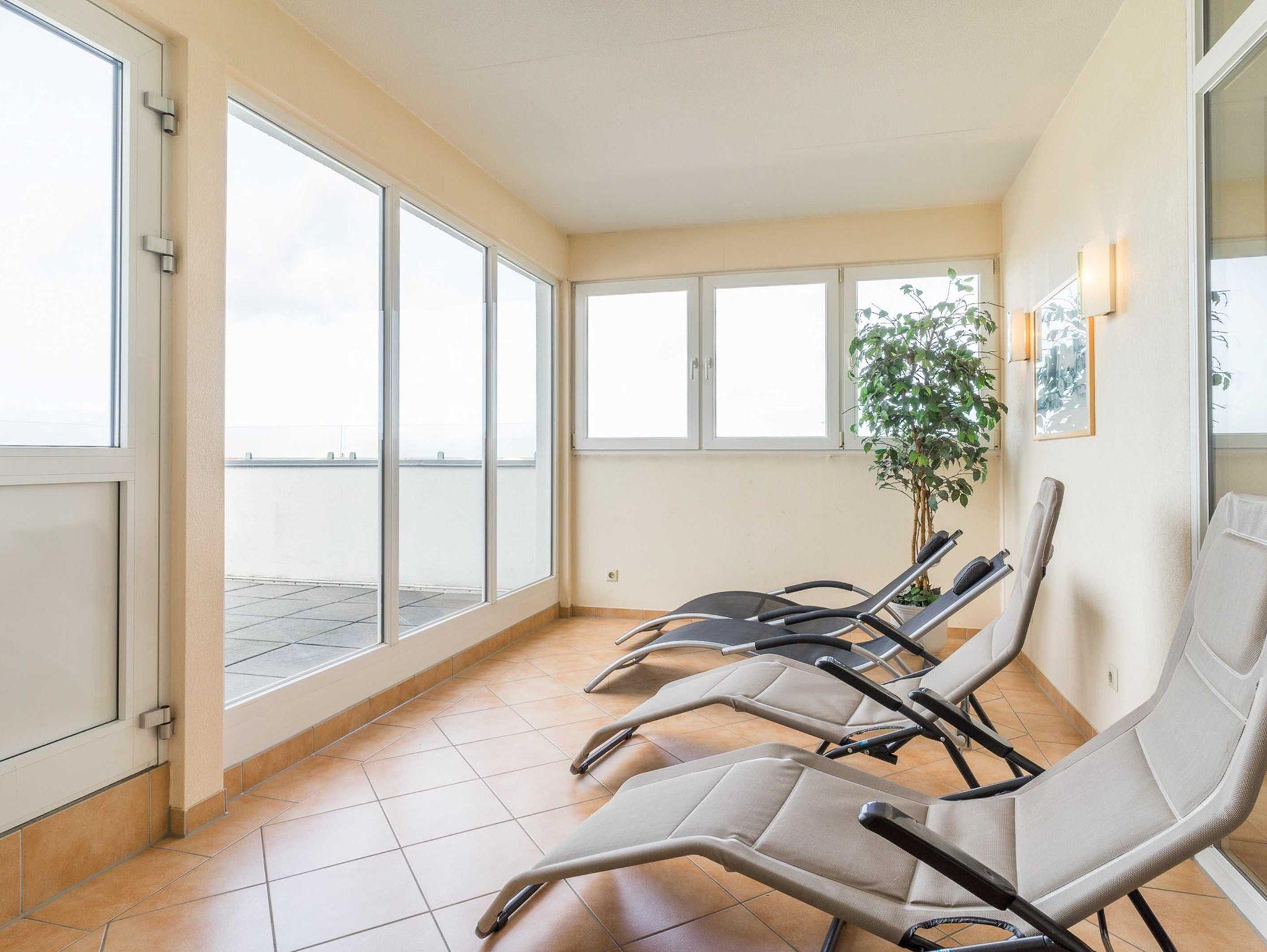 Im Haus befindet sich eine Gemeinschaftsauna mit Meerblick, Ruheraum und Dachterrasse. Im Keller befinden sich Münz-Waschmaschine und -Trockner.