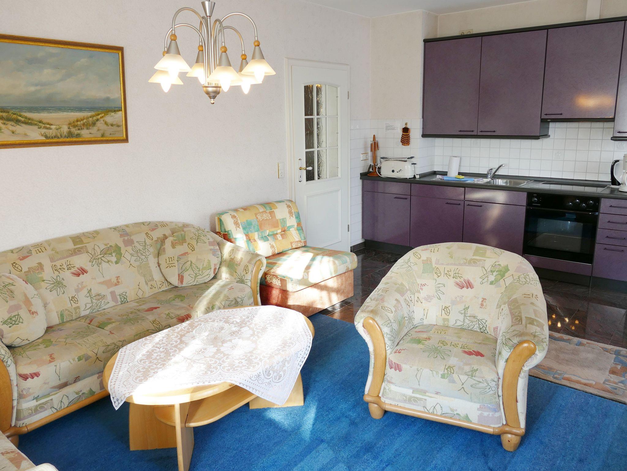 Die helle Ferienwohnung im Obergeschoss verfügt über ein gemütliches Wohnzimmer mit Sofa und einer Küchenzeile mit Backofen, Kühlschrank und Herd und Essplatz. Das Schlafzimmer verfügt über ein Doppelbett,. Bad mit Dusche und WC. Ein Balkon zur Ostseite steht ebenfalls zur Verfügung.