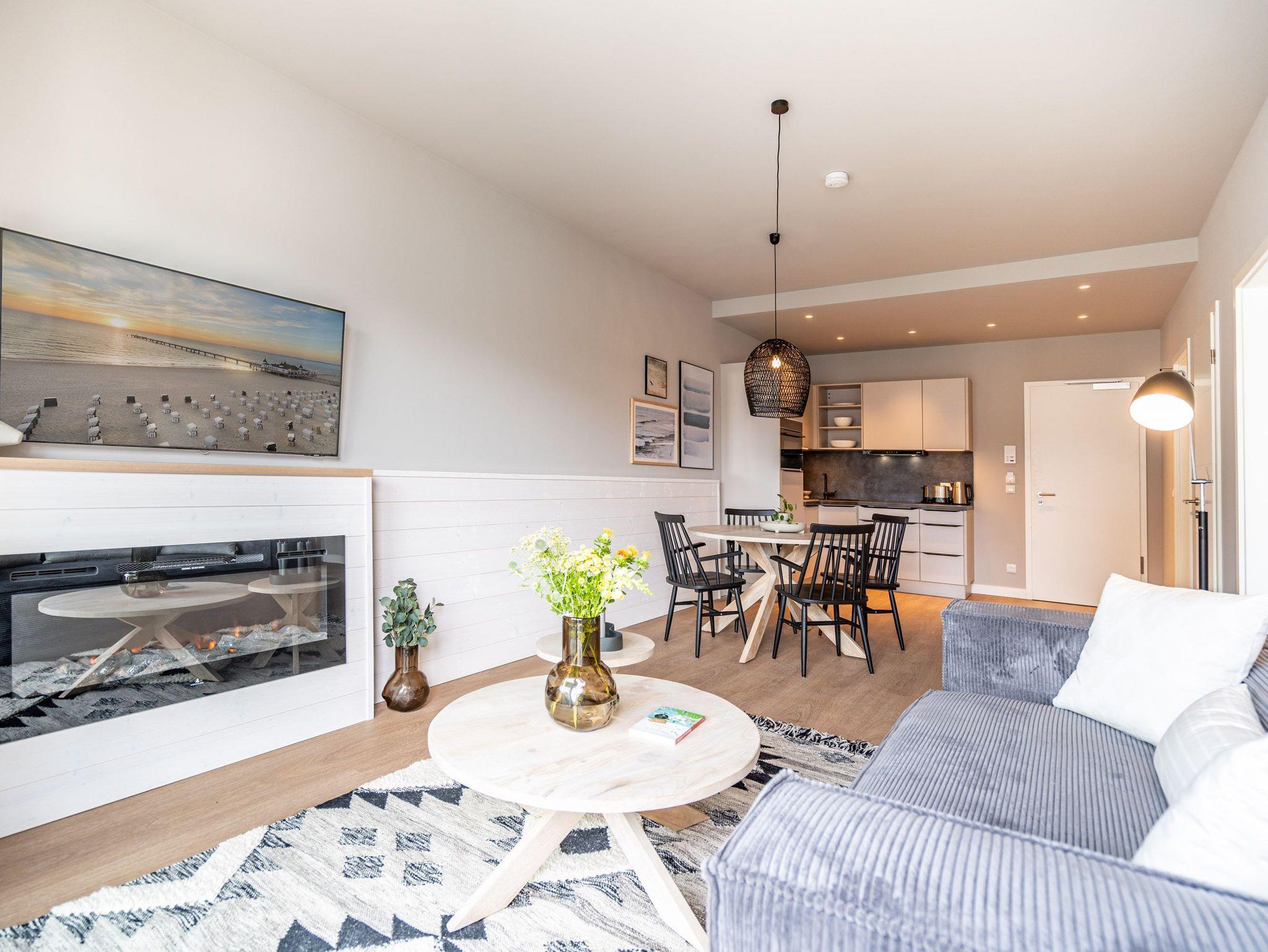 Willkommen im 2-Raum-Appartement B 2.6 (Haus B) in der Strandterrasse. Mittendrin, statt nur dabei können Sie bei diesem wunderschönen und gemütlichen Auszeitdomizil zu Recht sagen. Denn es befindet sich nur 80 Meter von der Ahlbecker Promenade und vom Strand entfernt. Die 53 Quadratmeter sind ein kuscheliges Auszeitzuhause für zwei Personen. Eine luftig leichte Atmosphäre empfängt Sie. Denn durch die großen Fenster fällt viel Licht in die Räume. Die Einrichtung ist in nordischem Design gehalten und birgt das Potential für viel Entspannung und Ruhe. Machen Sie es sich auf dem stylischen Sofa gemütlich. Genießen Sie den Blick auf den Elektrokamin (ohne Wärmeabgabe). Ein großer Flat-TV (50 Zoll) sorgt für echtes Heimkinofeeling. Vom Wohnzimmer aus haben Sie Zugang zum Süd-West-Balkon mit einem Tisch und zwei Stühlen. Auf ihm können Sie sich an der Sonnenseite der Insel erfreuen. Ob Frühstück oder Abendessen ? wenn das Wetter mitspielt, schmeckt es unter freiem Himmel doch gleich nochmal so gut. Zubereiten können Sie die Mahlzeiten in der zum Wohnzimmer hin offenen Küche. Sie ist mit hochwertigen Elektrogeräten und allem zum Kochen Nötigen voll ausgestattet. Ein schöner Esstisch lädt zu gemeinsamen Genuss-und Mußestunden ein. Doch zum Wichtigsten im Urlaub zählt bekanntlich ein erholsamer Schlaf. Das komfortable Boxspringdoppelbett (1,80m x 2,00m) im geräumigen Schlafzimmer bringt sie perfekt in süße Träume. Das Zimmer ist zudem mit einem Kleiderschrank und ebenfalls mit einem Flat-TV (50 Zoll) eingerichtet. Ein modernes Duschbad mit Waschtisch, Infrarotsaunakabine und WC komplettiert das Angebot. Zur Wohnung gehört ein PKW-Stellplatz in der Tiefgarage. Sie müssen also nur noch ankommen. Das Wohlfühlen setzt dann automatisch ein, wenn Sie die stilvolle Ferienwohnung betreten.