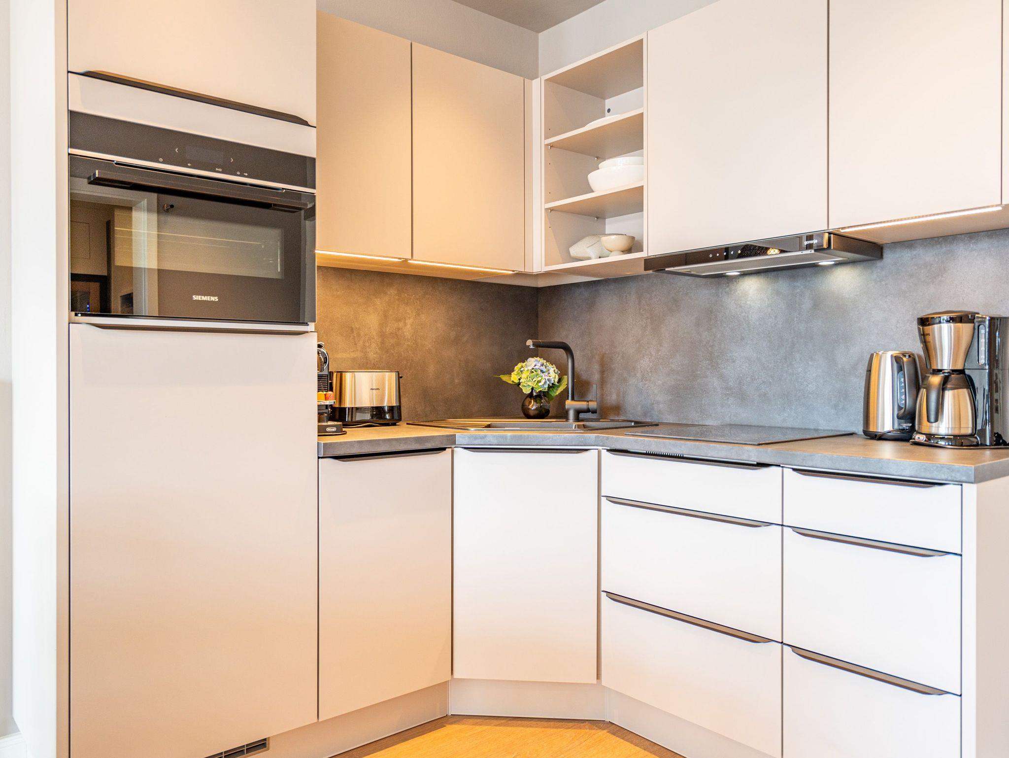Ein charmantes, kleines 2-Raum-Appartement B 3.6 (Haus B) wartet in der 3. Etage der Strandterrasse auf auszeitsehnsüchtige Ostseeliebhaber, die einen Faible für nordisches Design haben. Die 53 Quadratmeter große Wohnung ist ein perfekter Rückzugsort für bis zu 2 Personen. Die hellen und großzügigen Zimmer bieten nicht nur allen modernen Komfort, sondern darüber hinaus auch eine wohlige Atmosphäre, in der man sich sofort wohlfühlt und entspannt. Der offene Wohn-Essbereich lädt zum Relaxen und Genießen ein. Das gemütliche Sofa im Wohnzimmer ist eine ideale Wohlfühlarea. Ein Elektrokamin (ohne Wärmeabgabe) sorgt für eine kuschelige Stimmung und ein großer Flat-TV (50 Zoll) für spannende Kinounterhaltung. Viel Freude beim Kochen und Essen werden Sie am schönen Esstisch und in der mit hochwertigen Geräten voll ausgestatteten Küchenzeile haben. Vom Wohnzimmer aus haben Sie Zugang zu einem Süd-Balkon. Er schenkt einen schönen Blick von oben auf das altehrwürdige Seebad. Am Balkontisch mit den 2 Stühlen lässt es sich ganz gelassen in den Tag hinein entspannen. Auch die Nächte werden in dieser exklusiven Wohnung zu einer wahren Erholung. Ein Boxspringdoppelbett (1,80m x 2,00m), ein geräumiger Kleiderschrank und ein Flat-TV (50 Zoll) bieten auch hier wundervolle Mußestunden. Die Wohnung wird komplettiert durch ein modernes Bad mit Dusche, Waschtisch und WC. Und für das Extraquentchen Luxus sorgt eine Infrarotsaunakabine. Eine Oase, in der Sie auf wohlig warme Art neue Energie tanken können. Stellen Sie Ihr Auto einfach auf dem Stellplatz in der Tiefgarage ab und schon kann Ihr Ostseeurlaub beginnen.