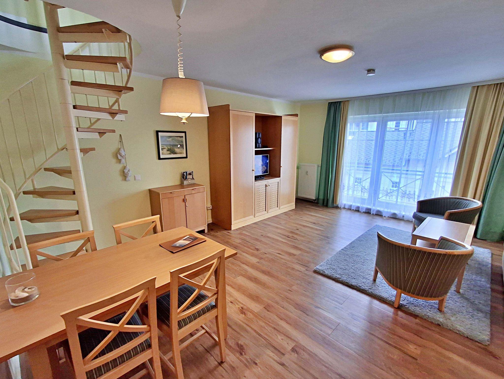 Die komfortabel ausgestattete Wohnung für bis zu 4 Personen (65 qm) erstreckt sich über zwei Etagen und befindet sich im 2. OG Dies trennt in angenehmer Weise Wohn- und Schlafbereich. Die Wohnung mit Südausrichtung vverfügt im unteren Geschoss über ein Wohnzimmer mit Couch, welche auch zum Schlafen geeignet ist, bequeme Sessel sowie eine Essecke mit 4 Stühlen. Für die Unterhaltung sorgt ein Flachbild-TV und HiFi-Anlage. Die vollständig ausgestattete Küchenzeile mit 4-Plattenherd mit Backofen, Geschirrspülmaschine, Mikrowelle, Kühlschrank mit Gefrierfach lässt keine Wünsche offen. Über eine Wendeltreppe gelangen Sie in das OG, wo sich auch das Schlafzimmer mit Doppelbett (2,10 m lang mit offenem Fußende) mit zusätzlichem Flachbild-TV, gemütlicher Sitzecke sowie ein Bad mit Dusche/WC und Kosmetikspiegel befindet. Vom OG aus erreichen Sie auch die großzügige Dachterrasse. Aufgrund der Wendeltreppe ist die Wohnung für ältere Hunde nicht geeignet.