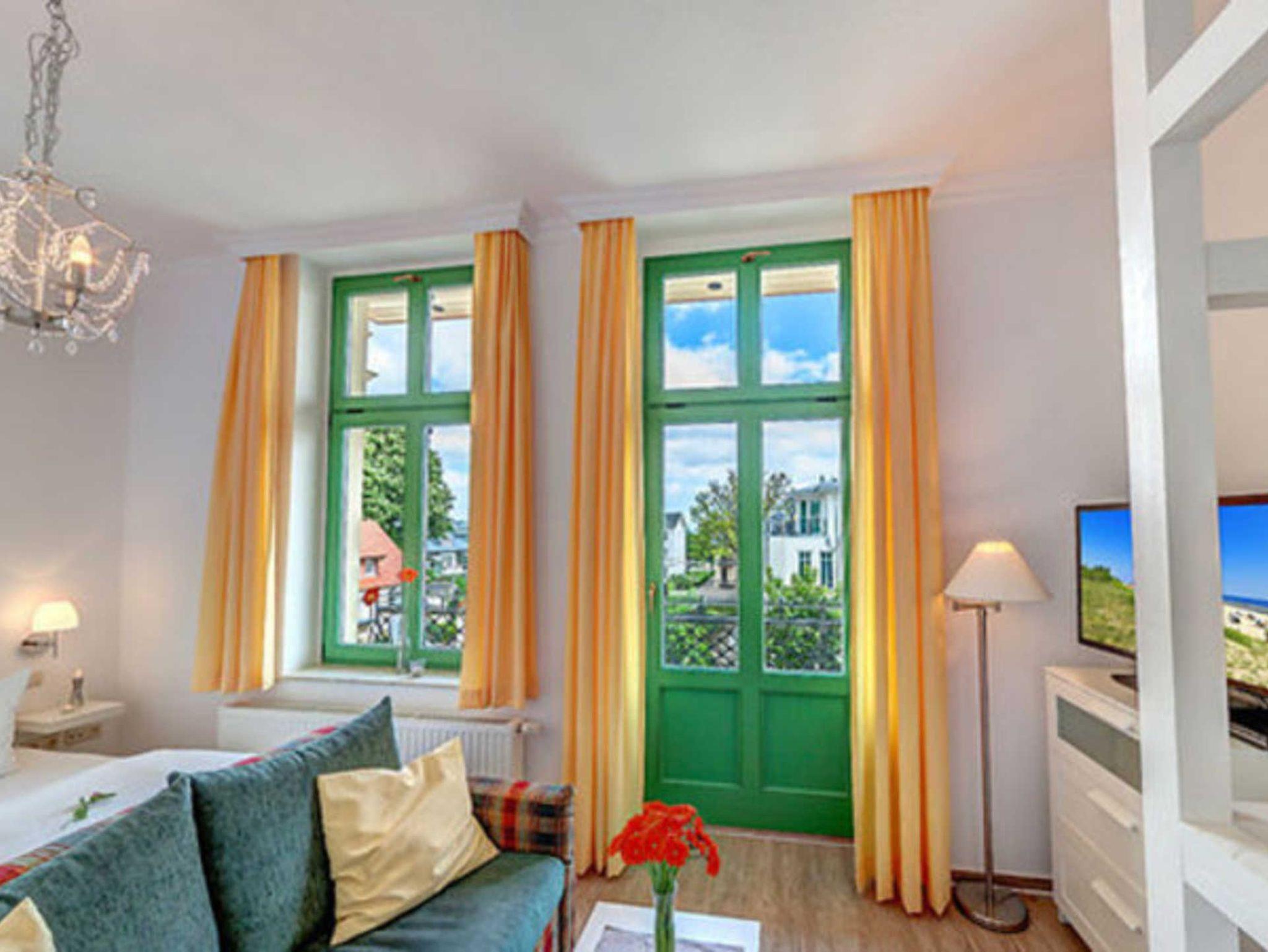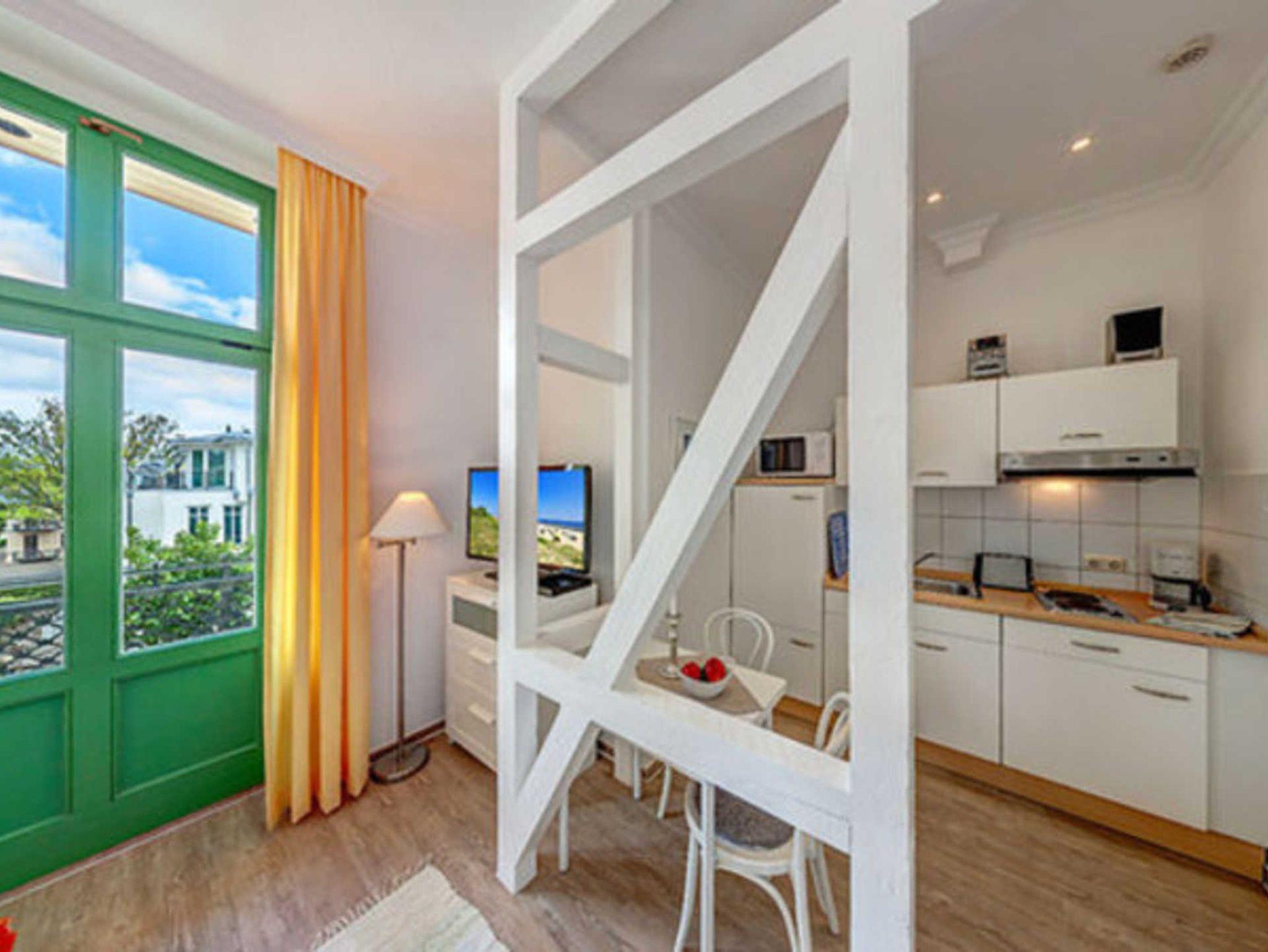 STRANDNAH mit BALKON! Nur ca. 100 m zur Strandpromenade! FAHRSTUHL im Haus. Gemütliches 1-Zimmer-Apartment mit guter Ausstattung. Geräumiger Wohn-/Schlafraum mit Doppelbett und Sitz-/Sofaecke, Küchenzeile mit Essplatz, Duschbad, Balkon. Die Wohnung verfügt über einen Pkw-Stellplatz . Abstellraum für Fahrräder und ähnliches ist vorhanden. Eine Sauna in der Villa Germania kann kostenpflichtig genutzt werden. Vom Haus aus können Sie das Ortszentrum und die bekannte Ahlbecker Seebrücke in ca. 3 bzw. 5 Minuten zu Fuß erreichen.