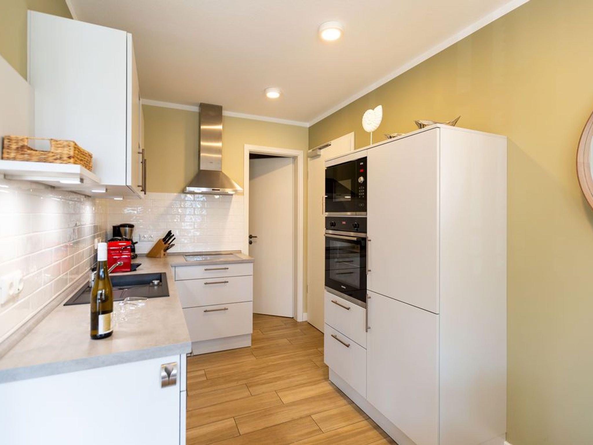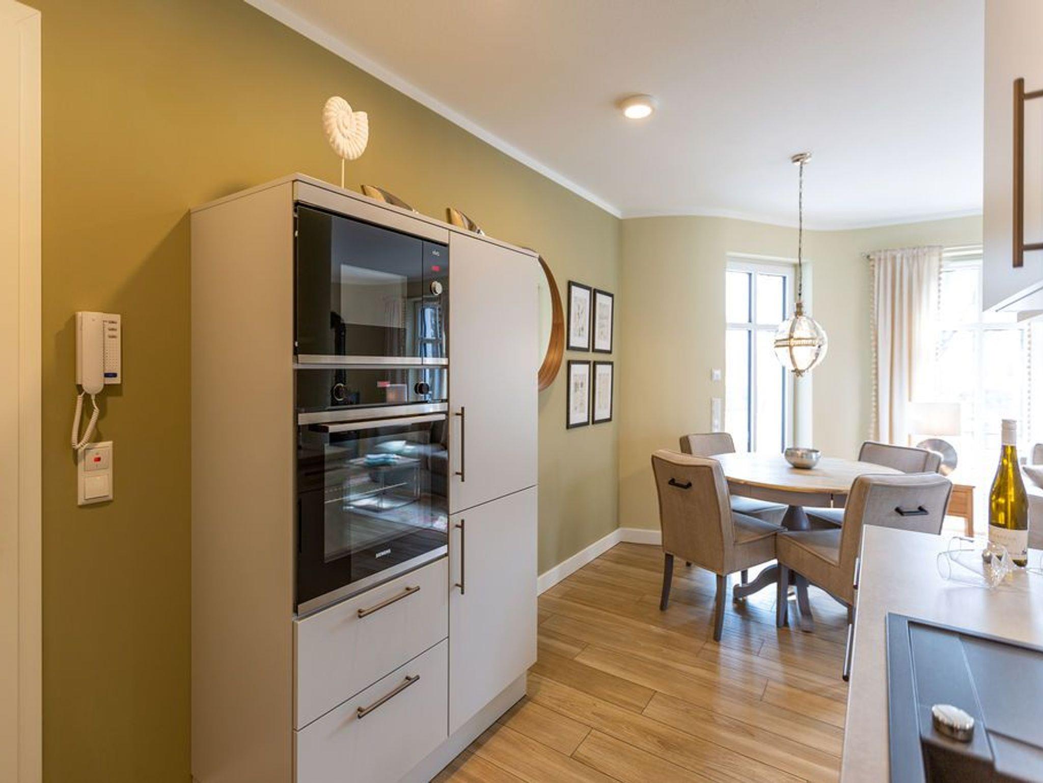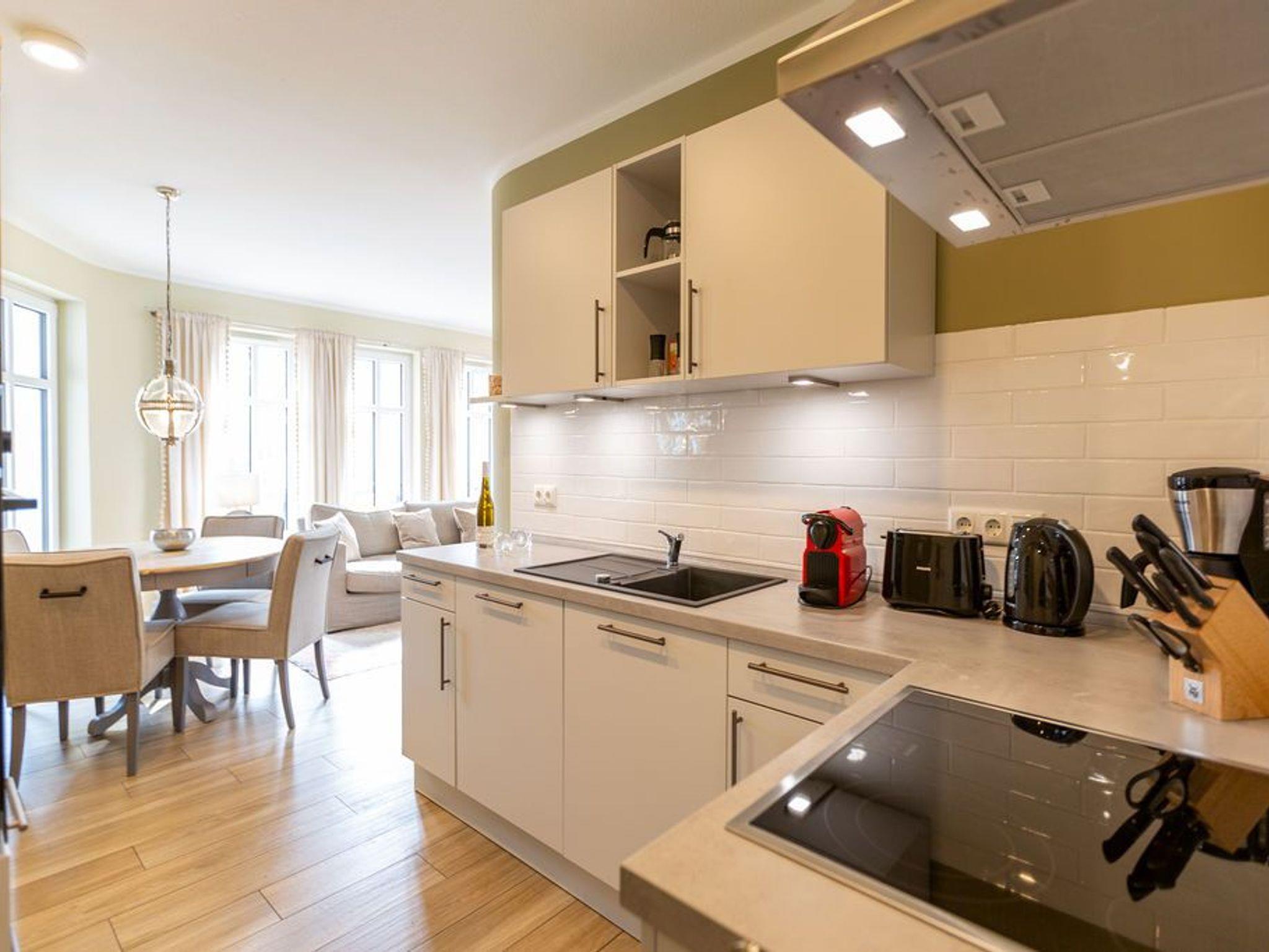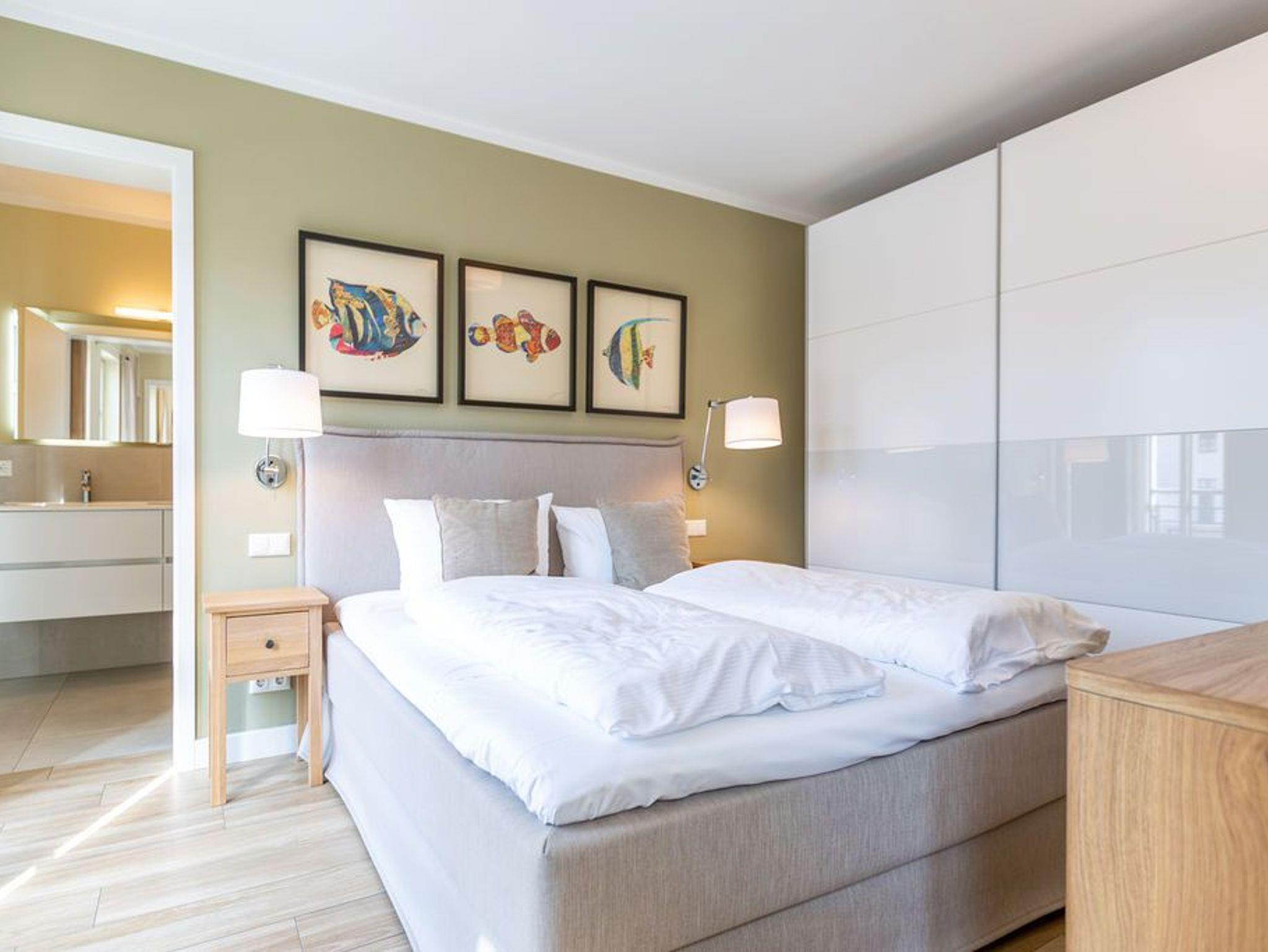 Ein außergewöhnliches, kleines Urlaubsreich erwartet Sie in den 57 Quadratmetern dieser Ferienwohnung im ersten Obergeschoss. Ein Wohlfühlreich für zwei Personen der Extraklasse. Ein Kleinkind bis zwei Jahre kann im Kinderreisebett ebenfalls hier untergebracht werden. Die zwei Zimmer des Appartements sind stilvoll und modern eingerichtet. Hier passt vom Raumkonzept bis zum Accessoires alles harmonisch zusammen. Kommen Sie an und lassen Sie die Sorgen des Alltags einfach hinter sich. Ein schönes und großzügiges Wohn-Esszimmer empfängt Sie mit viel Charme und Flair. Gemütlich können Sie es sich auf den nordischen Design-Klassikern wie dem Sofa oder dem Sessel machen. Von hier aus haben Sie den großen Flat-TV und den Gas-Kamin gut im Blick. Der Urlaubsentspannung steht also nichts mehr im Weg. Ein schöner, runder Esstisch lädt zum Essen ein. Zubereiten können Sie die aufgetischten Köstlichkeiten direkt in der offenen Küche. Sie ist mit allen nötigen Geräten und mit edlem Geschirr voll ausgestattet. Sie finden dort unter anderem eine Mikrowelle, eine Spülmaschine, Backofen und Herd sowie einen Kühlschrank mit Gefrierfach. Vom Wohnzimmer aus können Sie auf den kleinen Balkon hinaustreten. Sonnenüberflutet bietet er mit Blick auf das Grün des Kurparks und den Kirchturm der Ahlbecker Kirche ein schönes Plätzchen zum Verweilen. Ein breites und vor allem bequemes Boxspringdoppelbett (1,80 m x 2,00 m) schenkt Ihnen im Schlafzimmer Schlafvergnügen und erholsame Träume. Kuscheln ist hier ausdrücklich erlaubt. Ablageflächen finden Sie im Kleiderschrank und im Board unter dem Flat-TV. Das Badezimmer ist mit einer ebenerdigen Dusche, Doppel-Waschtisch und WC ausgestattet. Außerdem können Sie sich an kühlen Tagen in der Finnischen Sauna so richtig durchwärmen. Handtücher liegen für Sie bereit. Und auch die Betten sind bei Ihrer Anreise bezogen. In der Tiefgarage ist für Ihr Auto ein Stellplatz vorgesehen.