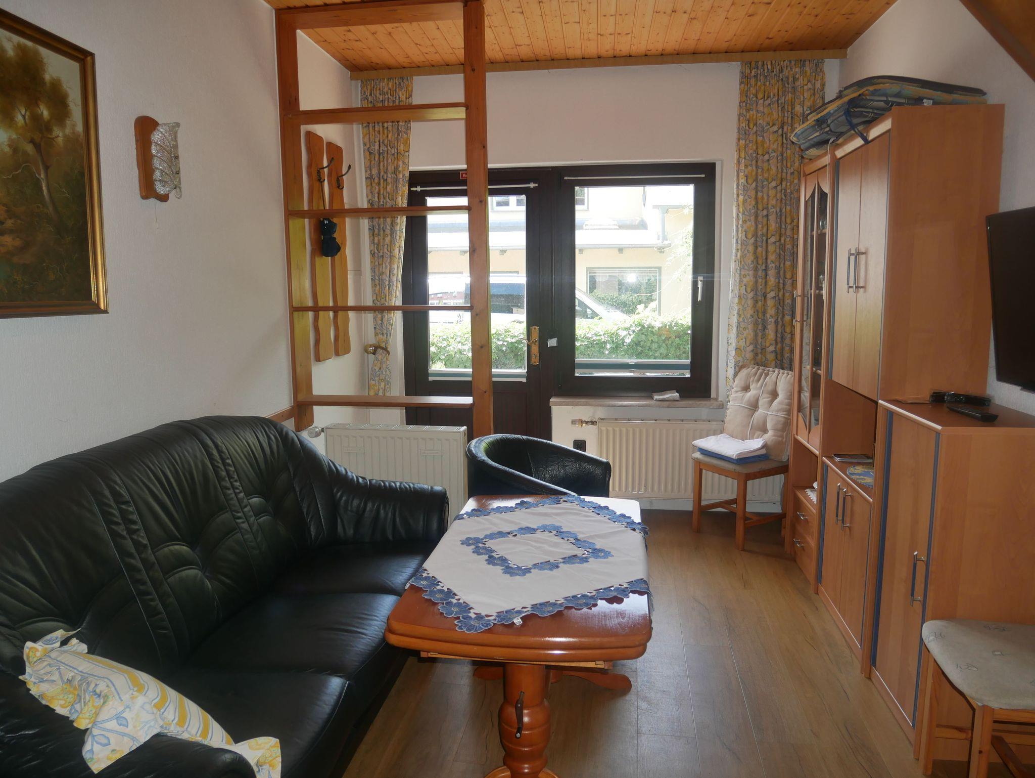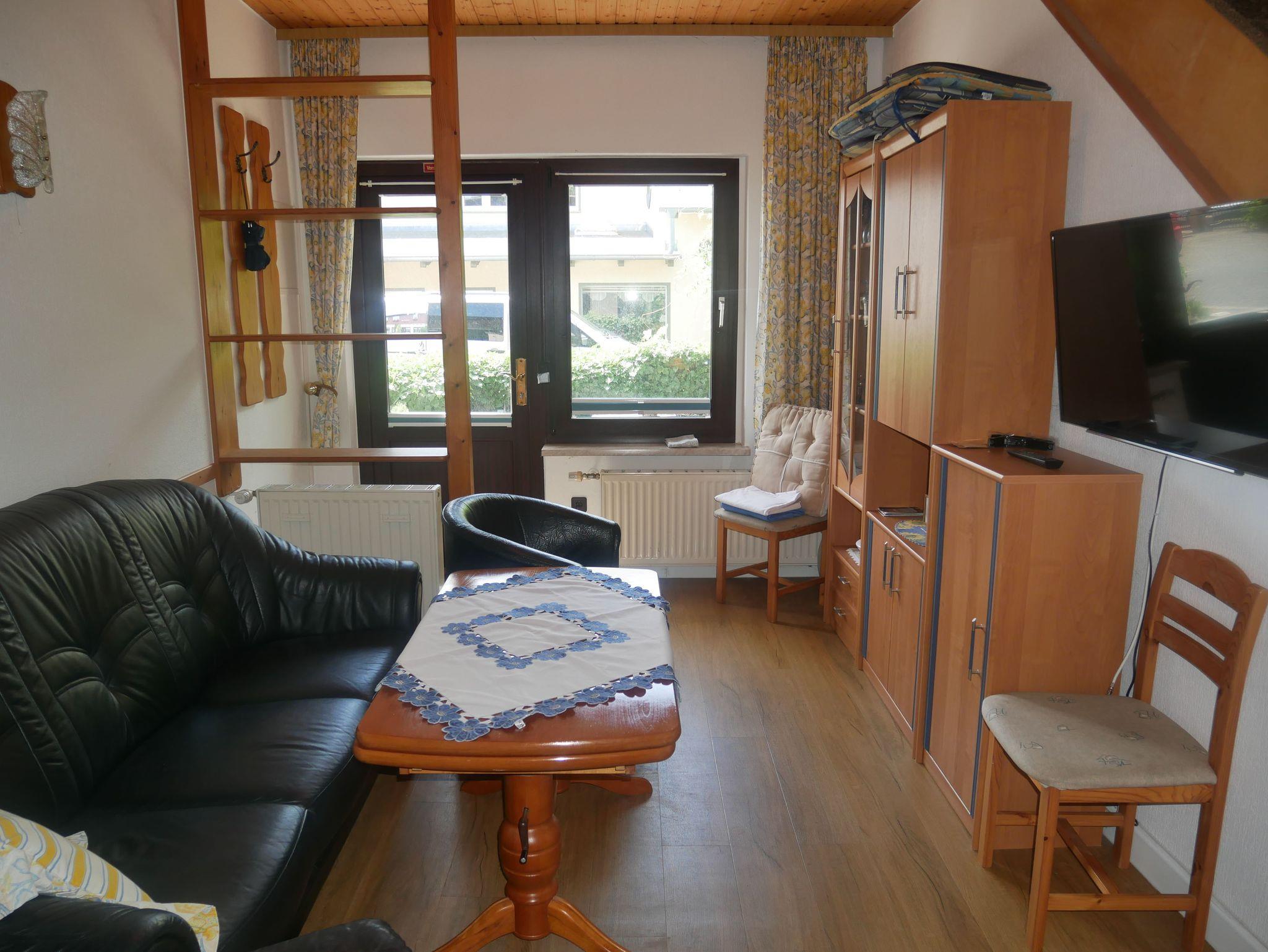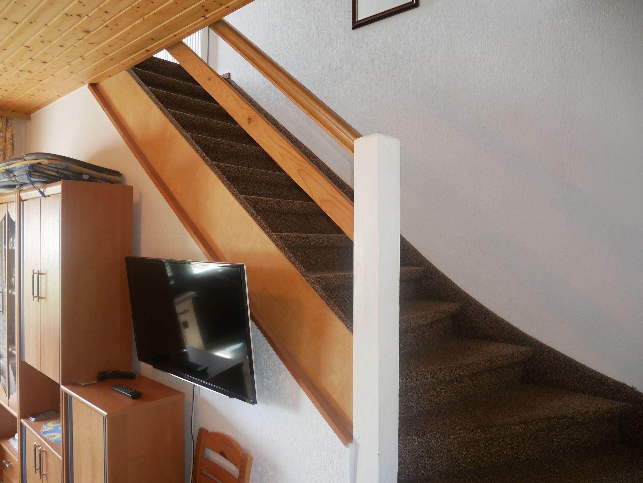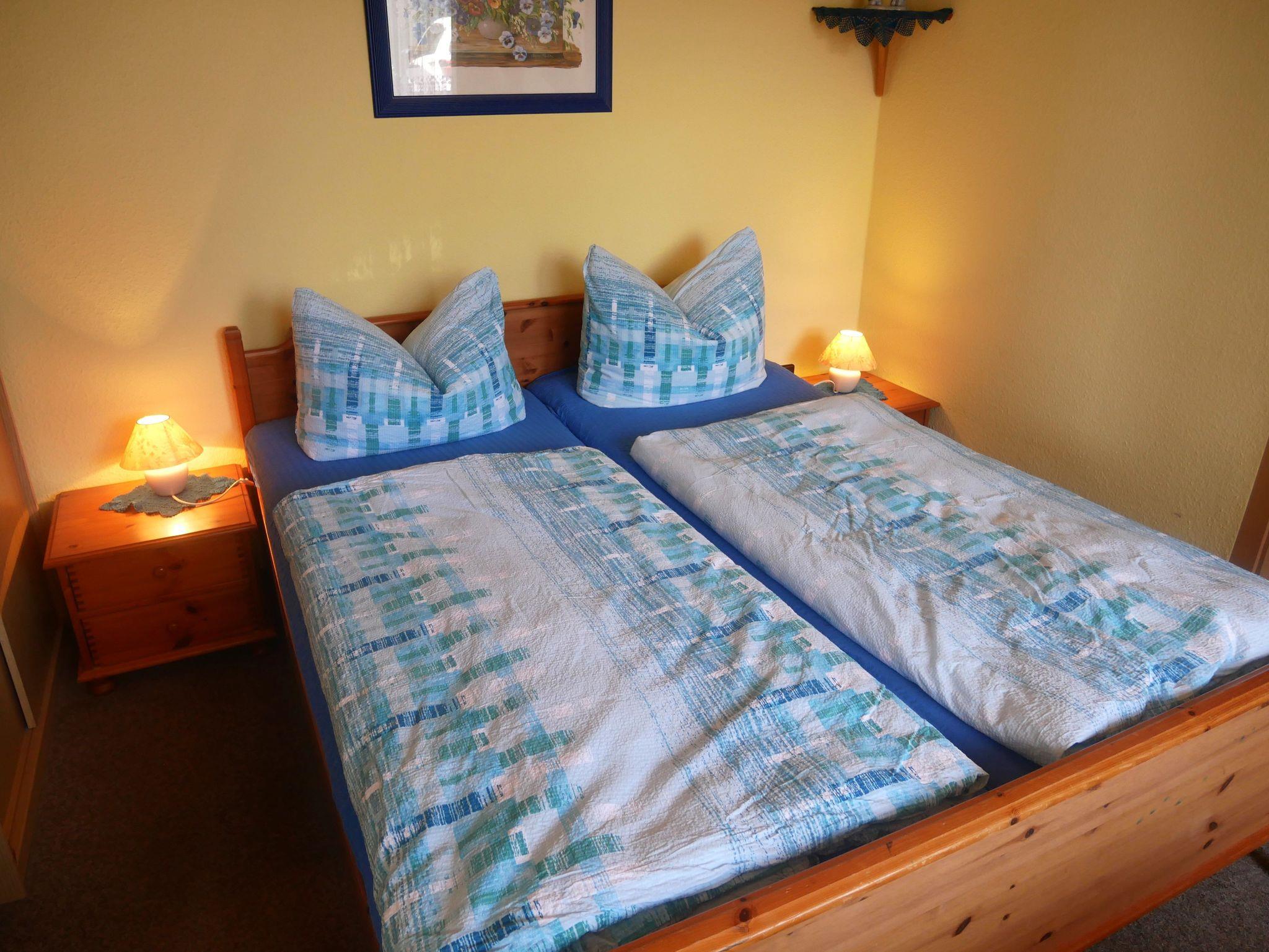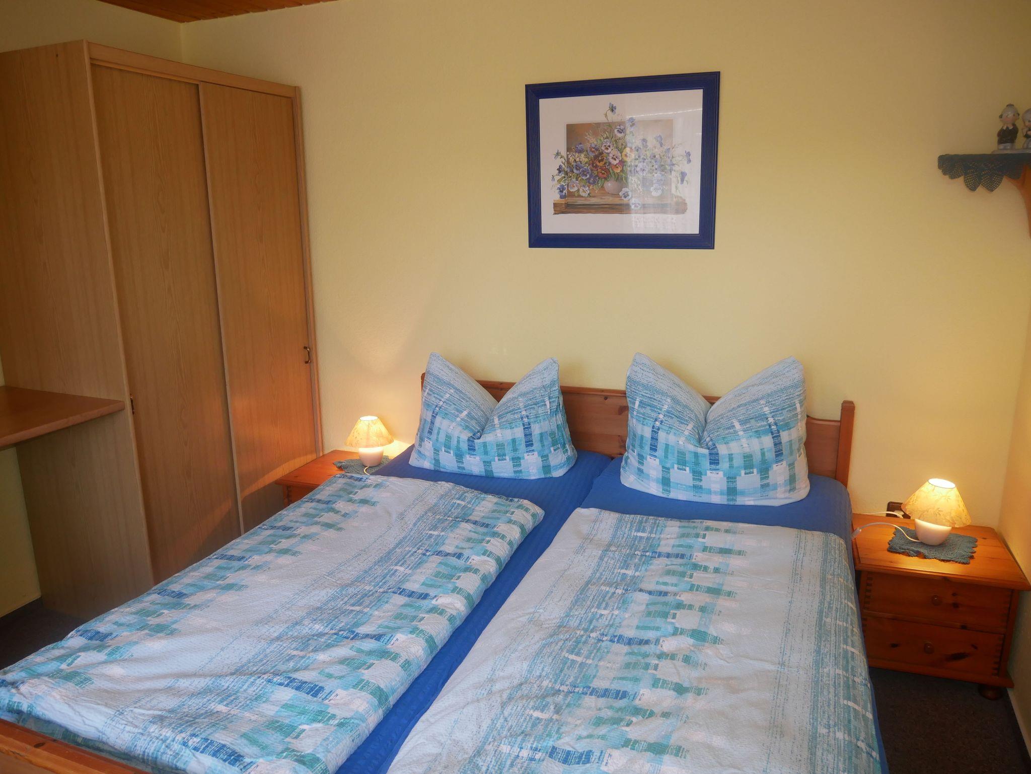 Die 3-Raum-Wohnung blau befindet sich im Erd- und Obergeschoss, sie ist ca. 60 m² groß. Das Wohnzimmer ist mit einer gemütlichen Couch, Sessel und Flachbildfernseher ausgestattet. Im Durchgang zwischen Wohnzimmer und Schlafzimmer befindet sich die offene Küche. Die Küche verfügt über ein 2er-Cerankochfeld, Kühlschrank mit Gefriermöglichkeit, Kaffeemaschine, Wasserkocher, Toaster und Mikrowelle. Das Schlafzimmer im Erdgeschoss ist ausgestattet mit einem gemütlichen Doppelbett und Kleiderschrank. Das zweite Schlafzimmer im Obergeschoss ist ebenfalls mit einem Doppelbett ausgestattet. Das Badezimmer befindet sich im Erdgeschoss und verfügt über eine Dusche und einen Haartrockner. Vor der Wohnung befindet sich eine möblierte Terrasse.