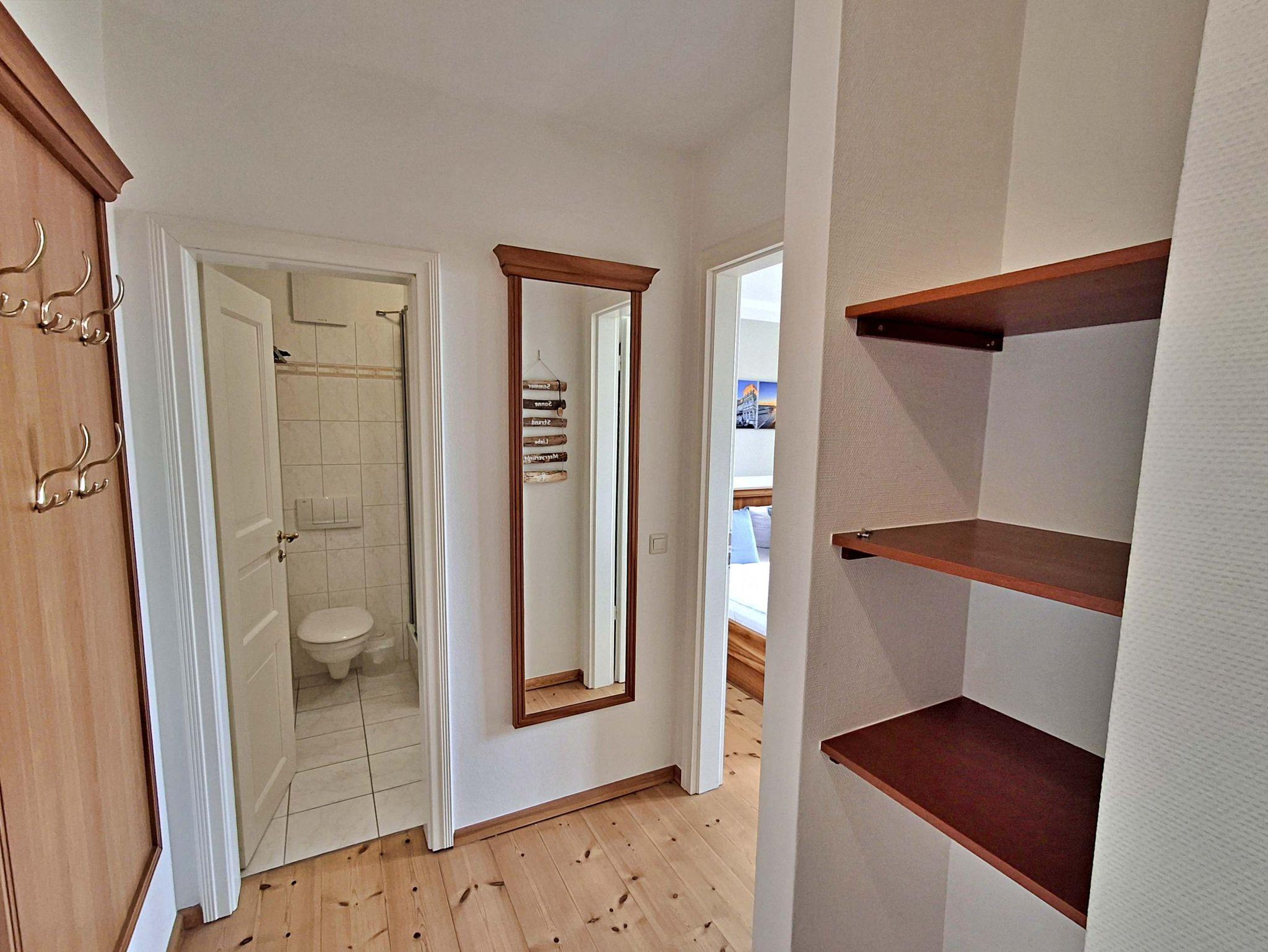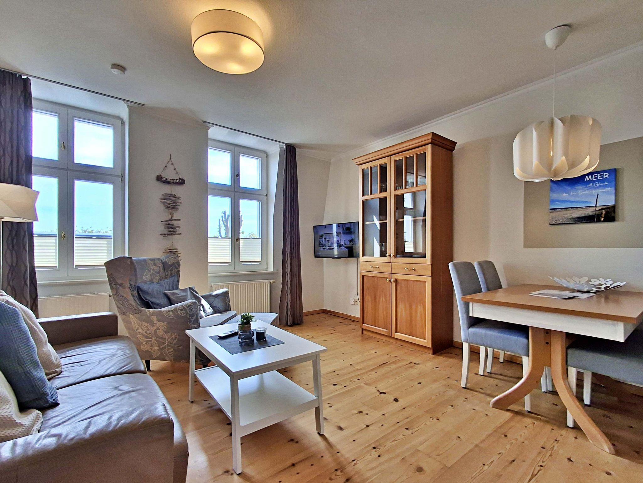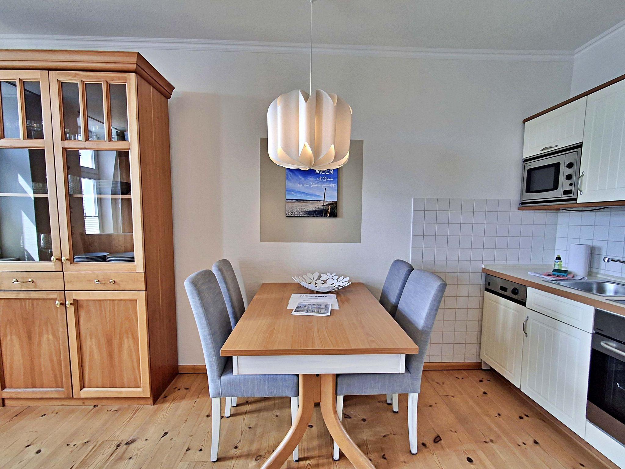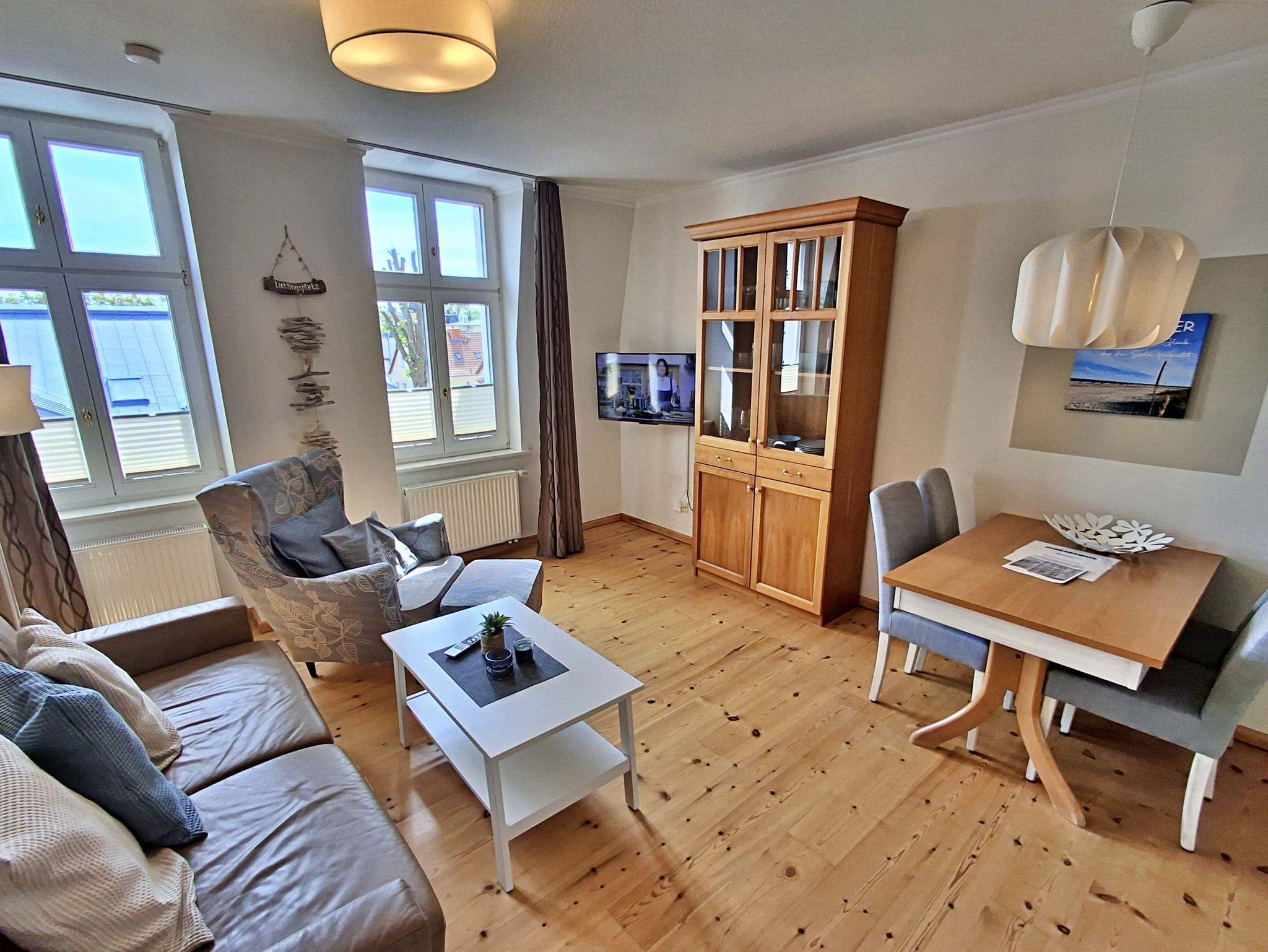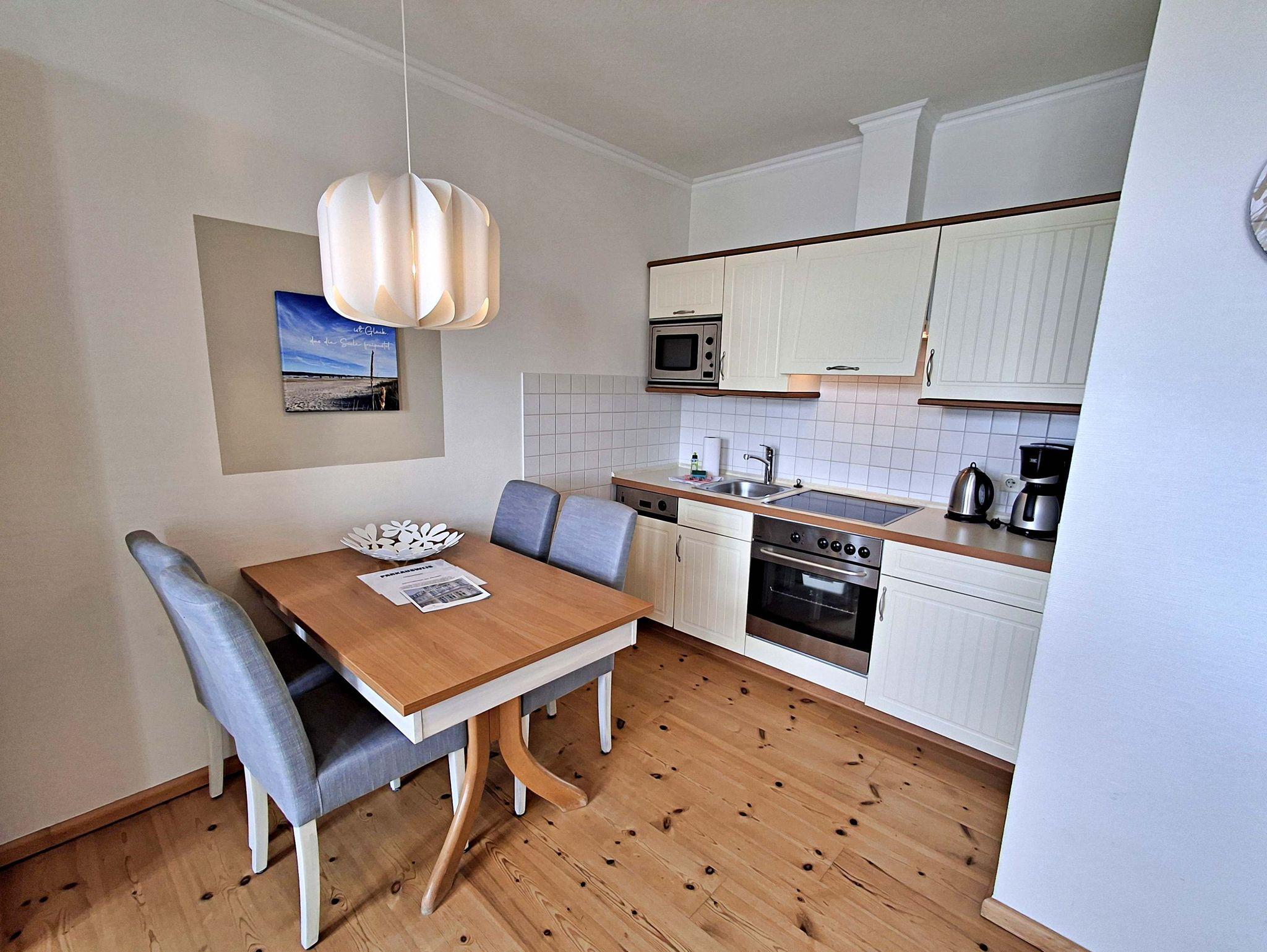 Die charmante 2-Zimmer-Wohnung Ahrenshoop im 2. Obergeschoss für max. 3 Erwachsene und 1 Kleinkind bis 3 Jahre befindet sich in der stilvoll restaurierten Villa Ahlbeck - nur wenige Schritte von der Promenade und dem Strand entfernt. Im hellen Wohnbereich befinden sich neben einer gemütlichen Couch (Aufbettungsmöglichkeit für 2 Personen) auch ein Esstisch mit 4 Stühlen, der genügend Platz für 4 Personen bietet sowie ein Sessel mit passendem Fußhocker. Die moderne Küchenzeile mit Ceranherd, Backofen, Geschirrspüler, Mikrowelle, Kaffeemaschine, Wasserkocher und Toaster lässt keine Wünsche offen. Für die Unterhaltung sorgen ein Smart-TV und kostenfreies W-LAN. Das Schlafzimmer verfügt über ein Doppelbett und das Badezimmer hat DU/WC.