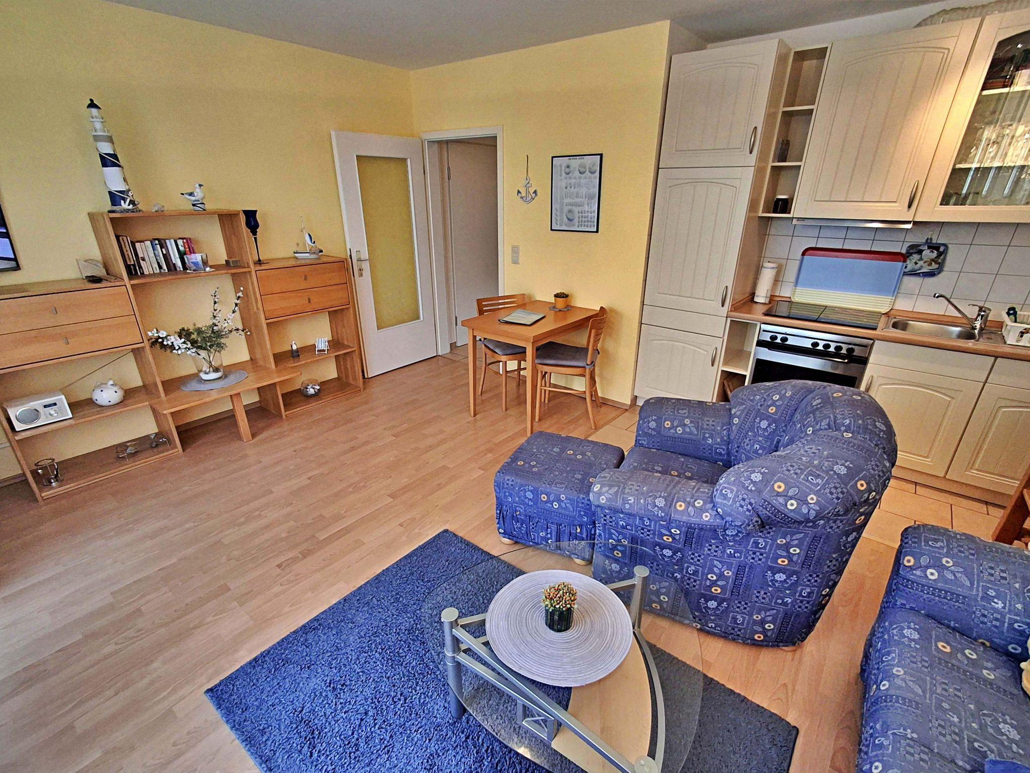 Diese 49 m² große komfortable und geschmackvoll eingerichtete Nichtraucher-2-Raum-Ferienwohnung befindet sich im Erdgeschoss und verfügt über einen kombinierten Wohn-und Küchenbereich mit bequemer Couch, Sessel mit Hocker, Esstisch mit Stühlen, HiFi-Anlage sowie Flachbild-TV mit DVD-Player. Die Küchenzeile ist mit Ceranherd, Backofen, Kühl-/Gefrierkombination, Kaffee- und Padmaschine, Toaster, Wasser- und Eierkocher und den wichtigsten Küchenutensilien ausgestattet. Das separate Schlafzimmer hat ein Doppelbett, 1 Einzelklappbett für max. 1 Aufbettung, Kleiderschrank und Flachbild-TV. Das Badezimmer verfügt über Dusche/WC. Komplettiert wird die Ausstattung der Ferienwohnung durch eine kleine uneinsehbare in den Sommermonaten möblierte Sonnenterrasse. Hier können Sie bei schönem Wetter Ihr Frühstück genießen oder den Tag bei einem Glas Wein ausklingen lassen. Für die kleinsten Gäste steht Ihnen kostenfrei ein Babybett und Kinderstuhl zur Verfügung. Ihr eigener Pkw kann gern direkt am Haus geparkt werden. Das W-LAN Netz können Sie gratis nutzen.