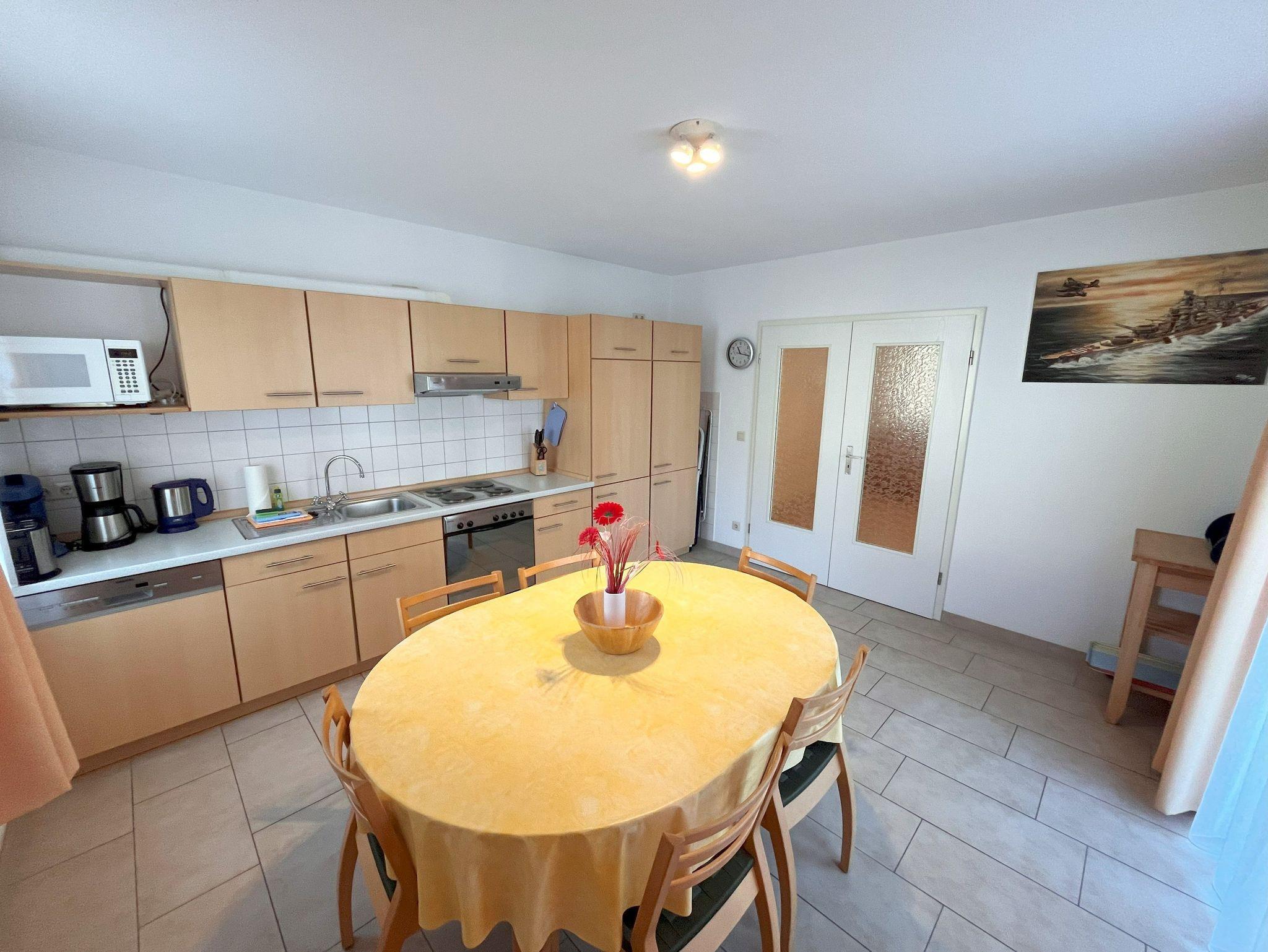 Herzlich willkommen in dieser charmanten Nichtraucher-Wohnung! Mit einer großzügigen Fläche von 66 qm bietet sie Ihnen ein helles und freundliches Ambiente, ideal für entspannte Tage. Im gemütlichen Wohnzimmer finden Sie ein praktisches Schrankbett, eine einladende Couchecke und einen Flachbild-TV, perfekt für gesellige Abende. Die separate Küche ist bestens ausgestattet mit einem Herd, Backofen, Spülmaschine, Mikrowelle, Kaffeemaschine, Wasserkocher und Toaster - hier wird das Kochen zum Vergnügen! Der große Esstisch mit Stühlen lädt zu gemeinsamen Mahlzeiten ein. Im Schlafzimmer erwartet Sie ein komfortables Doppelbett, Kleiderschrank und ein weiterer TV für entspannte Nächte. Das Tageslicht-Bad verfügt über eine ebenerdige Dusche und ein WC, sodass Sie sich rundum wohlfühlen können. Zusätzlich steht Ihnen ein separater Abstellraum zur Verfügung und die möblierte Terrasse zur Süd-Südwestseite, die von der Küche aus begehbar ist, lädt zum Verweilen im Freien ein. Ihr Auto können Sie kostenfrei direkt vor dem Haus parken und auch Ihre Fahrräder finden in einem separaten Abstellraum Platz. Und das Beste: Ihr kleiner Vierbeiner (bis 30 cm Schulterhöhe) ist herzlich willkommen! Eine kleine Gebühr fällt hierfür an. Selbstverständlich steht Ihnen das W-LAN Netz kostenfrei zur Verfügung.