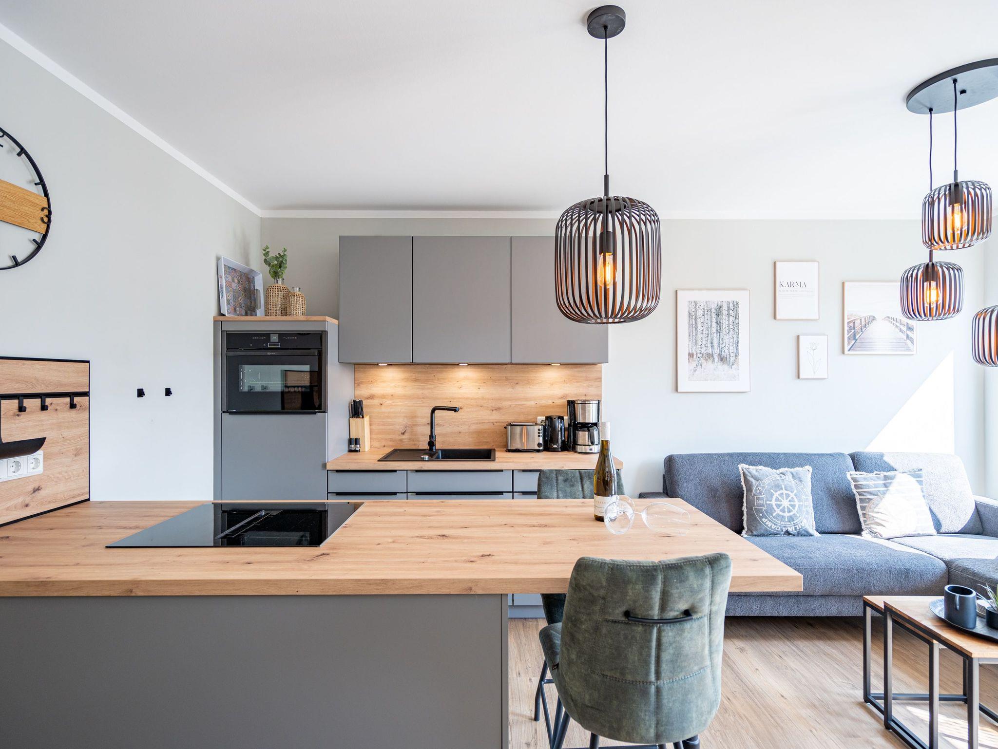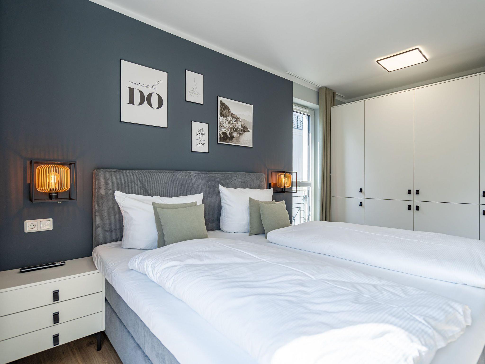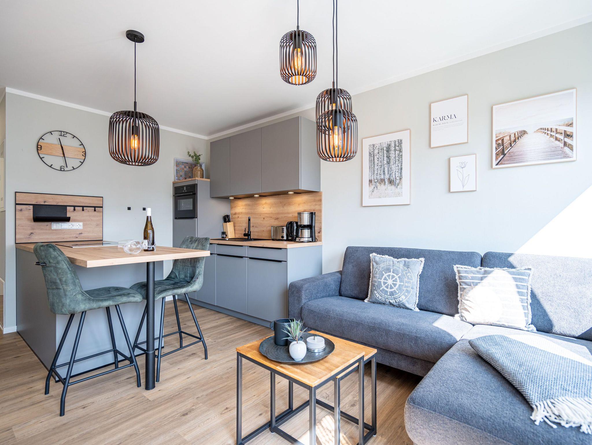 Herzlich willkommen im gemütlichen 2-Raum-Appartement N° 08 in der 1. Etage des Quartier 6. Auf 44 Quadratmetern bietet dieses liebevoll eingerichtete Domizil Platz für 2 Personen [&] 1 Kleinkind (bis 2 Jahre im Kinderreisebett). Der offene Wohnbereich überzeugt mit einer voll ausgestatteten Küchenzeile, einem Essplatz für 2 Personen und einer gemütlichen Sitzgruppe. Für entspannte Abende stehen Ihnen ein 55 Zoll Flat-TV und ein Gas-Kamin mit Fernbedienung zur Verfügung. Vom Wohnbereich gelangen Sie auf den Süd-Ost-Balkon, der mit Gartenmöbeln ausgestattet ist und zum Verweilen einlädt. Das Schlafzimmer verfügt über ein komfortables Boxspringdoppelbett (1,80 m x 2,00 m), einen Kleiderschrank und einen weiteren Flat-TV, sodass es Ihnen an nichts fehlt. Das moderne Duschbad ist mit einem Waschtisch, einem WC und einer Finnischen Sauna ausgestattet, die für erholsame Stunden sorgt. Eine Waschmaschine steht Ihnen ebenfalls zur Verfügung. Ein PKW-Stellplatz in der Tiefgarage und ein wohnungseigener Abstellraum für Fahrräder runden das Angebot ab. Selbstverständlich steht Ihnen kostenfreies WLAN zur Verfügung, damit Sie auch im Urlaub stets verbunden bleiben können. Wir freuen uns darauf, Sie in unserem einladenden Appartement begrüßen zu dürfen!