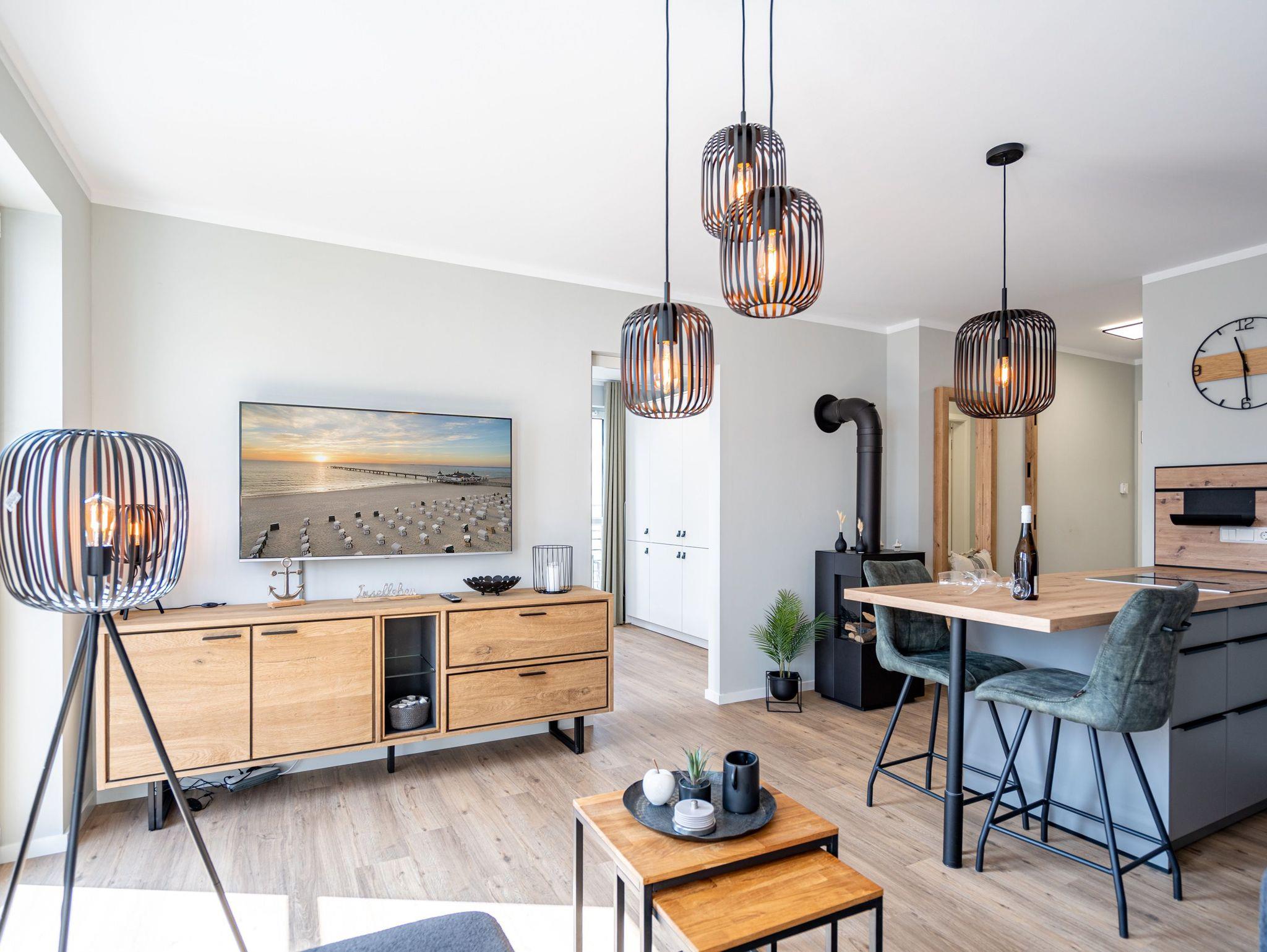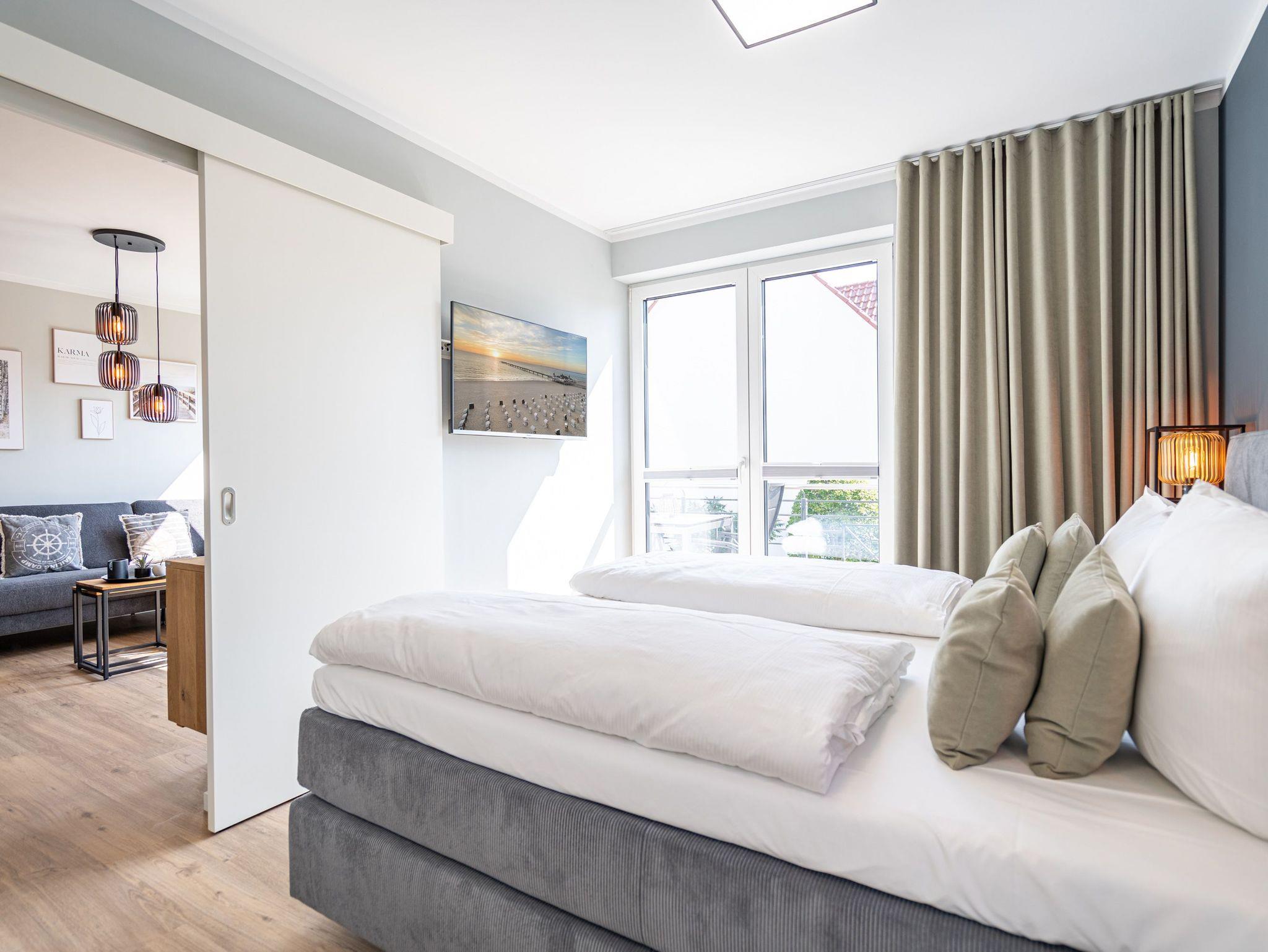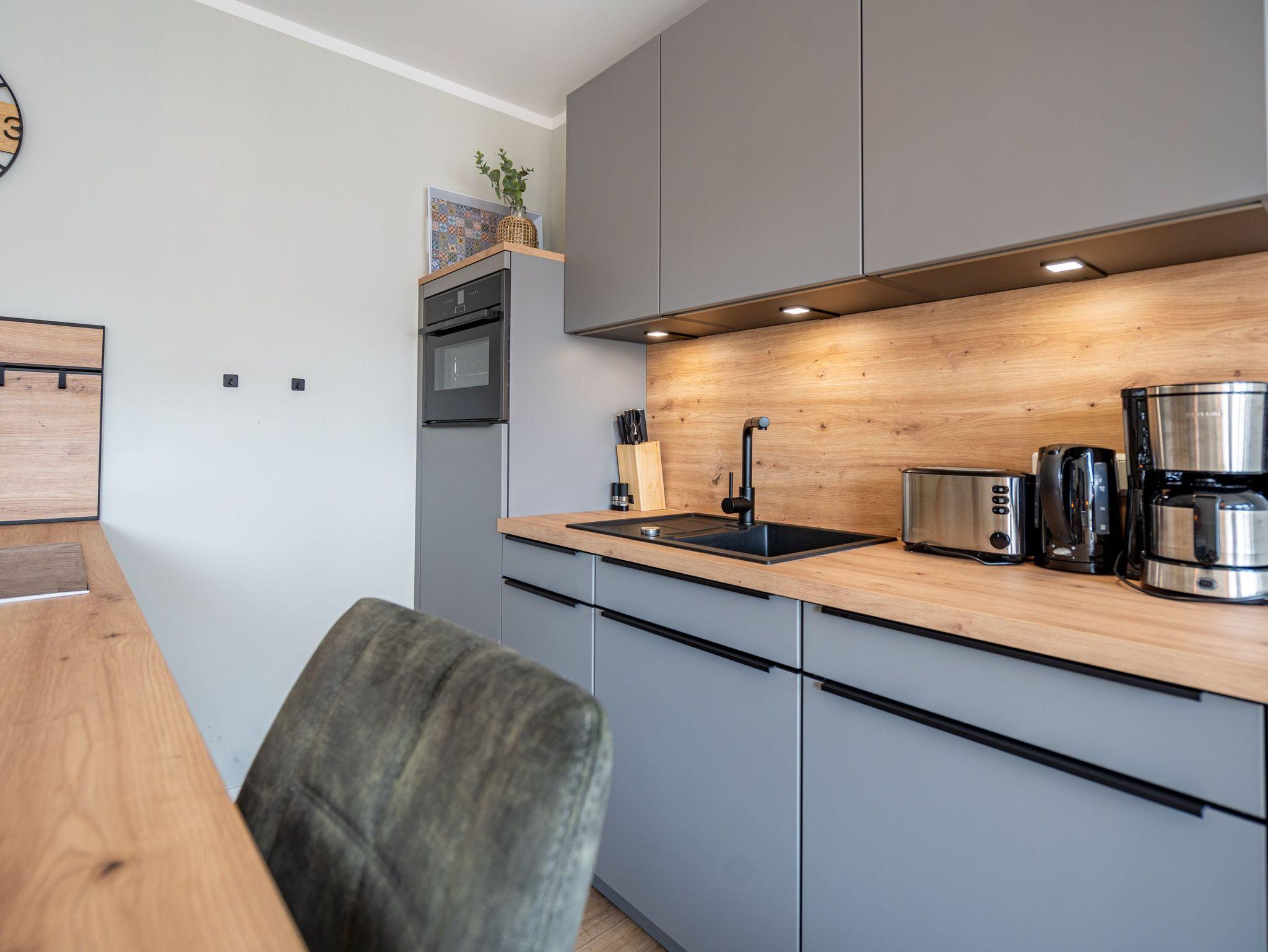 Herzlich willkommen im gemütlichen 2-Raum-Appartement N° 08 in der 1. Etage des Quartier 6. Auf 44 Quadratmetern bietet dieses liebevoll eingerichtete Domizil Platz für 2 Personen [&] 1 Kleinkind (bis 2 Jahre im Kinderreisebett). Der offene Wohnbereich überzeugt mit einer voll ausgestatteten Küchenzeile, einem Essplatz für 2 Personen und einer gemütlichen Sitzgruppe. Für entspannte Abende stehen Ihnen ein 55 Zoll Flat-TV und ein Gas-Kamin mit Fernbedienung zur Verfügung. Vom Wohnbereich gelangen Sie auf den Süd-Ost-Balkon, der mit Gartenmöbeln ausgestattet ist und zum Verweilen einlädt. Das Schlafzimmer verfügt über ein komfortables Boxspringdoppelbett (1,80 m x 2,00 m), einen Kleiderschrank und einen weiteren Flat-TV, sodass es Ihnen an nichts fehlt. Das moderne Duschbad ist mit einem Waschtisch, einem WC und einer Finnischen Sauna ausgestattet, die für erholsame Stunden sorgt. Eine Waschmaschine steht Ihnen ebenfalls zur Verfügung. Ein PKW-Stellplatz in der Tiefgarage und ein wohnungseigener Abstellraum für Fahrräder runden das Angebot ab. Selbstverständlich steht Ihnen kostenfreies WLAN zur Verfügung, damit Sie auch im Urlaub stets verbunden bleiben können. Wir freuen uns darauf, Sie in unserem einladenden Appartement begrüßen zu dürfen!