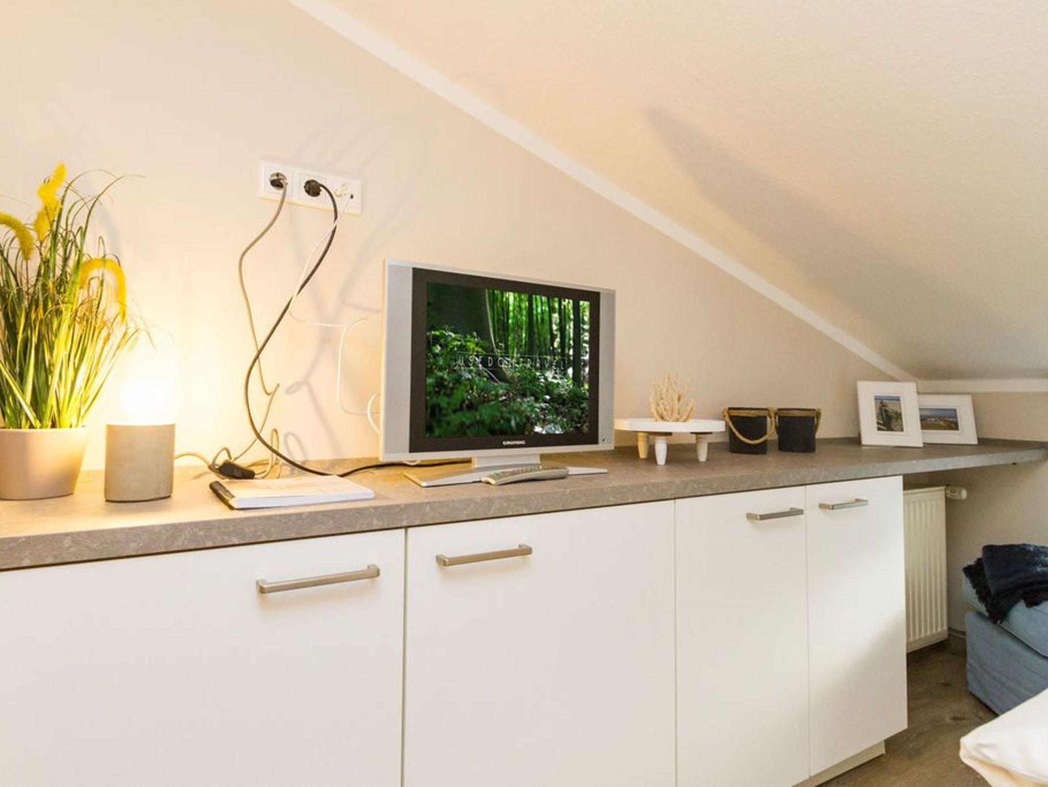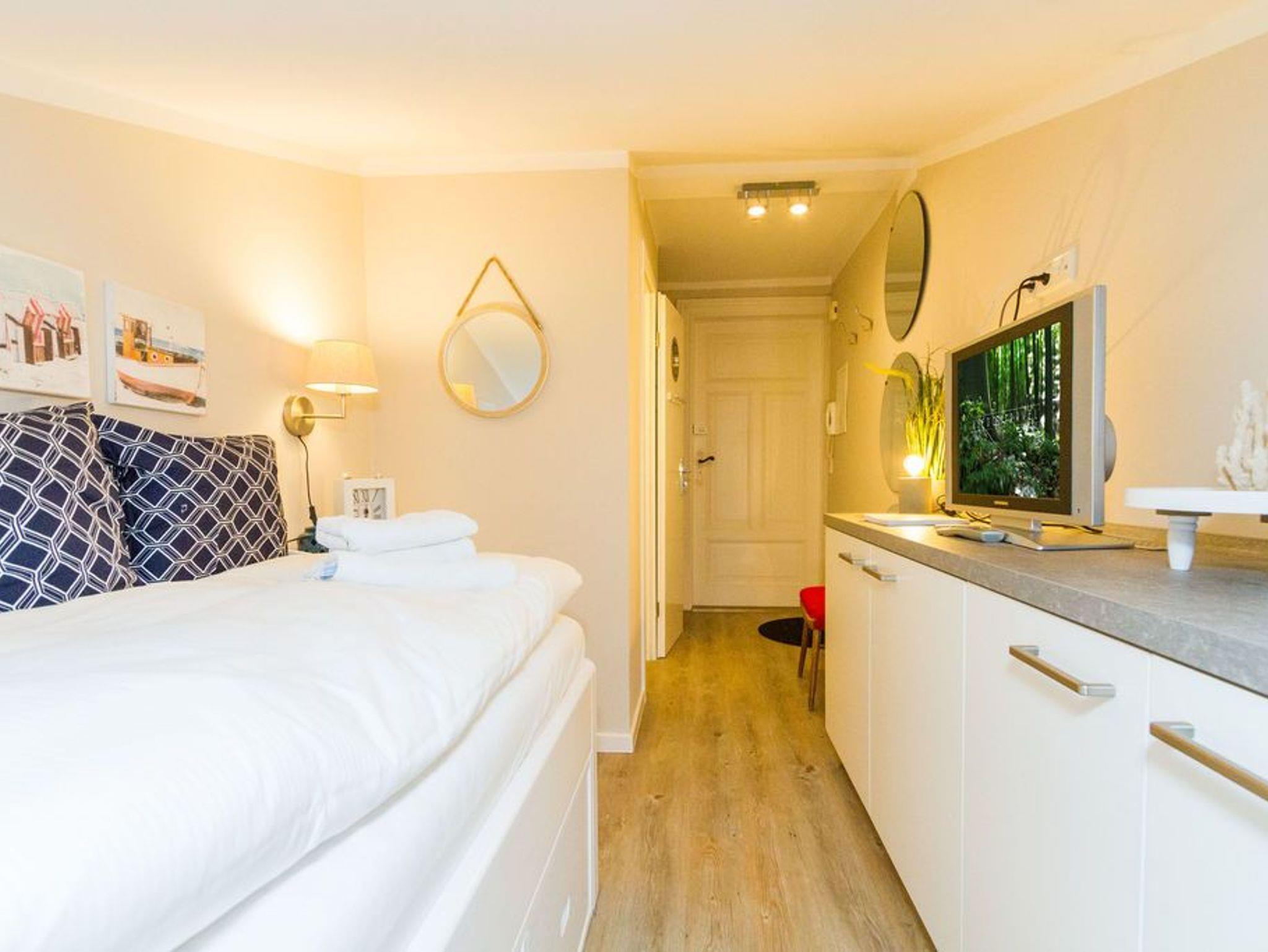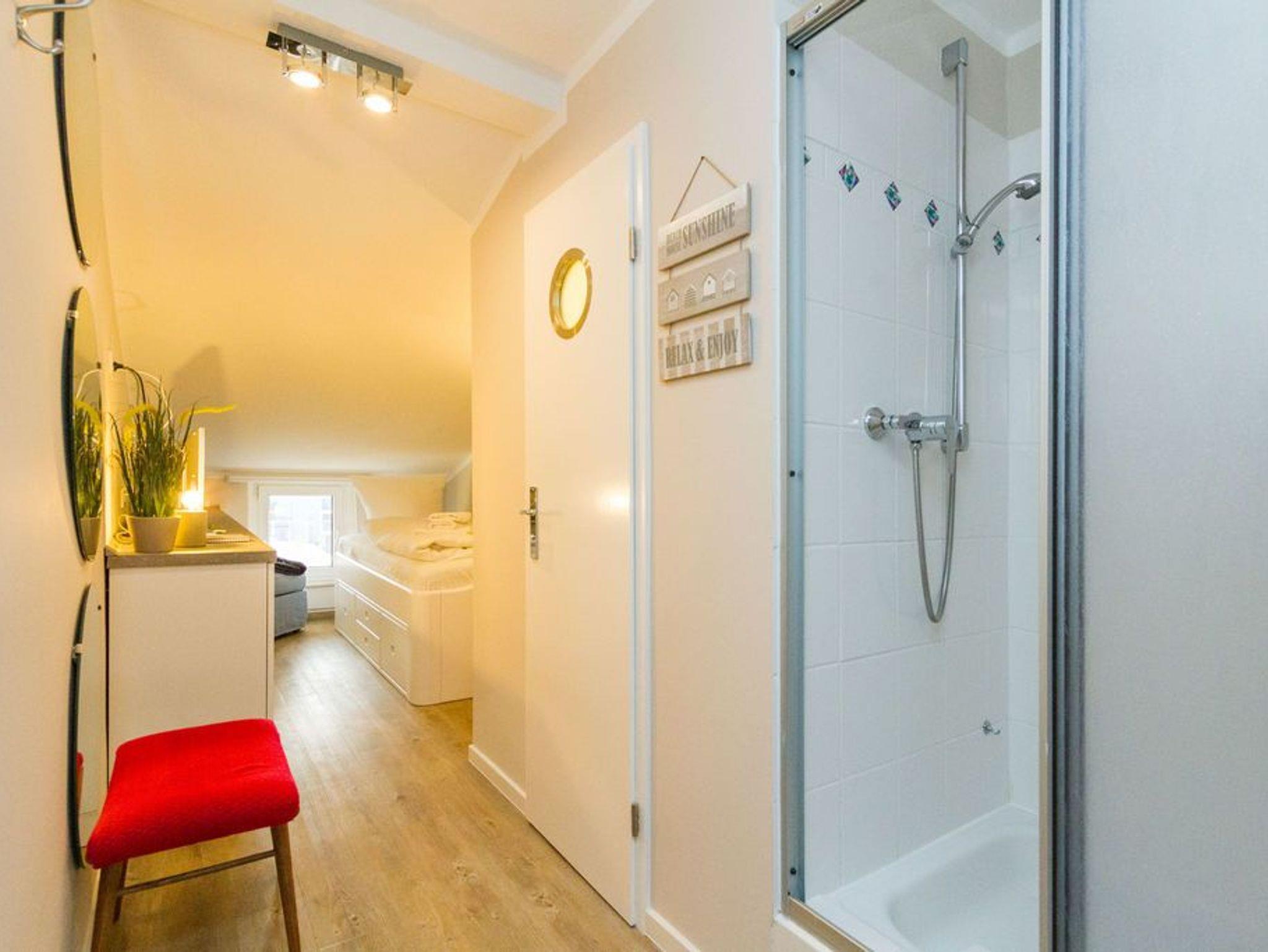 Klein und heimelig ist unser Kojen-Einzelzimmer im Dachgeschoss der Villa Albertine. Auf gemütlichen ca. 8 qm unter der Dachschräge finden hier ein bequemes Einzelbett (0,90m x 2,00m), ein kleines WC mit Waschbecken und eine Dusche Platz. Natürlich muss auch auf einen Flat-TV und einen Kühlschrank nicht verzichtet werden. Das Zimmer eignet sich wunderbar für einen Kurzurlaub oder kann bei Bedarf, zum Beispiel für einen zusätzlichen Mitreisenden oder für größere Kinder zu einer der anderen Wohnungen dazu gemietet werden. Zu diesem Appartement steht kein PKW-Stellplatz zur Verfügung.