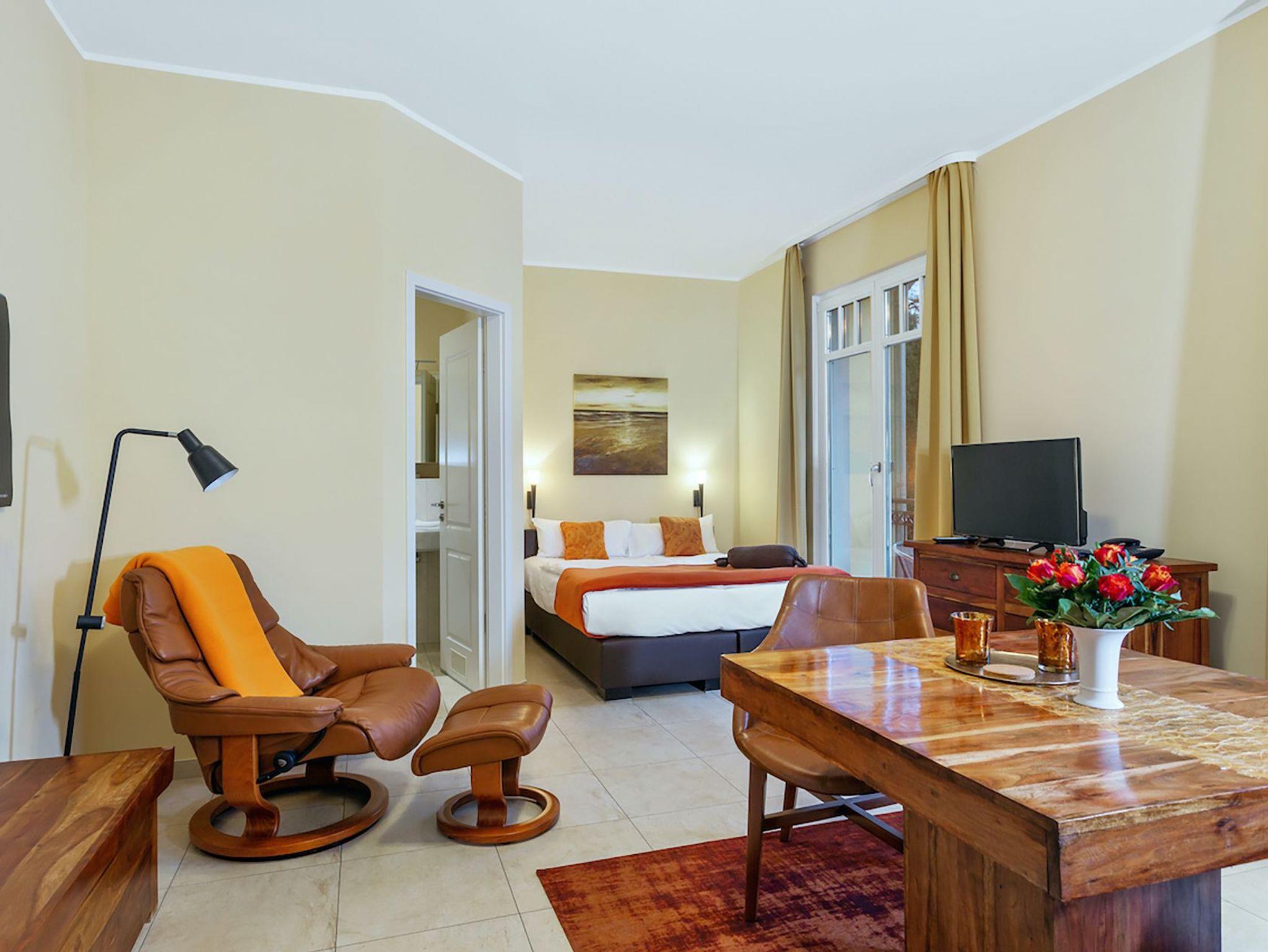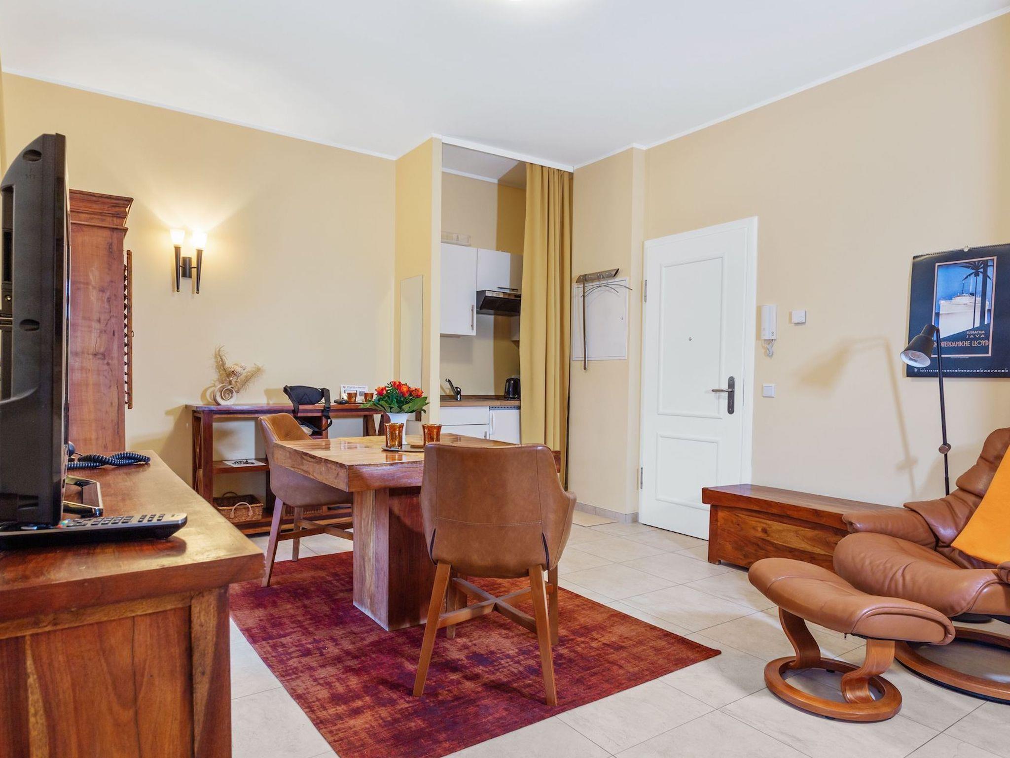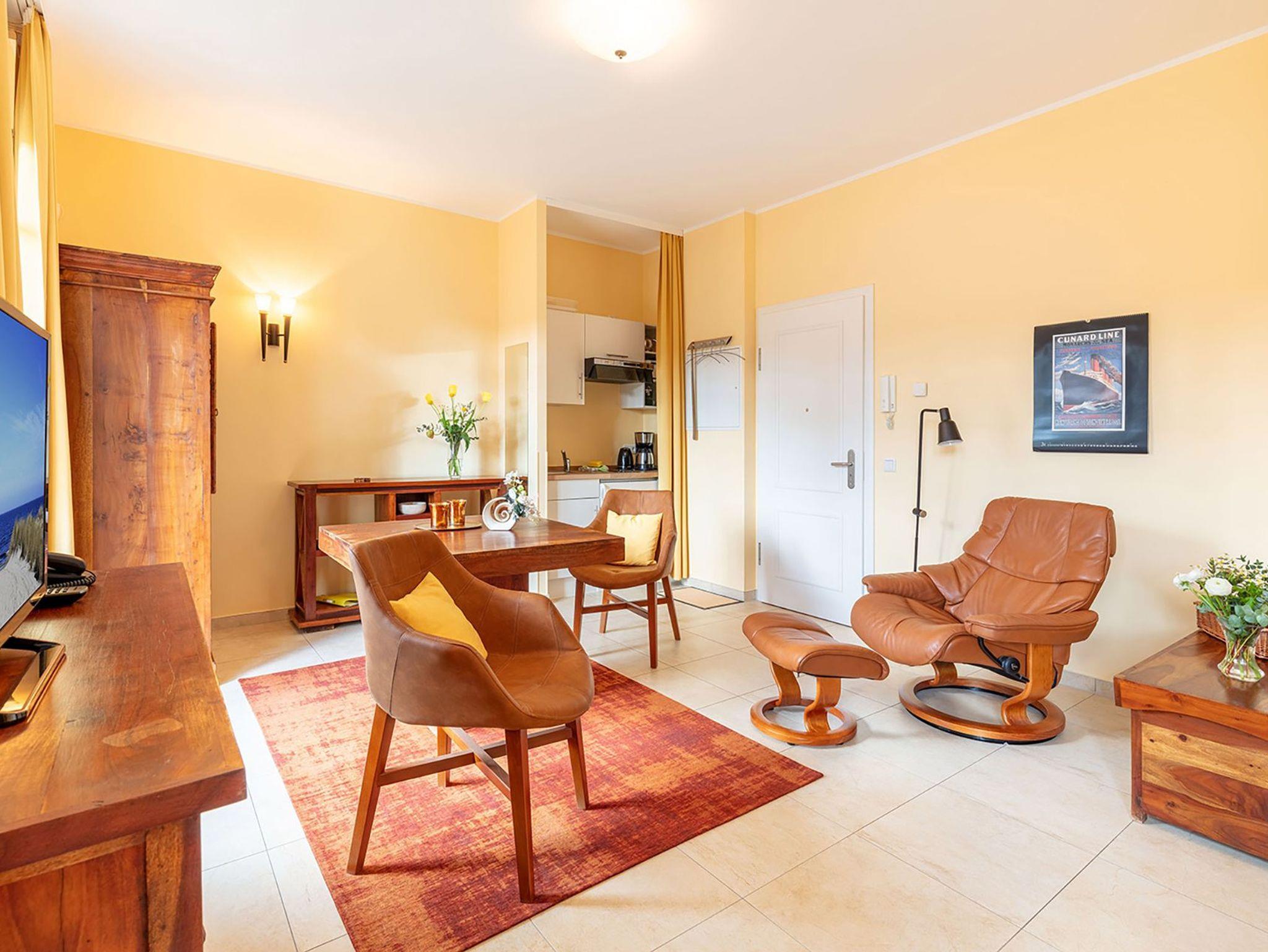 Das 31 m² große 1-Raum-Appartement ?Wiek? liegt im gemütlichen Hochparterre und ist ideal für 2 Personen. Highlight ist der großzügige Südbalkon, der sich über die gesamte Breite des Apartments erstreckt ? perfekt für sonnige Stunden und den Blick ins Grüne. Im bequemen Stressless-Sessel mit Hocker können Sie entspannt lesen, fernsehen oder einfach den Vögeln im Garten zusehen. Die Einrichtung in warmen goldbraunen Tönen mit Echtholzmöbeln, UHD-LED-TV, einem Esstisch mit komfortablen Stuhlsesseln sowie einer 1,20 m breiten Küchenzeile schafft eine behagliche Atmosphäre. Das 1,60 m breite Boxspringbett sorgt für erholsamen Schlaf. Ergänzt wird es durch Kommoden, ein Regal und einen Kleiderschrank mit integriertem Safe. Geschirr für zwei Personen ist selbstverständlich vorhanden. Die beiden Balkontüren sind mit außenliegenden, wärmereflektierenden Sonnenschutzrollos ausgestattet. Das moderne Bad verfügt über eine Dusche, beheizbaren Handtuchtrockner und ? wie das gesamte Appartement ? über eine angenehme Fußbodenheizung. Da sich unter dem Appartement der Wellnessbereich des Hauses befindet, wohnen Sie angenehm erhöht wie im ersten Stock. Direkt neben Ihrer Wohnungstür steht Ihnen eine kleine Abstellkammer für leere Gepäckstücke zur Verfügung. Ein PKW-Stellplatz auf dem Hof ist im Preis inbegriffen.
