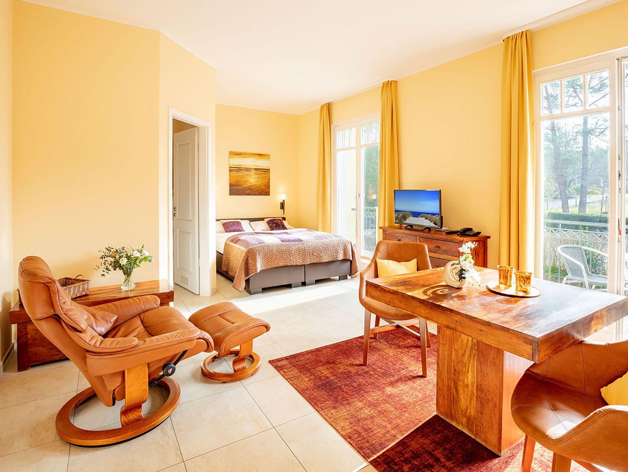 Gemütliches 1-Raum-Appartement mit Südbalkon und Wellnessbereich in Ahlbeck, nur wenige Schritte vom Strand entfernt.