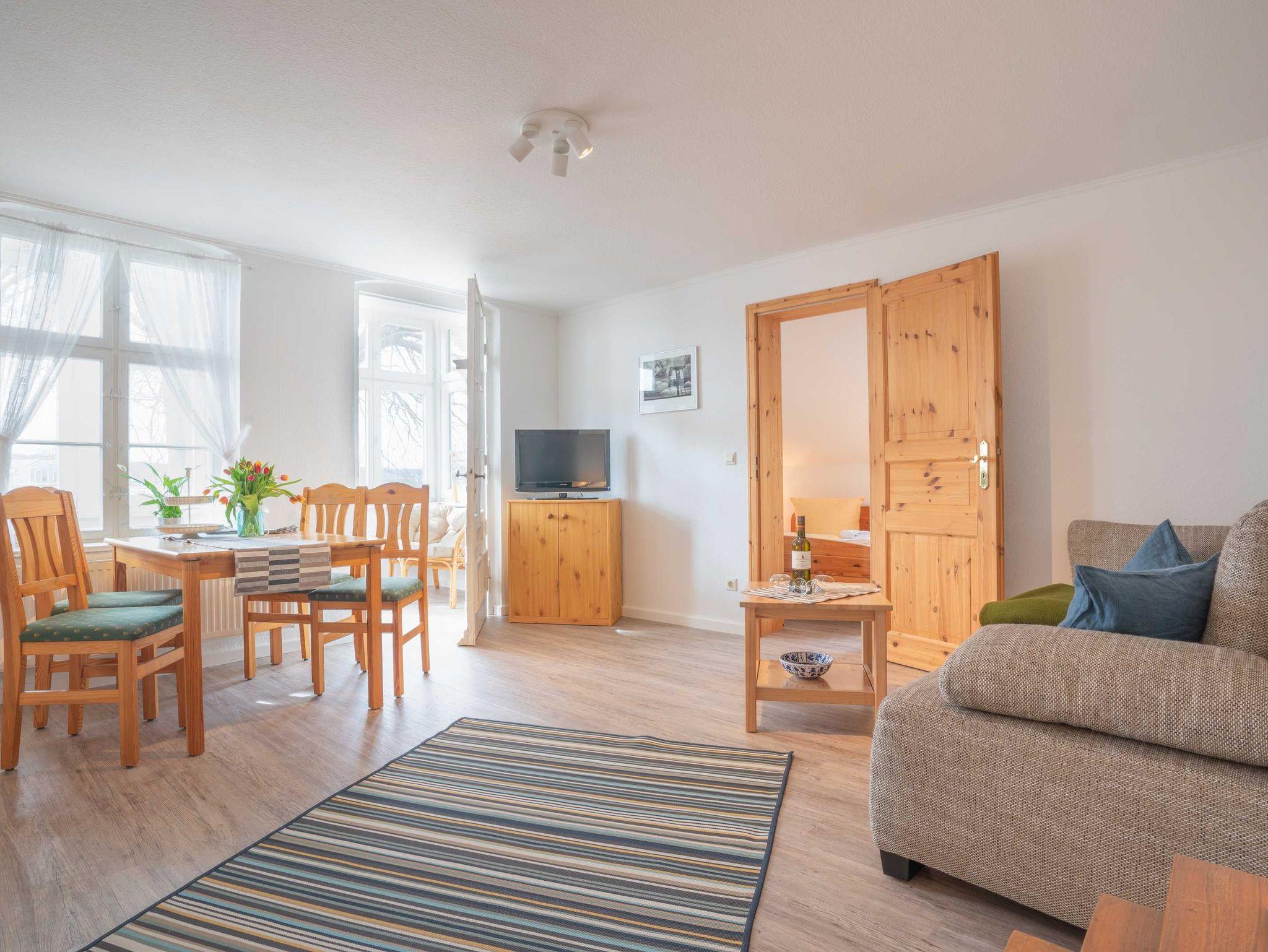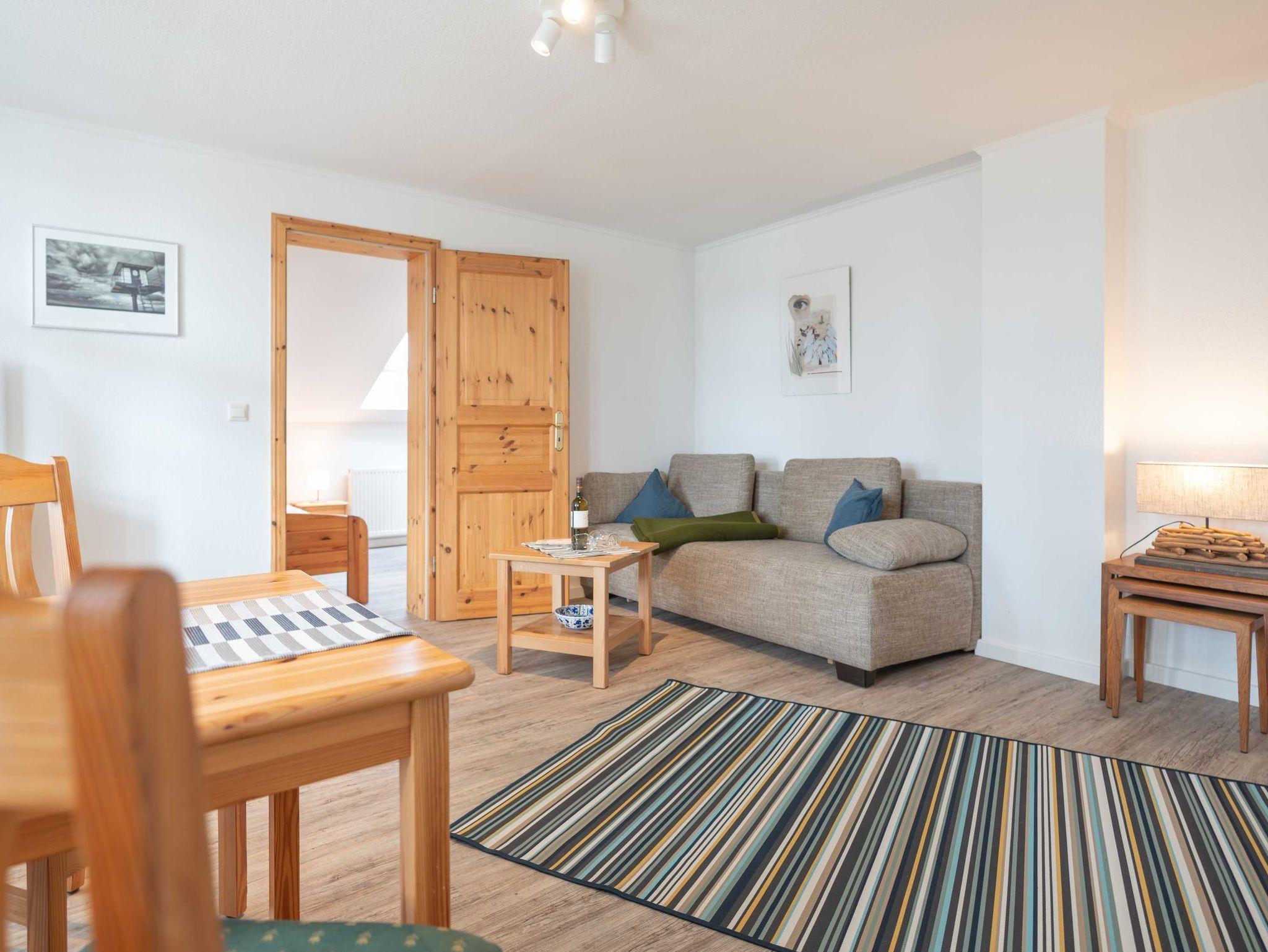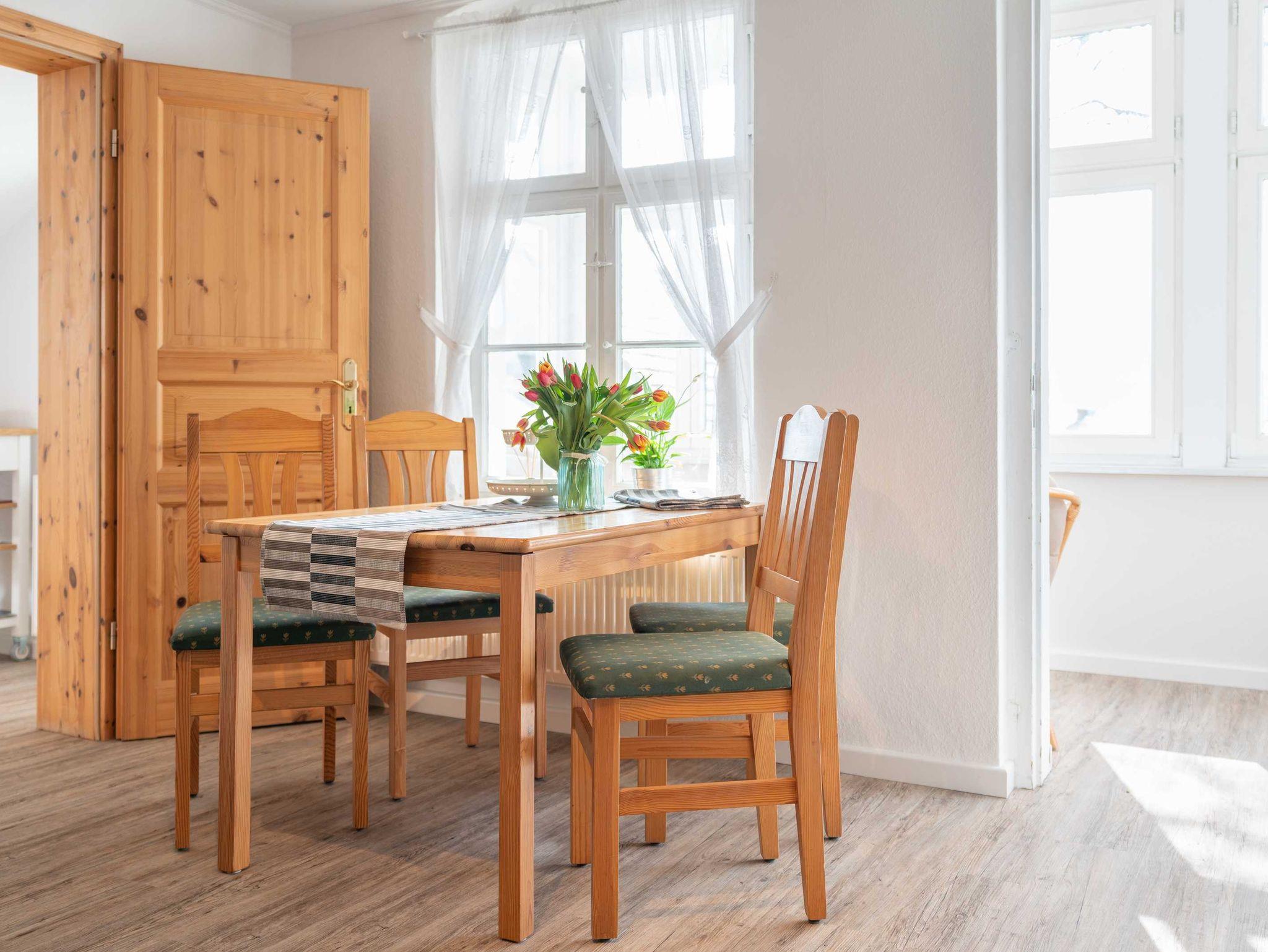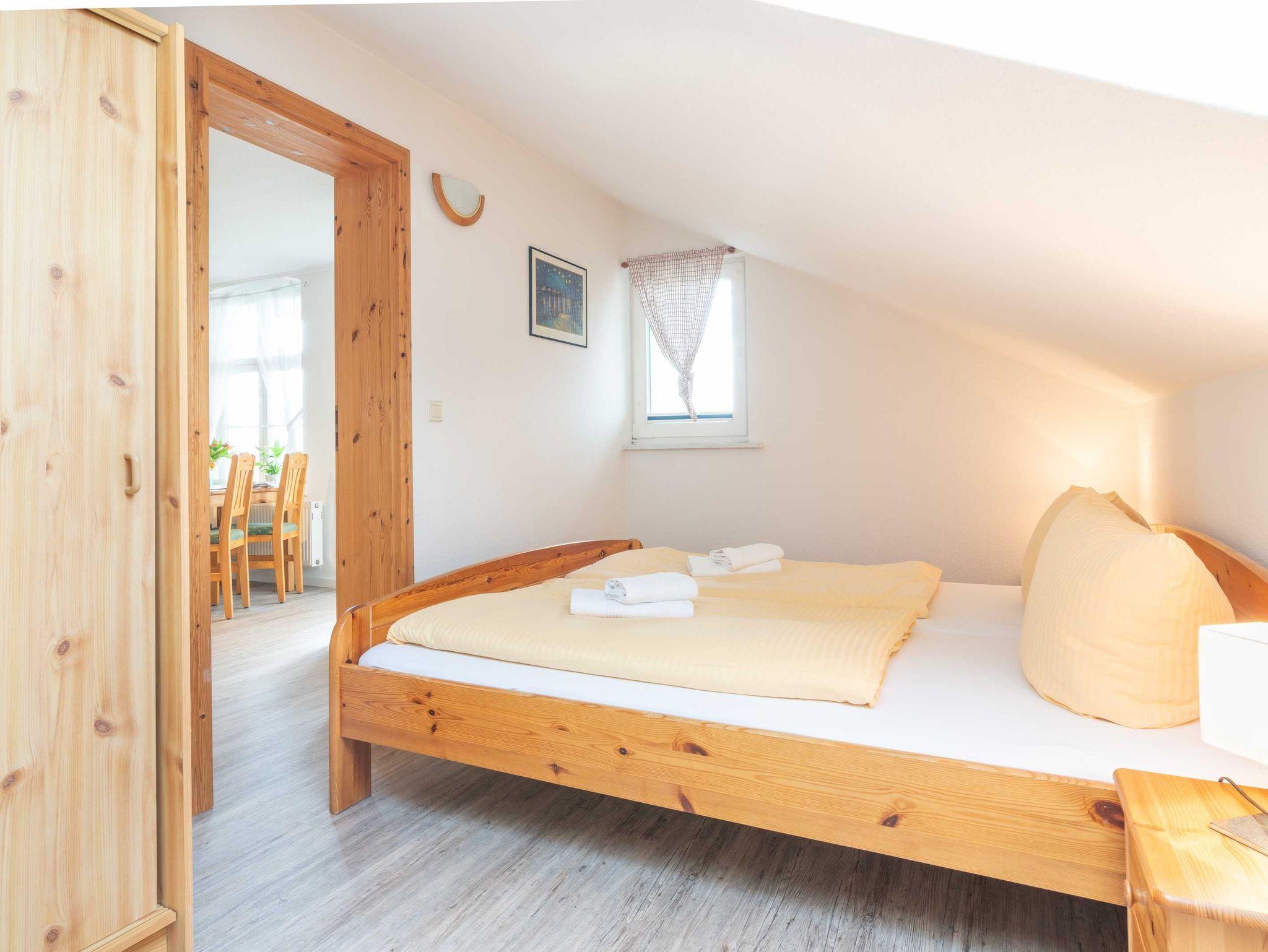 Die 42 qm große Ferienwohnung 1 für bis zu 4 Personen befindet sich im Dachgeschoss zur Landseite hin. Die verglaste Veranda (Wintergarten), liegt in Südrichtung mit Blickrichtung Hinterland und lädt zum Schmökern und Relaxen ein. Das Schlafzimmer verfügt über ein 180 cm breites Doppelbett, ergänzt um ein ausziehbares Schlafsofa (140 cm) im Wohnzimmer. Die Küche ist komplett ausgestattet. Ideal ist die Ferienwohnung für zwei Personen oder eine dreiköpfige Familie.