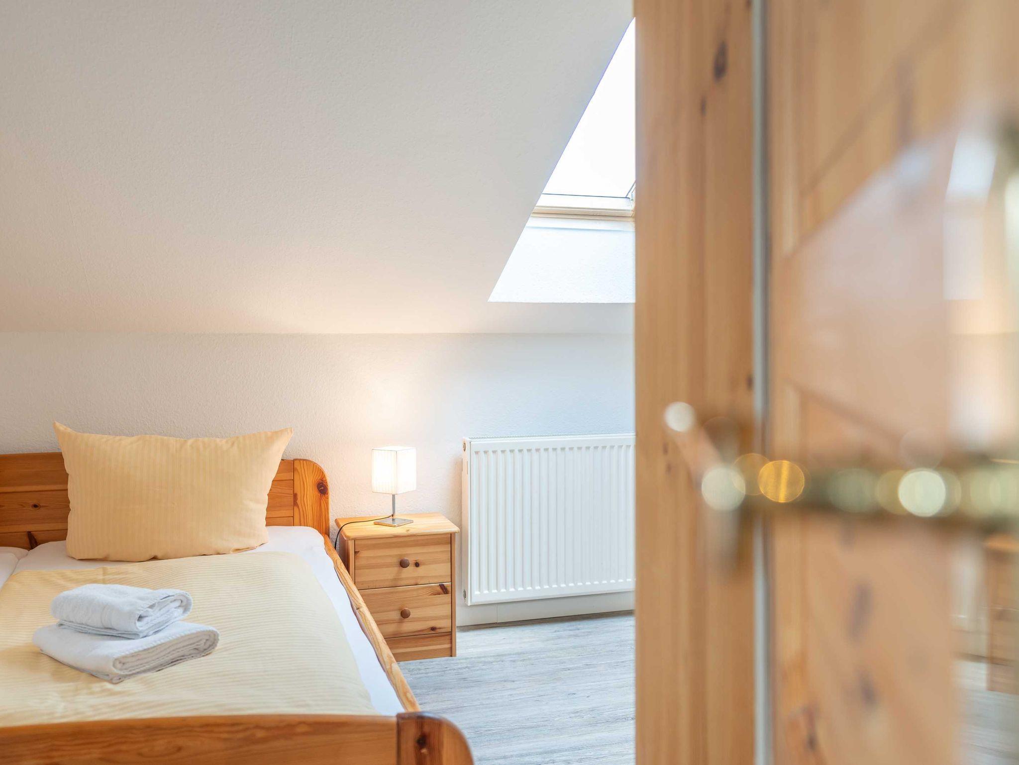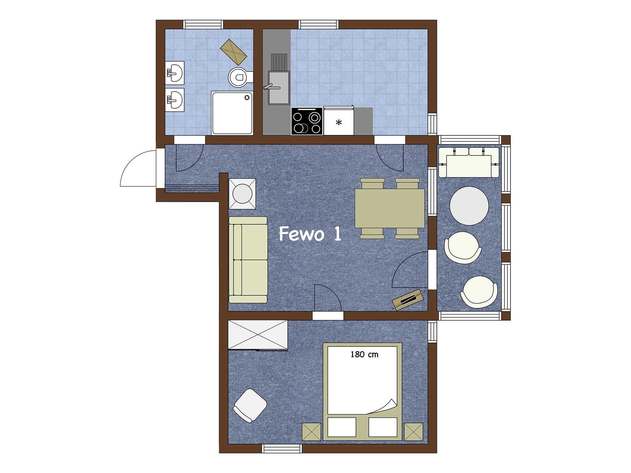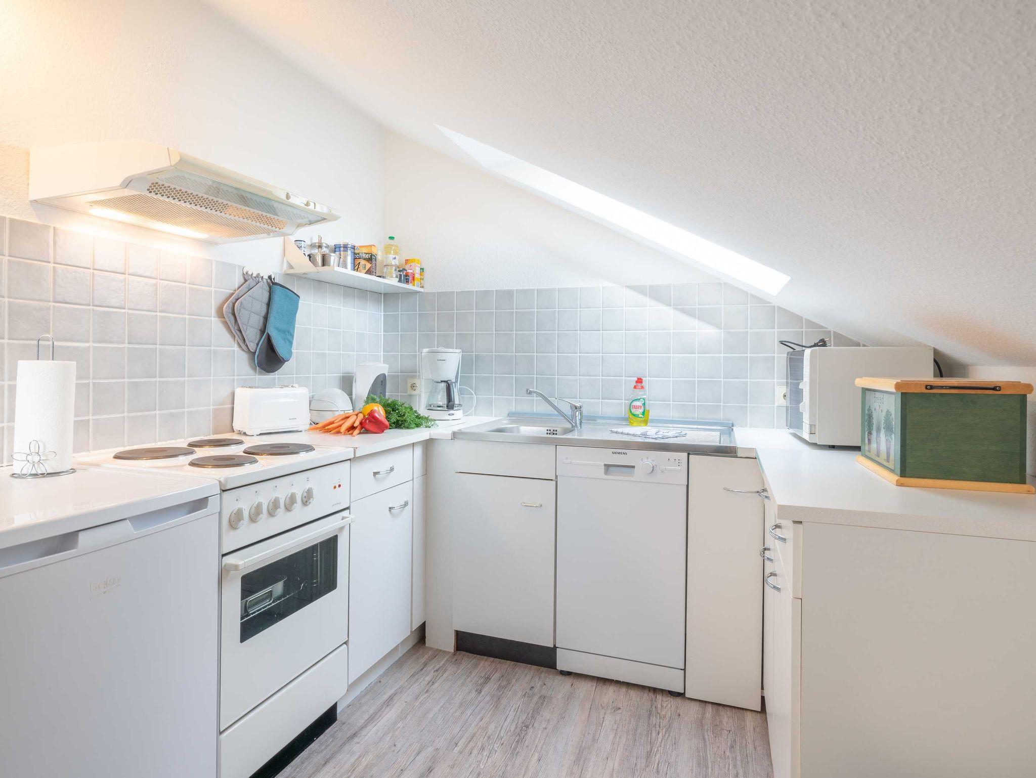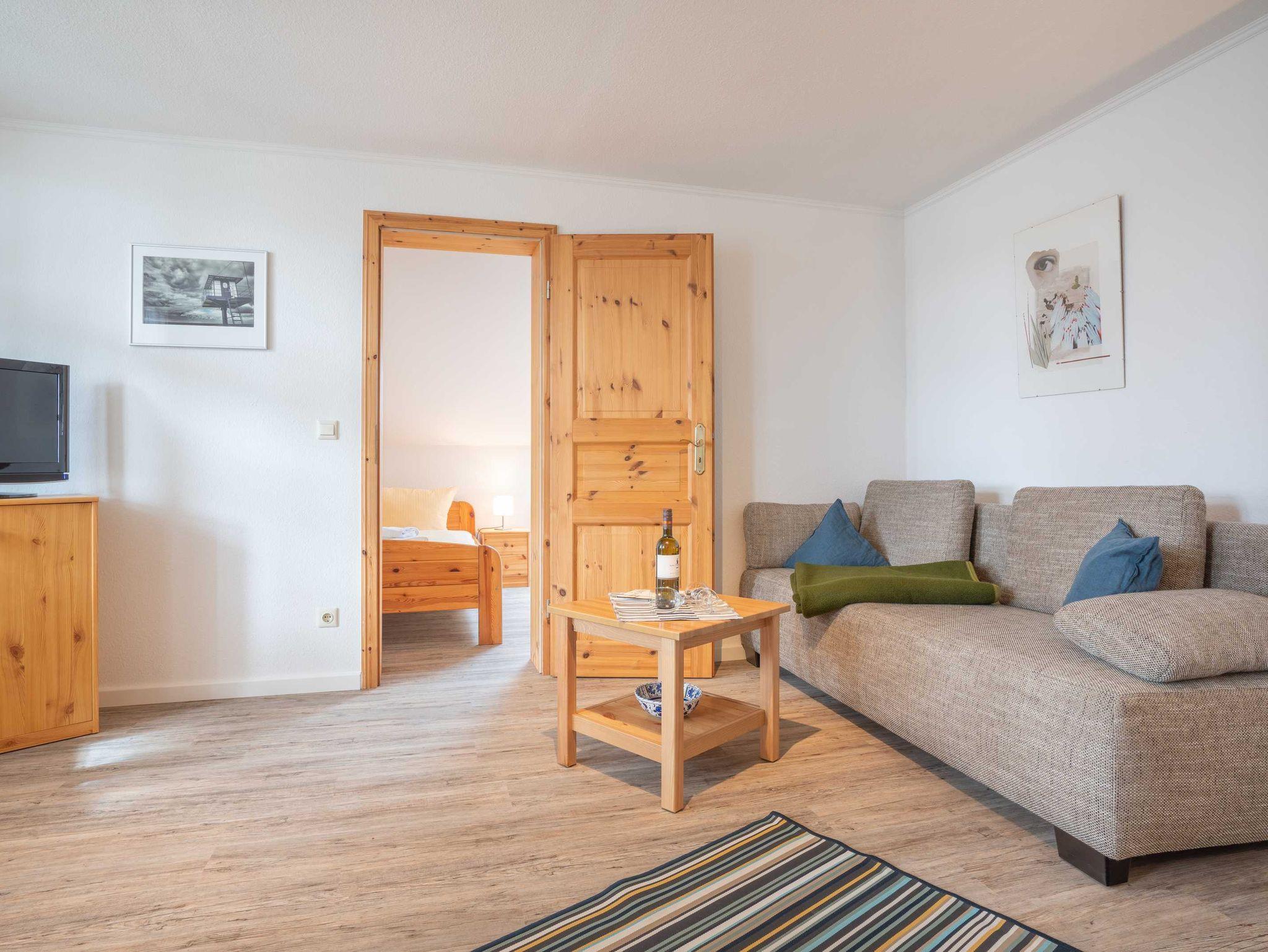 Die 42 qm große Ferienwohnung 1 für bis zu 4 Personen befindet sich im Dachgeschoss zur Landseite hin. Die verglaste Veranda (Wintergarten), liegt in Südrichtung mit Blickrichtung Hinterland und lädt zum Schmökern und Relaxen ein. Das Schlafzimmer verfügt über ein 180 cm breites Doppelbett, ergänzt um ein ausziehbares Schlafsofa (140 cm) im Wohnzimmer. Die Küche ist komplett ausgestattet. Ideal ist die Ferienwohnung für zwei Personen oder eine dreiköpfige Familie.