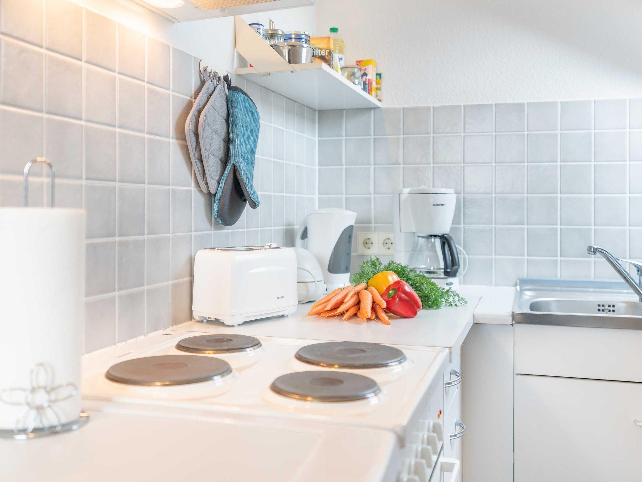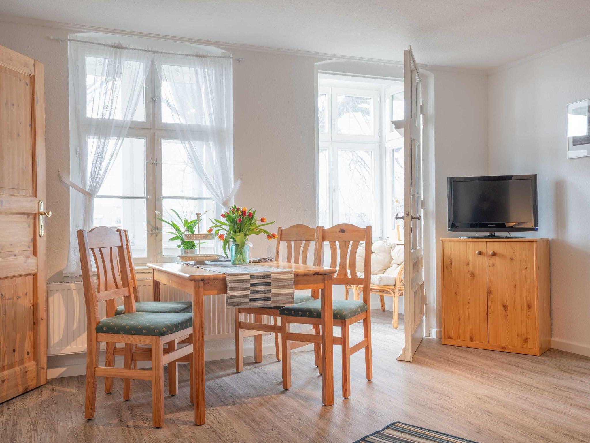 Die 42 qm große Ferienwohnung 1 für bis zu 4 Personen befindet sich im Dachgeschoss zur Landseite hin. Die verglaste Veranda (Wintergarten), liegt in Südrichtung mit Blick über den alten Ortskern und lädt zum Schmökern und Relaxen ein. Das Schlafzimmer verfügt über ein 180 cm breites Doppelbett, ergänzt um ein ausziehbares Schlafsofa (140 cm) im Wohnzimmer. Die funktionale Küche ist komplett ausgestattet. Ideal ist die Ferienwohnung für zwei Personen oder eine dreiköpfige Familie.