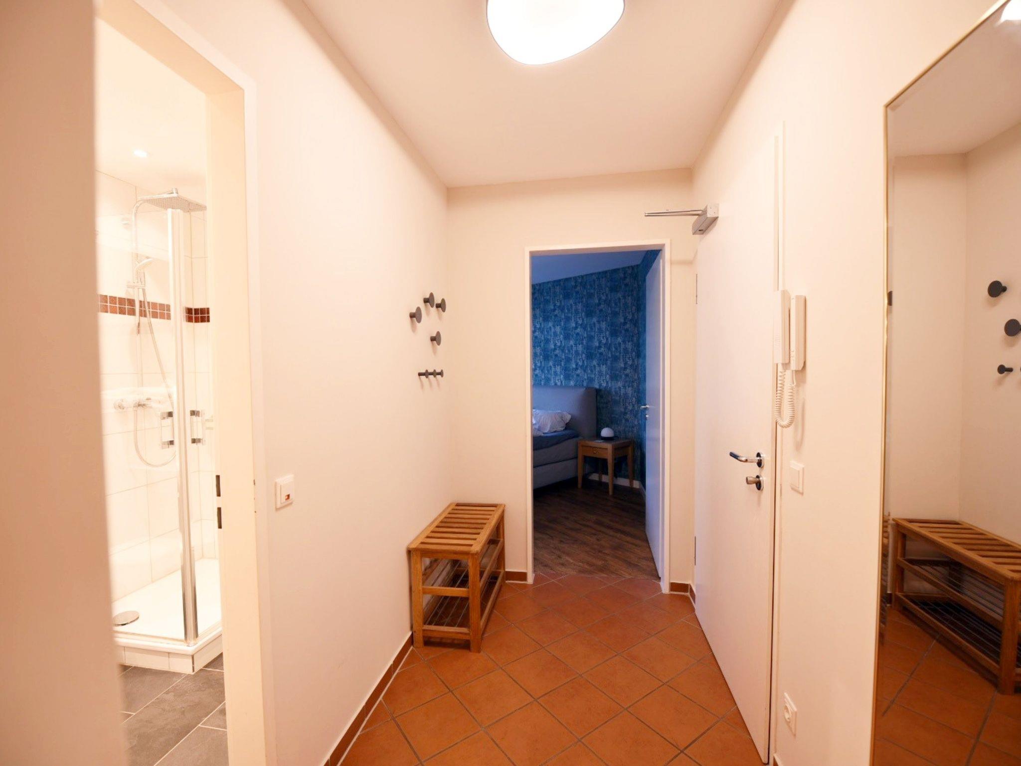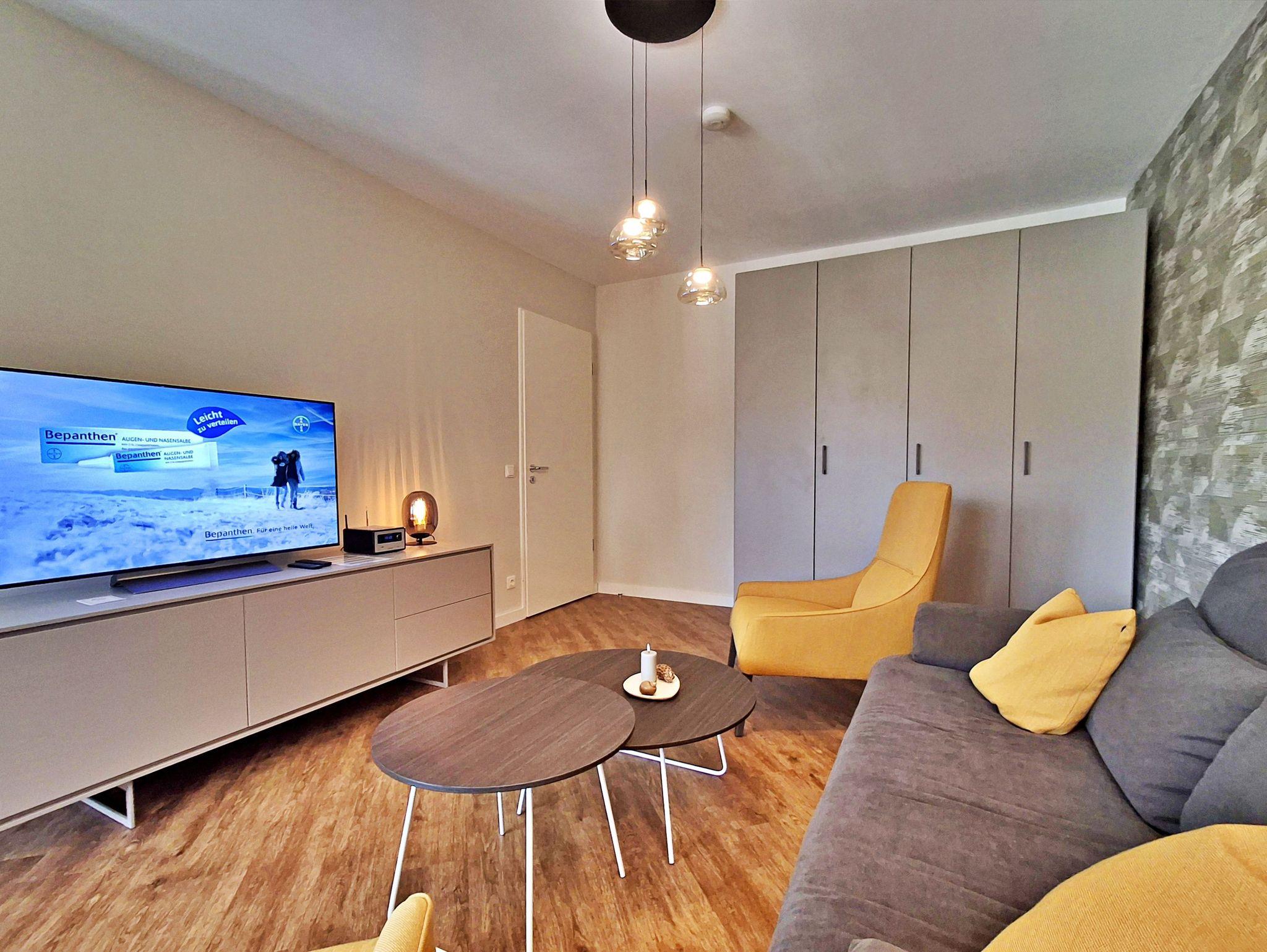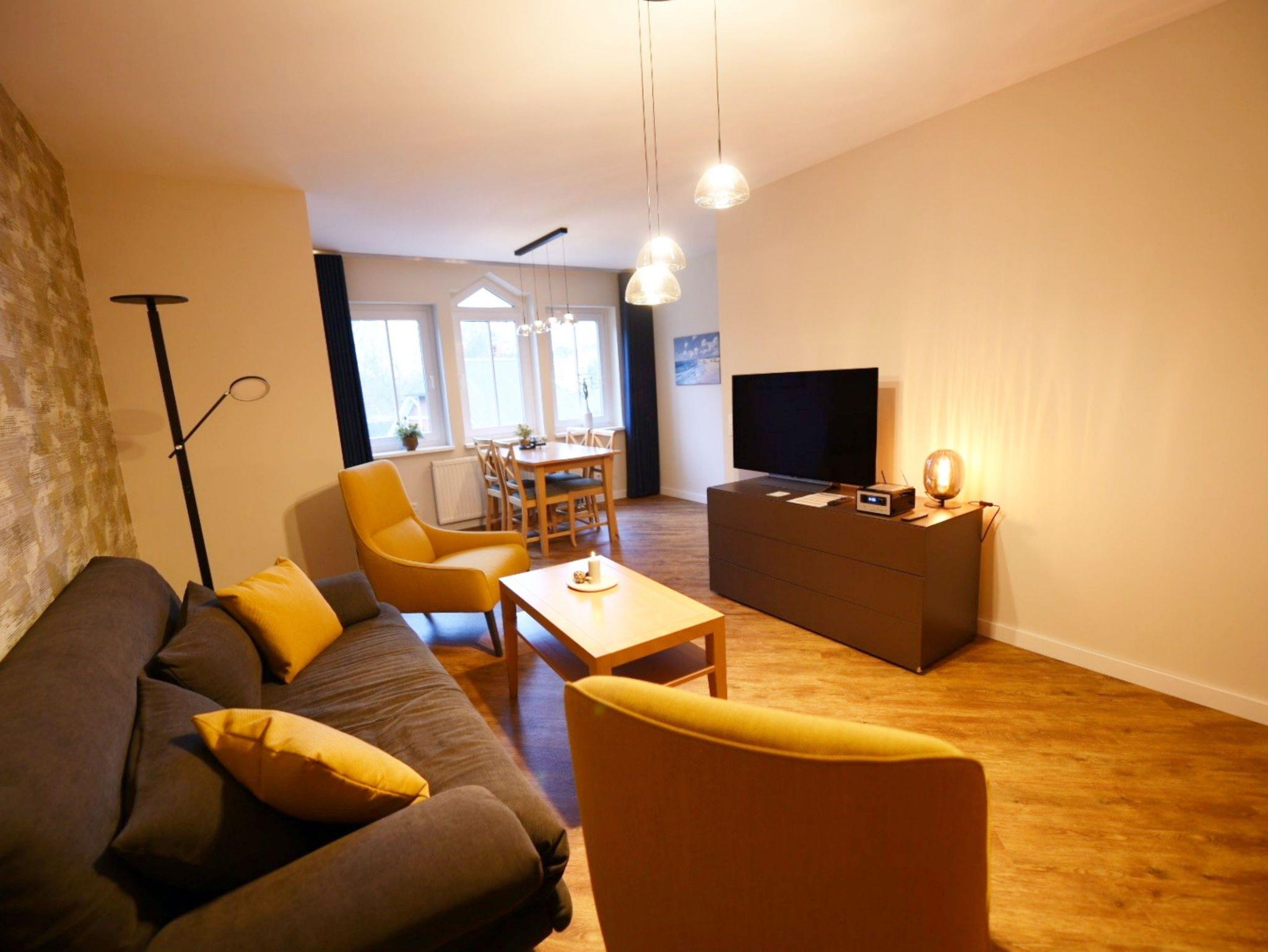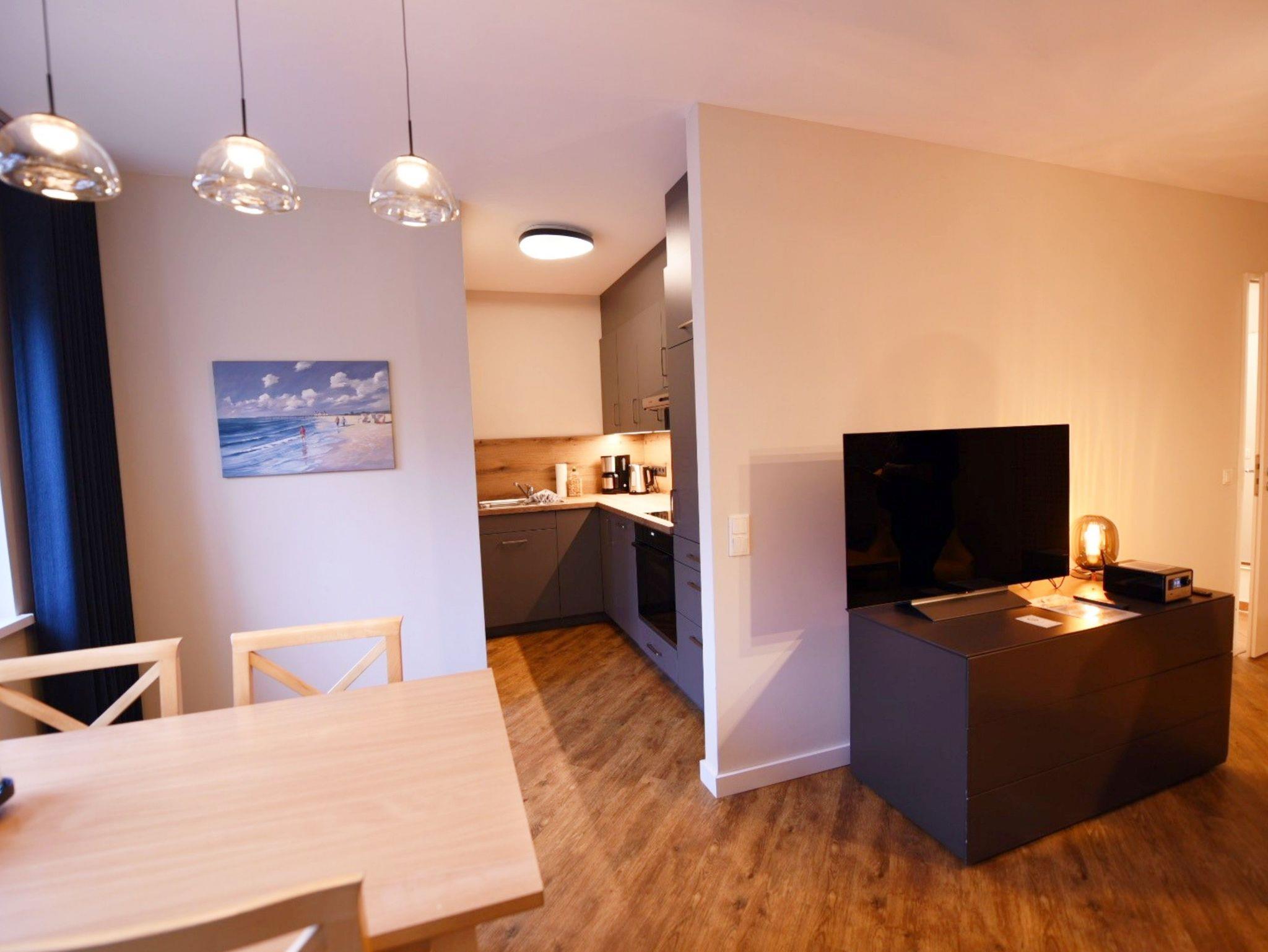 Die 48 qm große 2-Raum-Ferienwohnung befindet sich im 2. OG (West-Lage) der Appartementanlage und bis zu 4 Personen (zwei Erwachsene und zwei Kinder) können hier einen angenehmen Urlaub verbringen. Die Wohnung verfügt über ein Wohnzimmer mit Couch, welche auch zum Schlafen geeignet ist, Sessel sowie einen Essbereich mit 4 Stühlen. Für die Unterhaltung sorgt ein Flachbild-TV mit einem umfangreichen TV-Paket und vielen digitalen Sendern (auch in HD), eine Stereo-Anlage und ein DVD-Player. Die vollständig ausgestattete Küchenzeile mit Ceranherd, Backofen, Kühlschrank mit Gefriermöglichkeit, Mikrowelle und Spülmaschine lässt keine Wünsche offen. Im gemütlichen Schlafzimmer befindet sich ein Doppelbett und ein zweiter Flachbild-TV. Das Bad ist mit Dusche/WC, Haarfön und Kosmetikspiegel ausgestattet. Der Tiefgaragenstellplatz ist im Preis enthalten.
