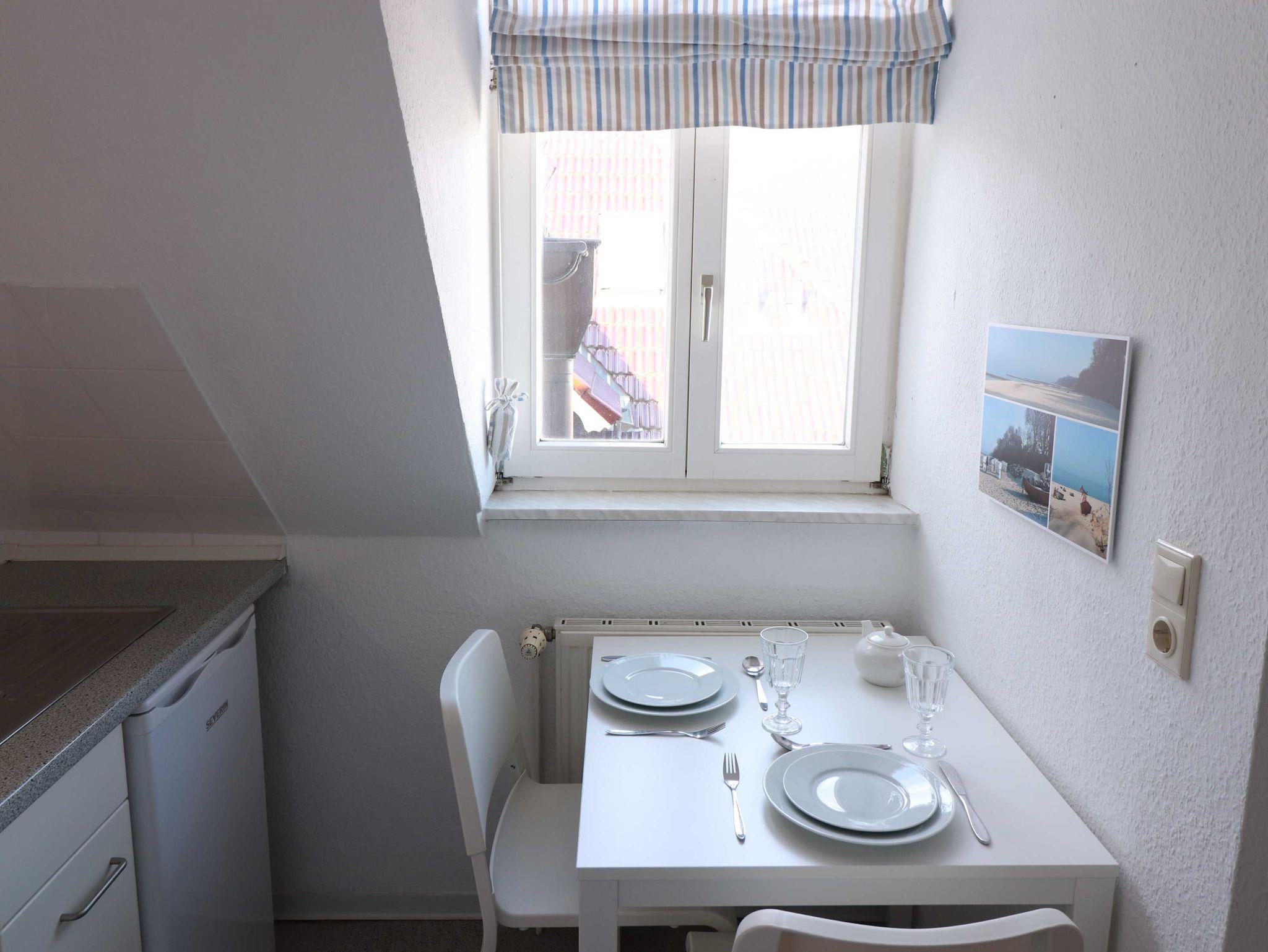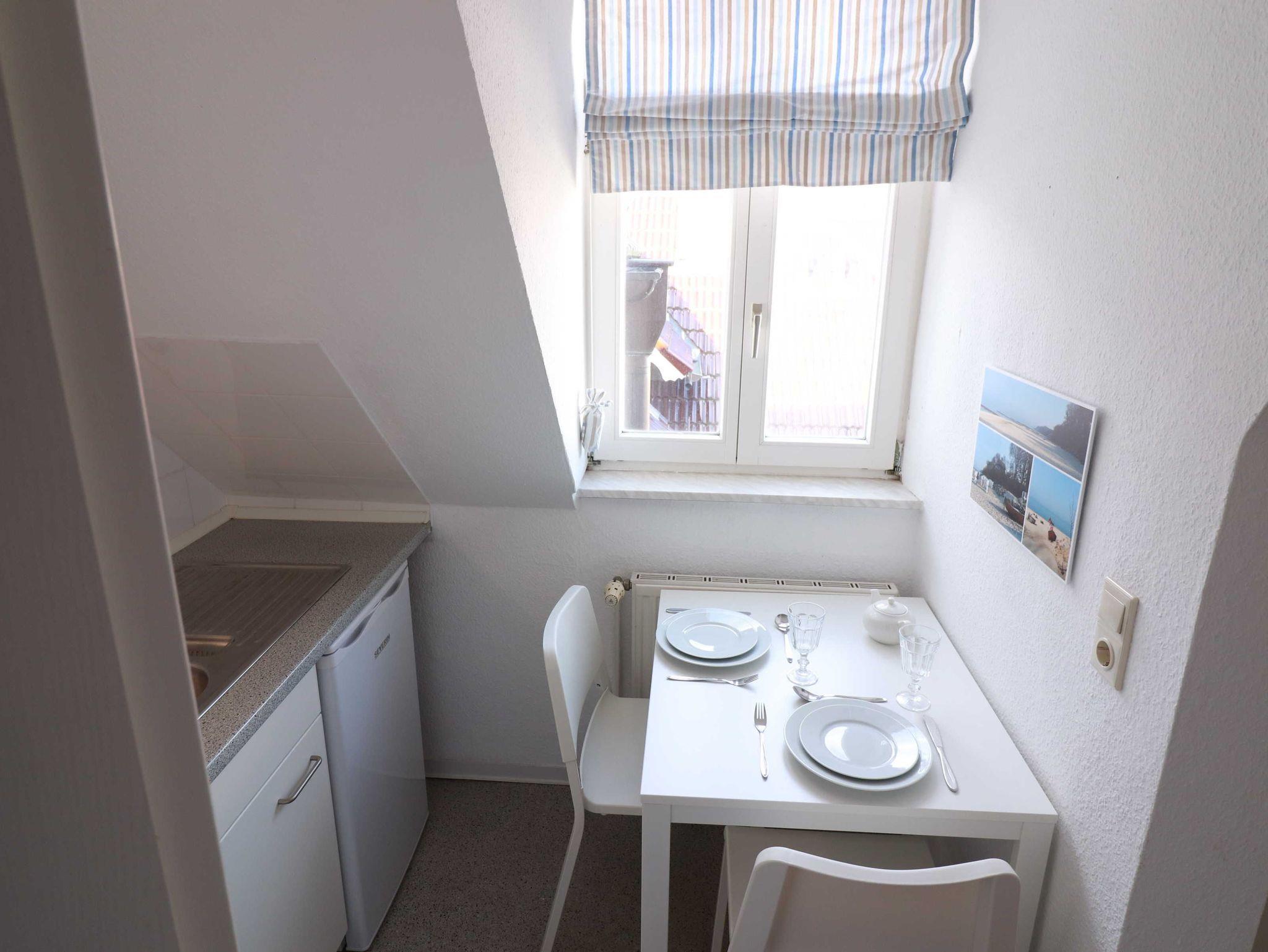Untern den verspielten Türmen auf den Dachgauben bietet das Türmchenzimmer bequemen Platz für zwei Personen. Abgetrennt von dem Wohnzimmer befinden sich das moderne Duschbad (Waschbecken, Dusche, WC) und die kleine Küchenzeile (Kochplatten, Kühlschrank, Spüle), in der einfache Gerichte problemlos zubereitet werden können.