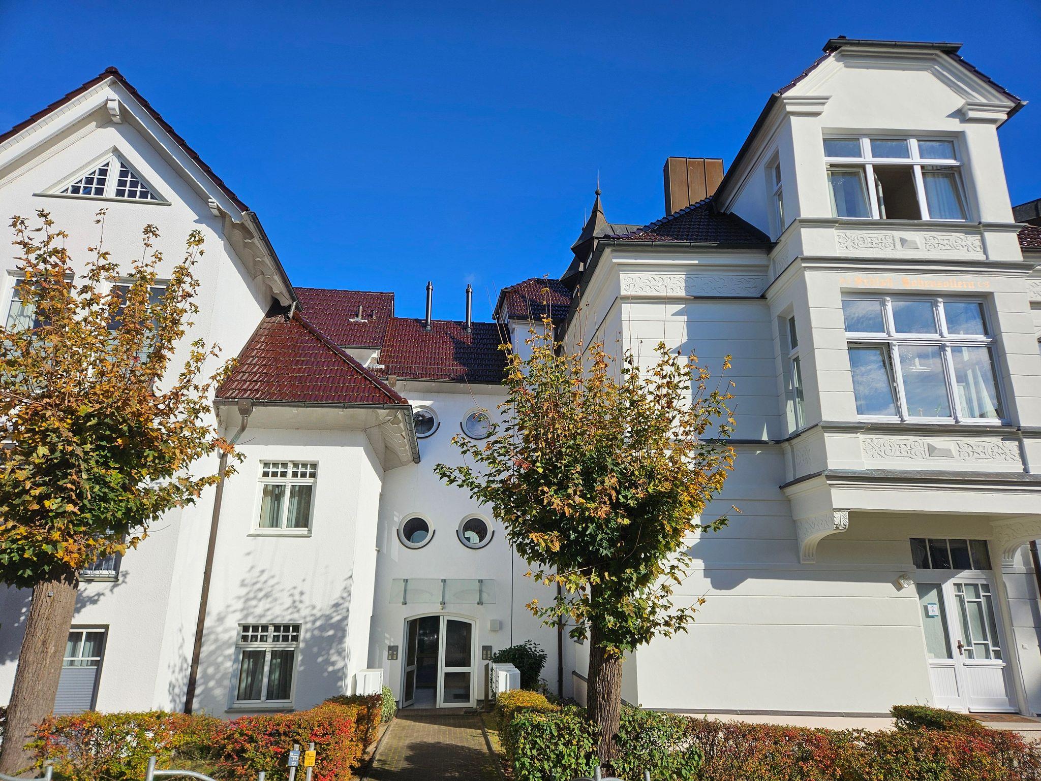 Das Türmchenzimmer befindet sich im zweiten Obergeschoß hinter der vornehmen Fassade von Schloß Hohenzollern, einer großen Bäderstilvilla mit mehreren Ferienwohnungen. Als größtes der drei Kaiserbäder ist Ahlbeck zwischen Heringsdorf und dem polnischen Swinemünde gelegen. Der Ort lockt mit seinem feinsandigem Ostseestrand, dem Postkartenmotiv der hölzernen Seebrücke und der Bäderstilpracht seiner Villen, Hotels und Appartements. An der längsten Strandpromenade Europas gelegen, bietet Ahlbeck seinen Gästen alles, was das Leben im Urlaub so schön macht: Zwischen Gastronomie mit höchsten Ansprüchen und Anbietern der schlichten pommerschen Küche ist alles vorhanden. Zahlreiche Bars und gemütliche Cafés laden zum Verweilen ein und in den vielen netten Einzelhandelsgeschäften kann man nach Herzenslust einkaufen.