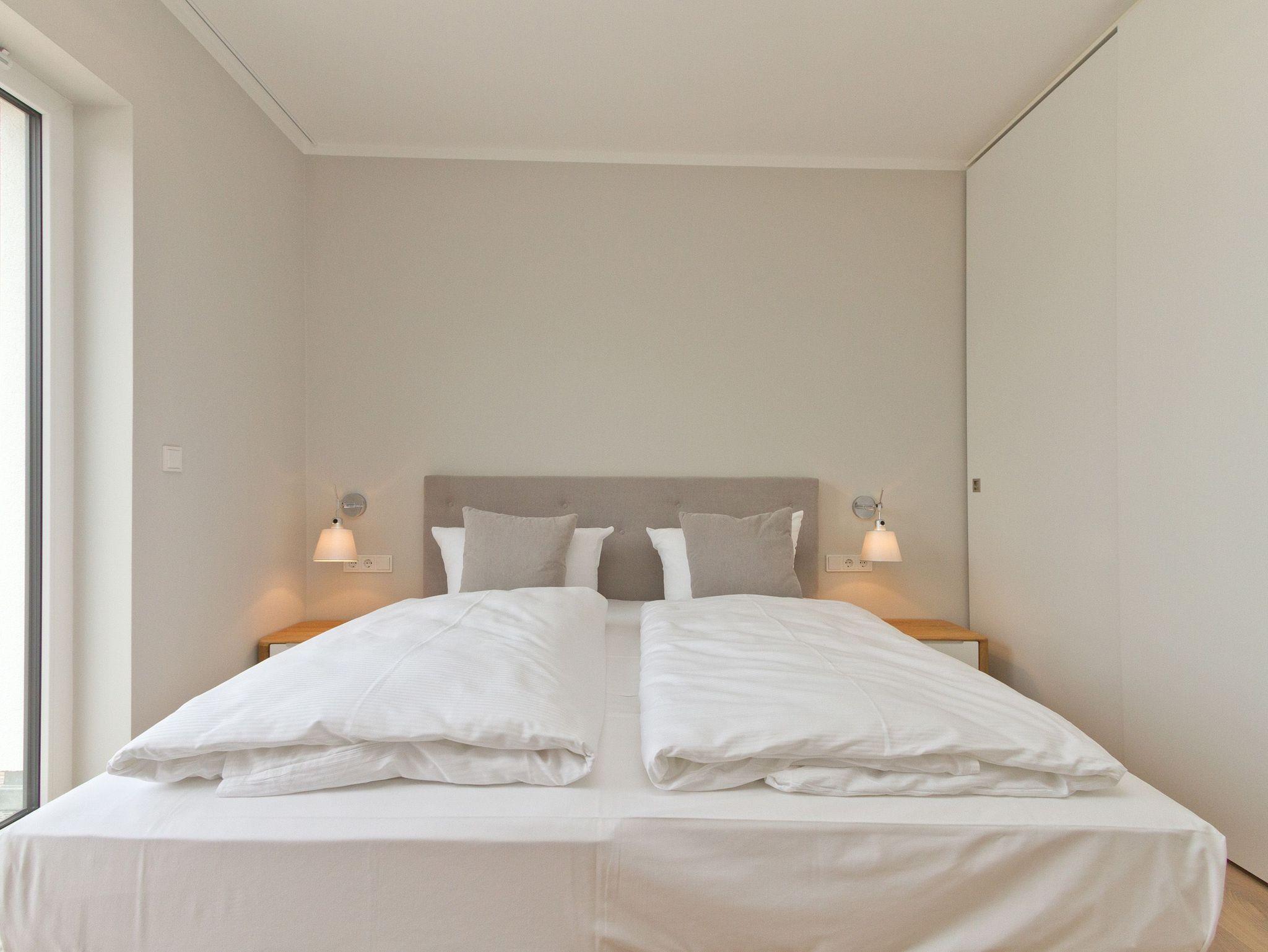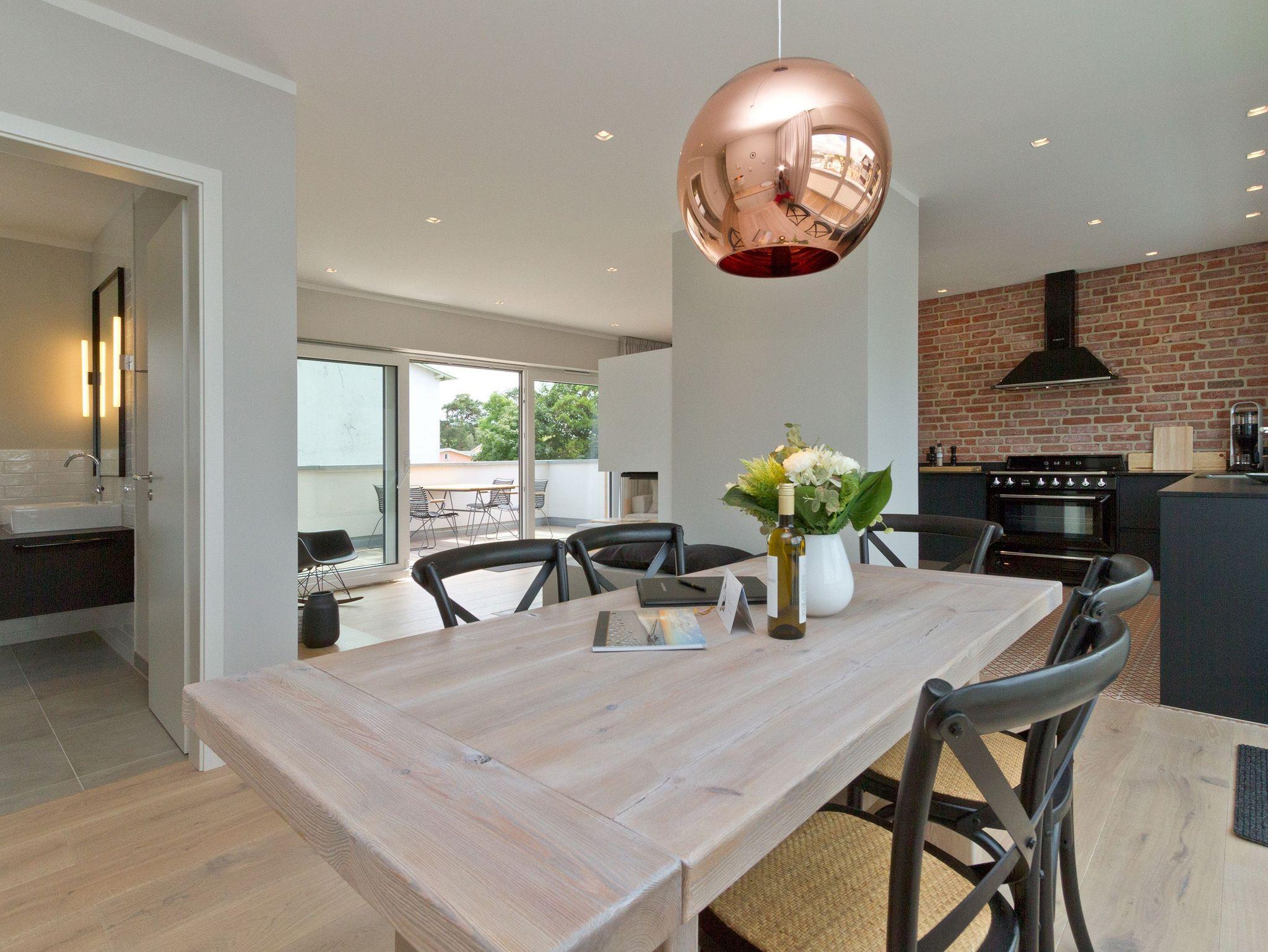 Ein Ahlbecker Quartier für Anspruchsvolle [&] Genießer! Unsere neue Penthousewohnung (3 Räume, 90 qm) wurde äußerst geschmackvoll und hochwertig von Interieur-Designern für Sie gestaltet. Die edle Farbgebung in Grautönen harmoniert perfekt mit rustikalen Steinwänden und mit der feinen Eichendielung. Die Möblierung wurde punktgenau umgesetzt: nichts ist zu viel, aber auch nichts zu wenig und wird durch zahlreiche Designerleuchten perfekt inszeniert. Mit dem Fahrstuhl gelangen Sie direkt in Ihr Domizil, in dem bis zu 4 Personen und ein Kleinkind (bis 3 Jahre im Babyreisebett) urlauben können. Ihre eindrucksvolle Luxusküche mit Geräten der Firma smeg fügt sich stimmig in den großzügigen Wohn- und Essbereich ein und viele Fenster sorgen für eine lichtdurchflutete Wohlfühlatmosphäre. Die gemütliche Sitzgruppe umrandet von Flat-TV und einem schönen Kamin und der tolle Essplatz laden zum Beisammensein ein. Beide Schlafzimmer sind mit modernen Boxspringdoppelbetten (1,80x2,00m), komfortablen Einbauten und einem Flat TV ausgestattet. Ergänzt wird das Appartement von zwei stylischen Bädern, eins mit einer Sauna, die nicht nur in der kalten Jahreszeit ein besonderes Highlight ist. Auch draußen ist es schön, denn zwei sonnige Dachterrassen (vom Wohnbereich / Morgensonne bzw. von den 2 Schlafzimmern / Abendsonne) mit Sitzgruppe und Loungemöbel und zwei kleine Balkone (von der Küche und vom Bad aus) sorgen für Abwechslung. Von hier aus hat man einen wunderschönen Blick auf das Seebad und über die Dächer hinweg seitlichen Meerblick. Für Ihren Komfort sind die Betten bei der Anreise bezogen und Handtücher liegen bereit. Auf Wunsch stellen wir für unsere kleinen Gäste ein Kinderreisebett und einen Kinderhochstuhl zur Verfügung. Der Pkw-Stellplatz (Nr. 5) befindet sich auf dem Grundstück. Das Wlan kann kostenfrei genutzt werden.