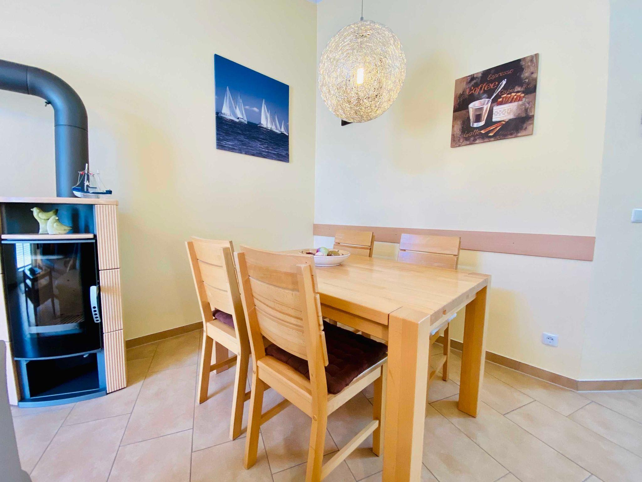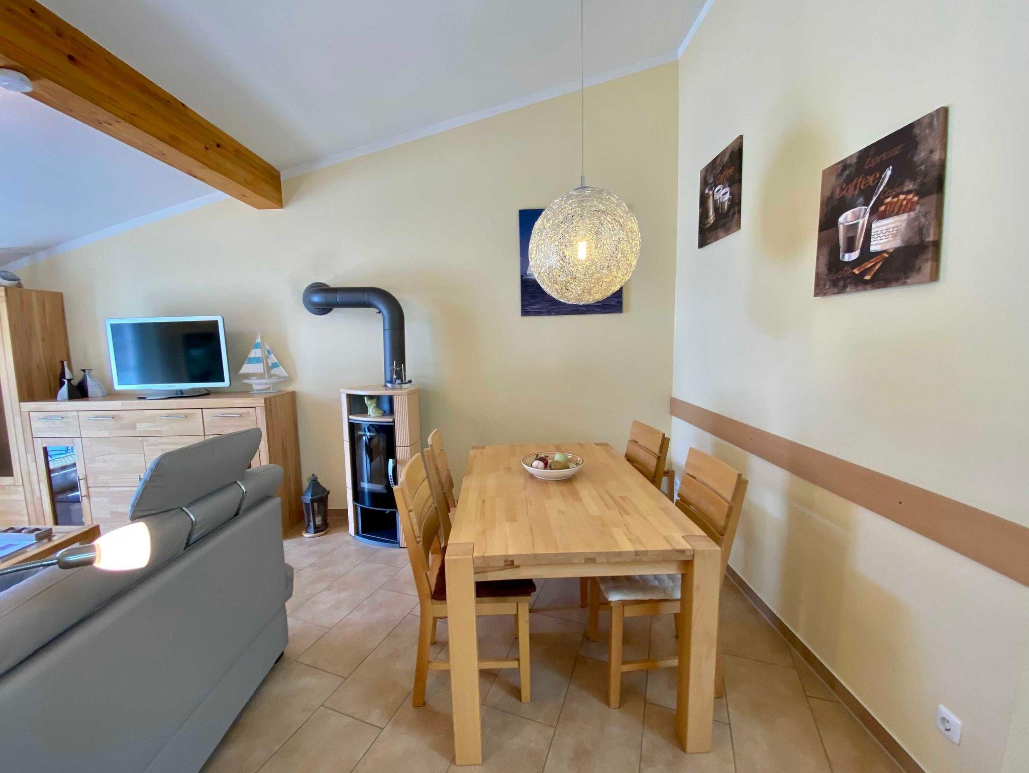 Die hochwertige Ferienwohnung befindet sich im 2. Obergeschoss eines neugebauten Appartementhauses und ist mit dem Fahrstuhl ereichbar. Das Wohnzimmer ist mit einer gemütlichen Eckcouch (Aufbettungsmöglichkeit),Flat-TV, Radio, CD-Player und Kaminofen ausgestattet. Vom Wohnzimmer aus gelangt man auf den möblierten Balkon zur Ostseite, von dort aus können Sie eingeschränkten Meerblick genießen.