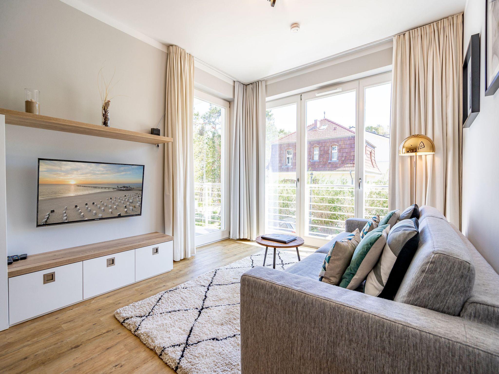 Modernes Apartment in Ahlbeck mit Meerblick, Balkon, Sauna und Strandnähe für erholsame Ostseeurlaubstage.